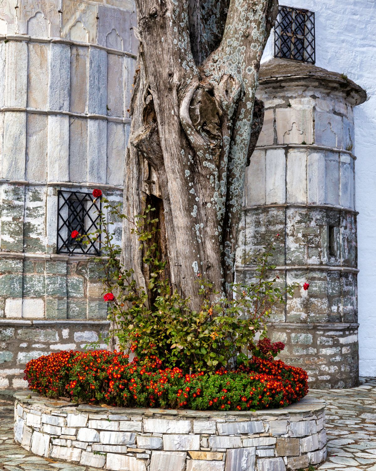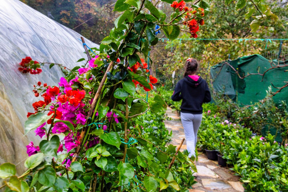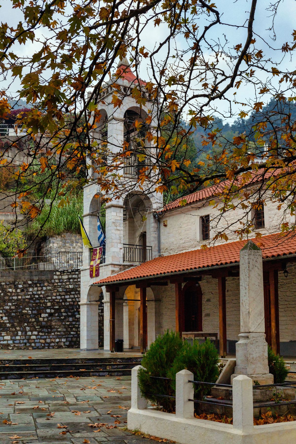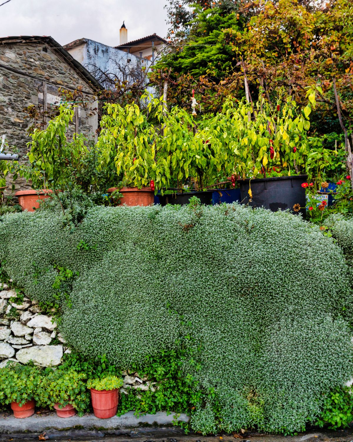Από τη μια γιγάντιες καρυδιές, πανύψηλα δέντρα με άλικους καρπούς, αυτά που λανθασμένα στις πόλεις ονομάζουμε γκι κι εδώ τα ξέρουν ως λιόπουρνα ή αρκουδοπούρναρα κι από την άλλη λουλούδια παντού, ένας χείμαρρος από κατιφέδες και χρυσάνθεμα, που αυτή την εποχή ξεπετάγεται από κάθε αυλή. Στα σπίτια της πλαγιάς με την παραδοσιακή αρχιτεκτονική και τη ζηλευτή θέα, οι καμινάδες αρχίζουν τα καπνίζουν και το τοπίο είναι μισοκρυμμένο στην ομίχλη.
