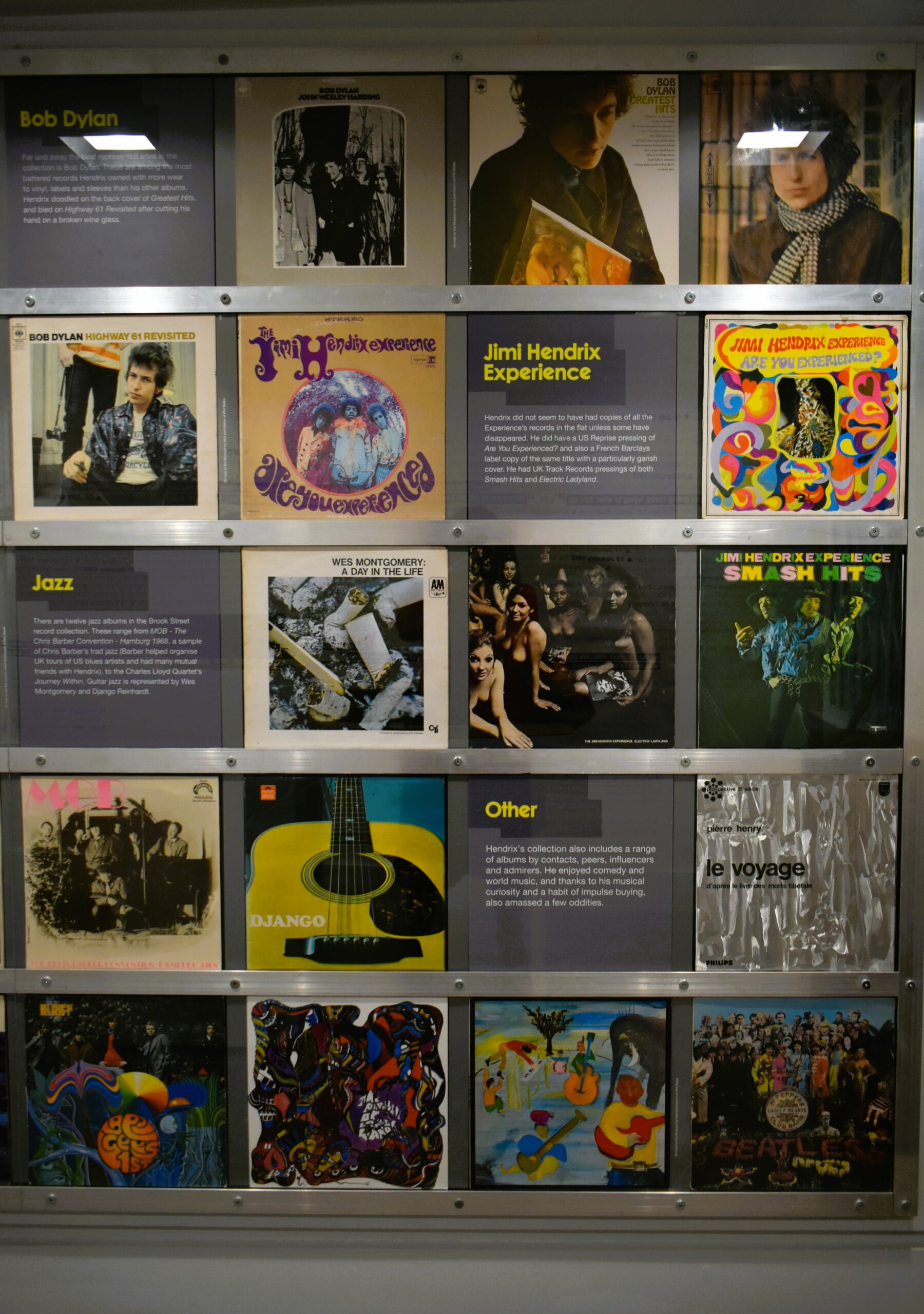 Μη χάσετε: το πλούσιο οπτικοακουστικό υλικό για την καριέρα του Τζίμι Χέντριξ και μέρος της συλλογής δίσκων του που εκτίθεται ξεχωριστά και περιλαμβάνει τα «Messiah» και «Water Music» του Χέντελ που είχε αγοράσει από το δισκοπωλείο One Stop Record Shop στην κοντινή South Molton Street.