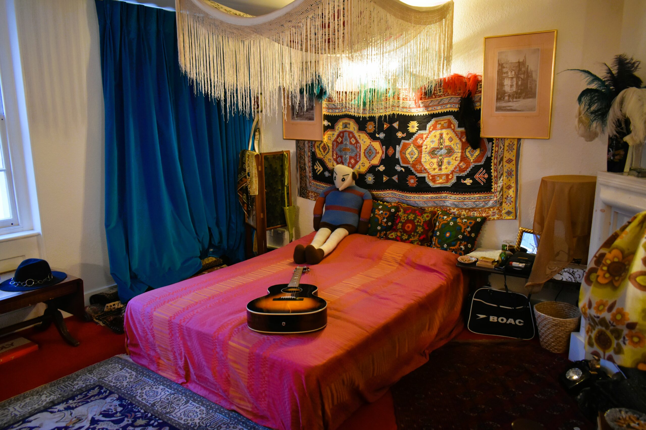Μπαίνοντας κανείς στο γεμάτο ζωηρά χρώματα υπνοδωμάτιο, που θεωρούσε καταφύγιό του και ζούσε με τη σύντροφό του Κathy, μεταφέρεται απευθείας στα ‘70s, χάρη στην πιστή αναβίωση του χώρου, όπως φαίνεται από φωτογραφίες και προβολές συνεντεύξεων στις γύρω αίθουσες. Λεπτομέρειες όπως το μεταξωτό batik κιλίμι τοίχου, ένα κεντητό βικτωριανό σάλι με κρόσσια πάνω από το κρεβάτι, το ζωηρόχρωμο ριχτάρι όπου κάθονταν οι καλεσμένοι φίλοι κι ο ίδιος ο τραγουδιστής δίνοντας συνεντεύξεις, το ντουλάπι όπου φύλασσε τους στίχους του, τα περσικά χαλιά που αγόραζε από τη Bond St, το πικ απ, η Μονόπολη που αγαπούσε πολύ, η τηλεόραση -όπου παρακολουθούσε βρετανικά σίριαλ, ανάμεσά τους και το “Coronation Street”, που είχε ήδη αρχίσει να αποκτά φανατικό κοινό και κυρίως ο μεγάλος πλεχτός σκύλος -κούκλα που του χάρισε μια θαυμάστρια, ρίχνουν με τον τρόπο τους φως σε μια προσωπικότητα με διεθνές εκτόπισμα αλλά απλές καθημερινές συνήθειες.