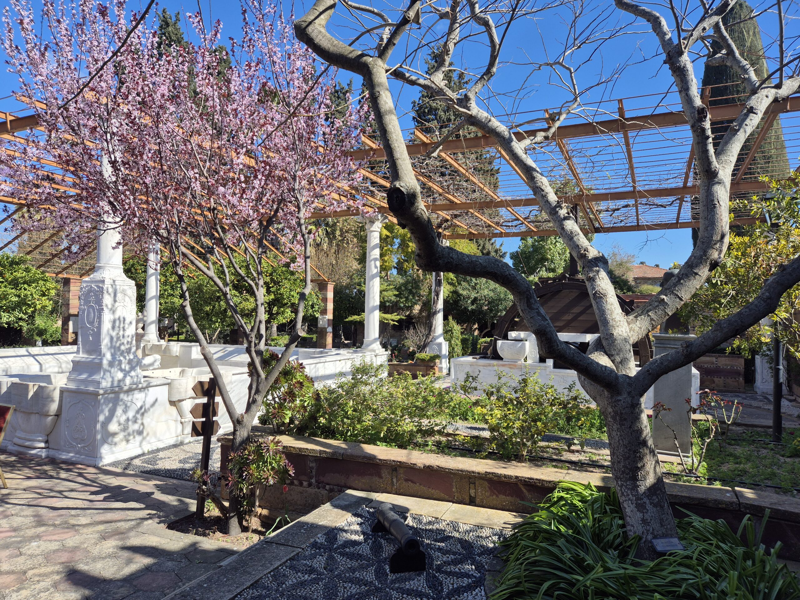 Από τα μαγγανοπήγαδα που διέθεταν απαραίτητα τα αρχοντόσπιτα της περιοχής -στη Χίο αποκαλούνται «μάγγανα»-, το Αργέντικο διέθετε δύο, μαρμαροστόλιστα όπως μαρμάρινη είναι και η στέρνα του. Μεταξύ τους, όπως κι ανάμεσα στα παρτέρια με τις τριανταφυλλιές, τα γιασεμιά και τους κατακόκκινους ανοιξιάτικους λαλάδες -οι τουλίπες της Χίου-, στα βοηθητικά κτήρια και στις αυλές, διατηρούνται οι βοτσαλωτοί διάδρομοι, αληθινά έργα τέχνης λευκών και μαύρων τόνων με γεωμετρικά και άλλα περίτεχνα σχέδια, που μάλιστα ποικίλαν αναλόγως του ποιοι τους διάβαιναν: πιο απλά για εκείνους που χρησιμοποιούσε το προσωπικό, πιο θεαματικά για τους ιδιοκτήτες και τους εκλεκτούς καλεσμένους τους. Και βέβαια, δεν έλειπε από κανένα αρχοντικό το ξεχωριστό κτήριο της αποθήκης, τόσο σημαντική που οι παλιοί Καμπούσιοι τονίζουν «πρώτα χτιζόταν η αποθήκη κι ύστερα το ίδιο το σπίτι», αποδεικνύοντας πως όλα κινούνταν γύρω από το εμπόριο πορτοκαλιών και μανταρινιών, όχι, βέβαια, μόνο στο Αργέντικο με τα συνολικά πέντε κτίσματα μέσα στο περιβόλι των 1.800 δέντρων του, αλλά και σε ολόκληρη την τόσο γόνιμη περιοχή.
