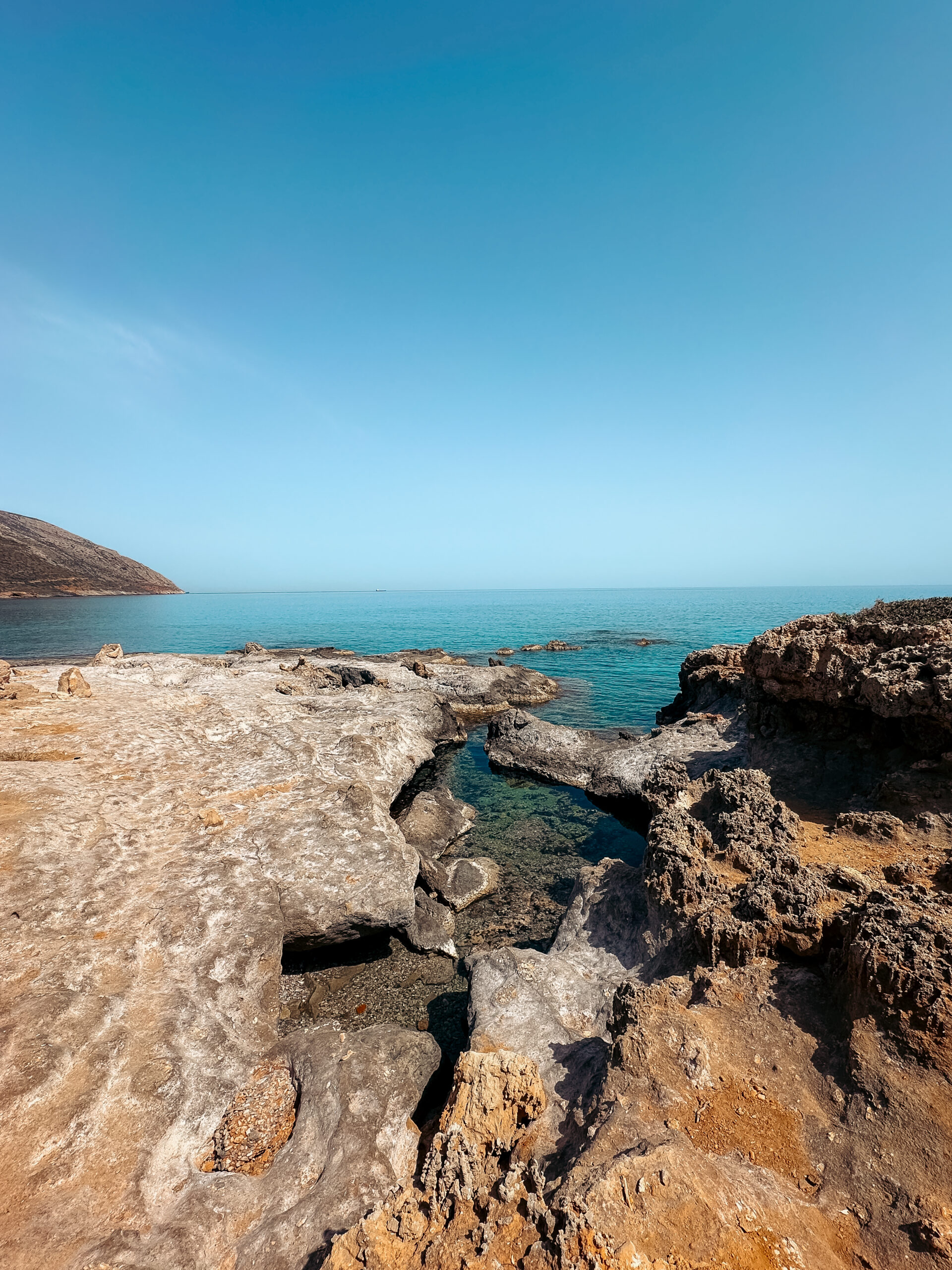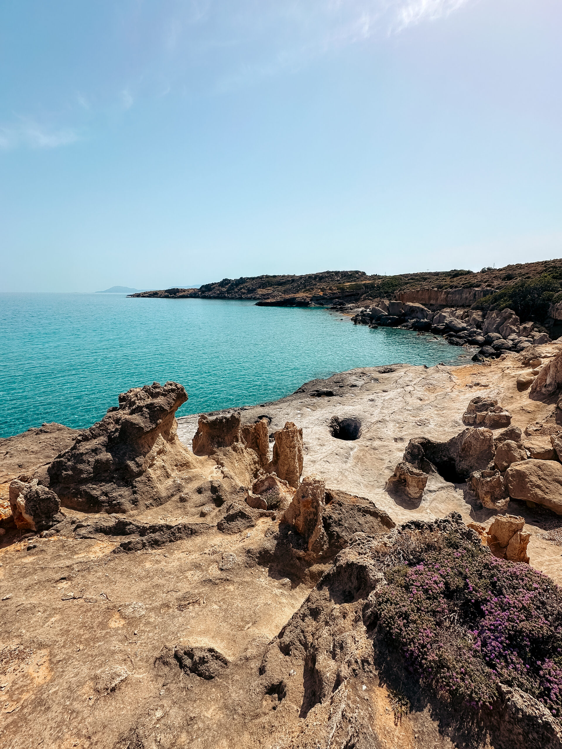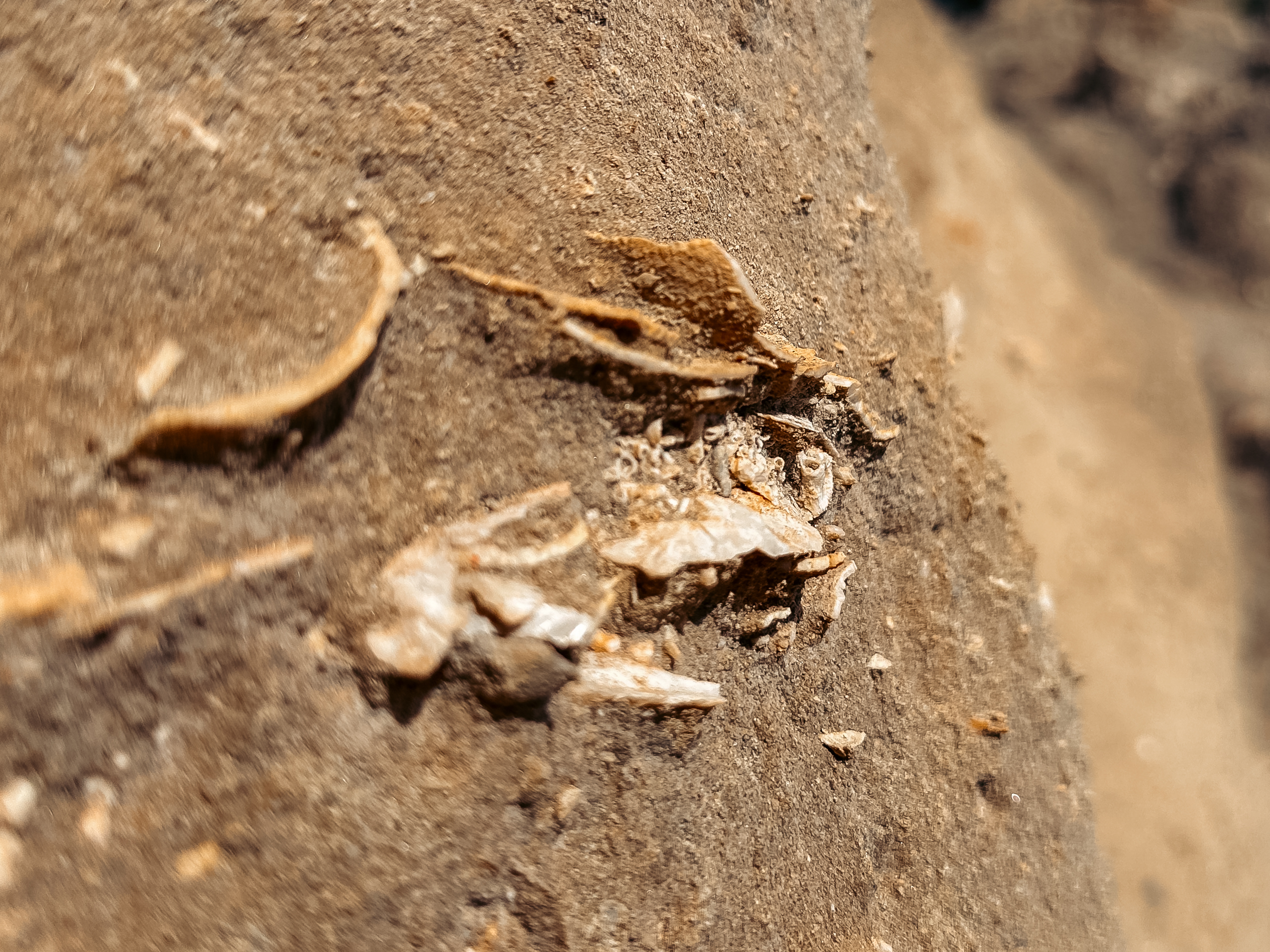 Φτάνοντας, αφήνουμε το αυτοκίνητο, κατεβαίνουμε και ξεκινάμε την εξερεύνηση. Λίγα λεπτά μετά χαθήκαμε μέσα σε αυτήν την περιπατητική διαδρομή. Αρχίσαμε να παρατηρούμε με κάθε λεπτομέρεια το περιβάλλον. Και σκεφτόμασταν ότι κάπως έτσι ίσως να μοιάζει το φεγγάρι. Οι επιφάνειες, γεμάτες με αποτυπώματα από χιλιάδες όστρακα και χτένια. Ψηλοί, απολιθωμένοι κορμοί και ρίζες φοινίκων ηλικίας εκατομμυρίων χρόνων πλαισίωναν το τοπίο.