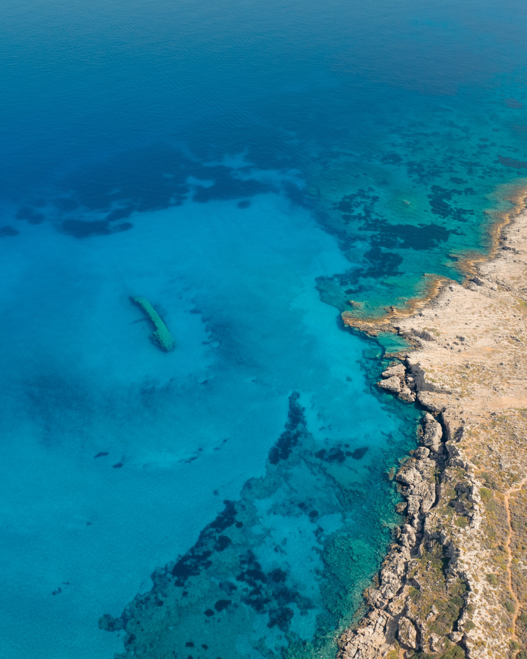 Όλη η παραλία ήταν ένα τεράστιο απολίθωμα. Ένα έργο της φύσης. Σταθήκαμε για λίγα λεπτά ακίνητοι, στον κόλπο της Αγίας Μαρίνας να χαζέψουμε την θέα. Μακριά, φάνηκε να υπάρχει μια σκιά στον βυθό της θάλασσας. Σηκώσαμε τα εναέρια μέσα, τα drone μας φυσικά, και τότε συνειδητοποιήσαμε ότι κάτι όντως υπάρχει εκεί. Κοιταχτήκαμε και πλέον ήταν βέβαιο το τι θα ακολουθούσε.