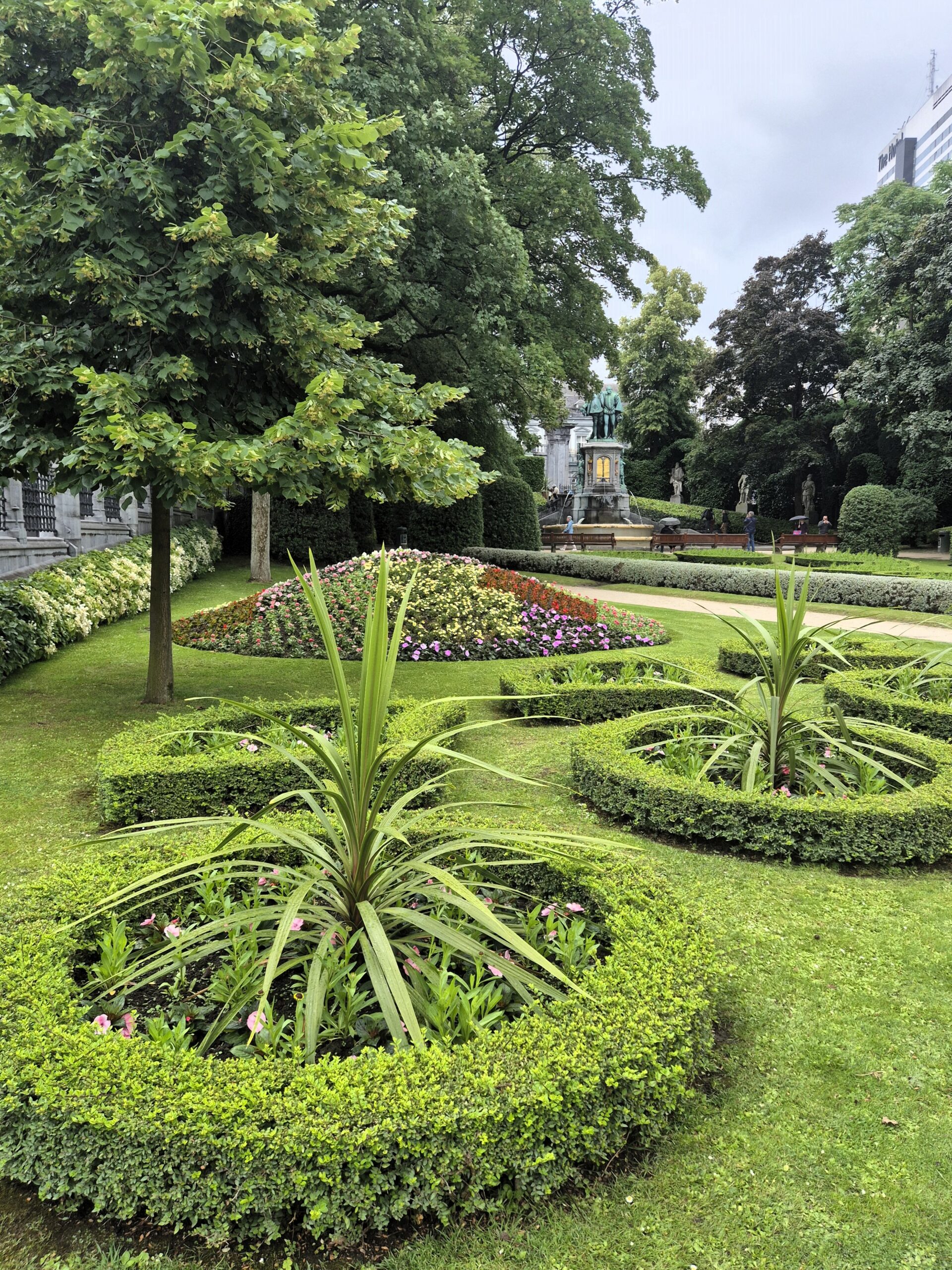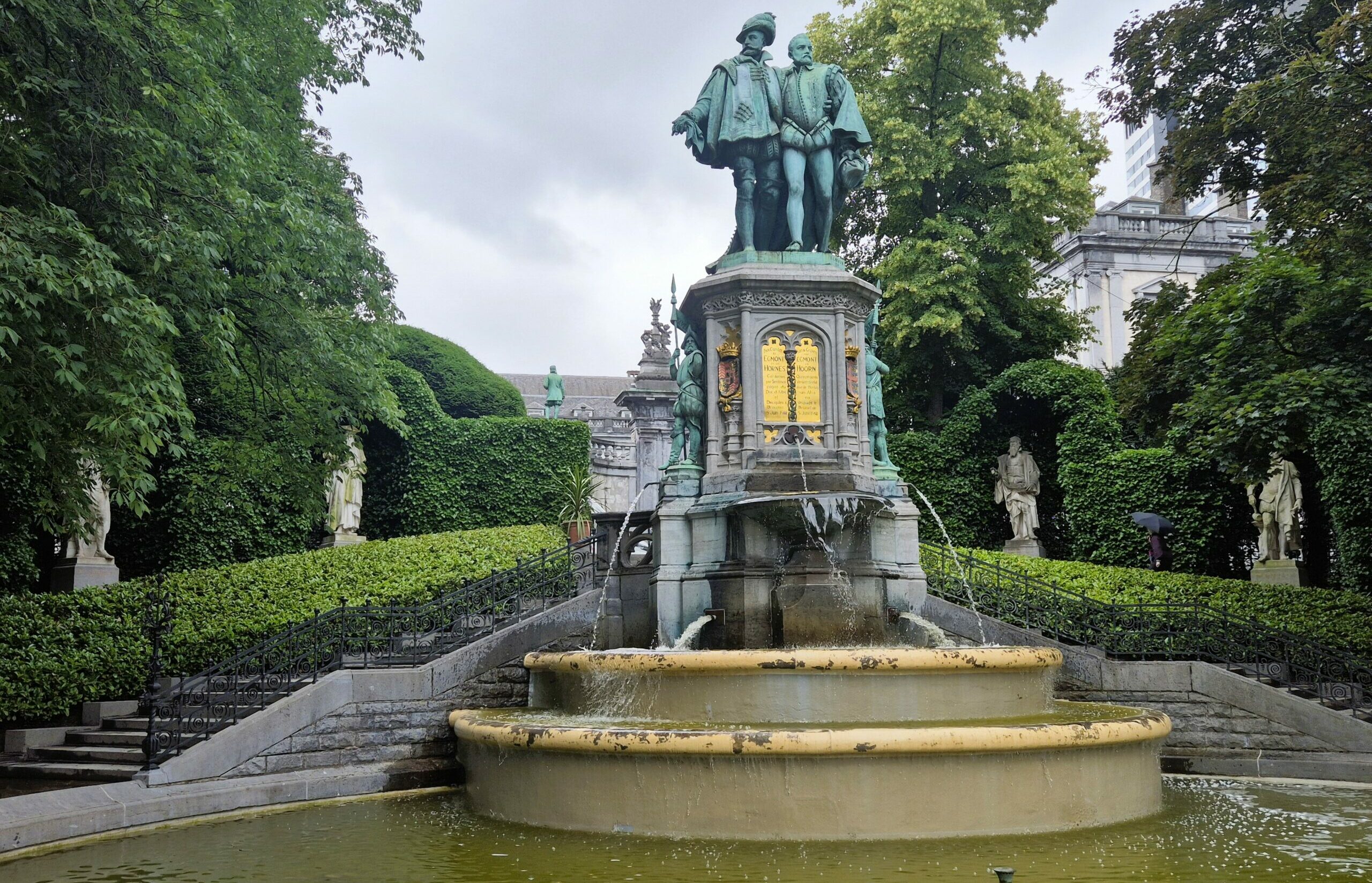 Ως επίκεντρο της πλατείας, ένα σύμπλεγμα μπρούτζινων αγαλμάτων ενσωματωμένο στο εντυπωσιακό σιντριβάνι στέκει σαν φόρος τιμής στους Κόμητες Egmont και Hoorne, τους δύο αντιστασιακούς που αντιτάχθηκαν στην ισπανική κατοχή του Φιλίππου Β΄ της Ισπανίας και αποκεφαλίστηκαν το 1568. Πέρα από τη γλυπτική που κυριαρχεί στη μικρή πλατεία, και η ίδια η ανθοκομική διαμόρφωση του κήπου κρύβει το συμβολισμό της: εννέα παρτέρια με λουλούδια και πυξάρια αντιπροσωπεύουν τις αντίστοιχες βελγικές επαρχίες της εποχής και ένα ακόμη, το βασίλειο ως σύνολο. Από το γαλήνιο περιβάλλον της Petit Sablon μπορείτε, ακολουθώντας τις δύο σειρές σκαλοπατιών, να βγείτε στην οδό Rue aux Laines, ώστε να συνεχίσετε προς το Πάρκο Egmont ή να επιστρέψετε στην Grand Place du Sablon, όπου σας περιμένουν άφθονες ακόμη ανακαλύψεις.