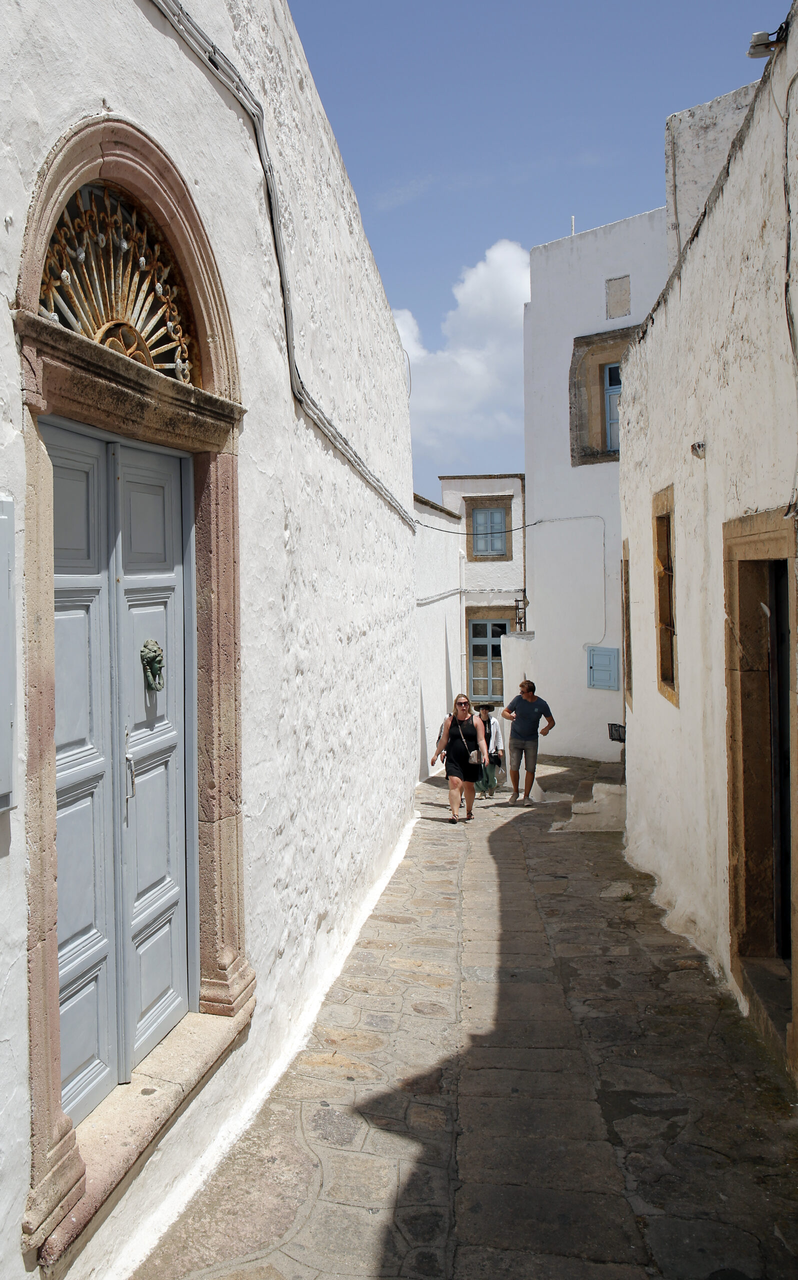 Ξεκινήστε από το Σταθμό, όπου παρκάρουν τα πούλμαν. Το κεντρικό καλντερίμι οδηγεί προς τη Μονή του Θεολόγου. Εκεί, θα δείτε μερικά θαυμάσια αρχοντικά, όπως του Βαρδίκου, της οικογένειας Βάλβη-Κουτσανέλλου, του Παλαιολόγου και στη συνέχεια του Φούντη, που οι ντόπιοι αποκαλούν «των Λεόντων», του Δώριζα και του Νικολαΐδη που έχει γίνει μουσείο. Η «Αστοιβή», καθώς και η «Στοά» είναι τμήματα ενός πολύ ονομαστού και μεγάλου αρχοντικού που έφτιαξε η οικογένεια Μαλανδράκη το 1673 και έχει πρόσοψη στην πλατεία της Αγίας Λεβιάς (ή Λεσβίας). Είναι επίκεντρο του οικισμού και εκεί έγραψαν τη δική τους ιστορία το παλιό καφενείο του Θανάση και η ταβέρνα του Βαγγέλη. Επίσης, θα δείτε το παλαιότερο αρχοντικό της Χώρας της Πάτμου, το Αρχοντικό Σημαντήρη.