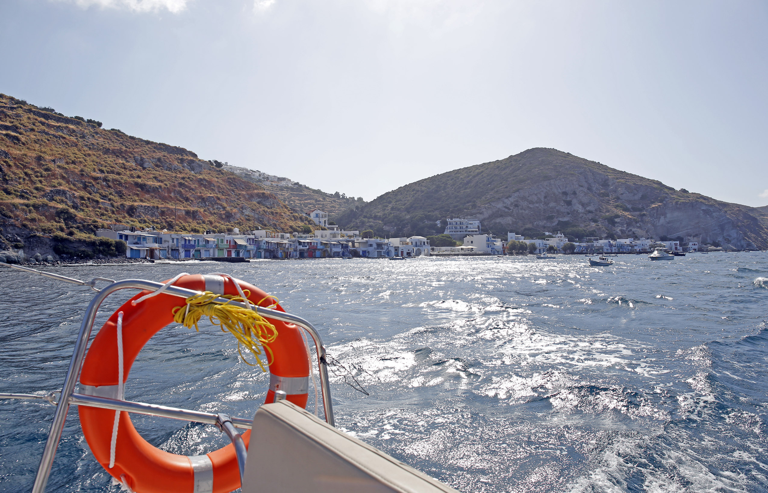 Ακολουθώ τη σήμανση προς Πολλώνια, στο βορειοανατολικό άκρο της Μήλου. Οι δρόμοι είναι καλοί, οι πινακίδες βρίσκονται στα σωστά σημεία, η κίνηση καθώς απομακρύνομαι από τον Αδάμαντα, έχει αρχίσει εμφανώς να μοιράζεται και να αραιώνει. Ο ανηφορικός δρόμος φανερώνει σε κάθε φουρκέτα και μια άλλη άποψη του Όρμου της Μήλου και του Αδάμαντα ο οποίος ενώνεται με το σκούρο μπλε της θάλασσας. Έχει ένα αιγαιοπελαγίτικο, θερμό βοριαδάκι, σήμα κατατεθέν του ελληνικού καλοκαιριού. Περιποιημένα καινούρια κτίρια, μάντρες επιχειρήσεων, βενζινάδικα αλλά και μεγαλύτερα σούπερ μάρκετ είναι τα τελευταία σημάδια σύγχρονης ζωής που αντικρύζω πριν πάρω την αριστερή στροφή για τα Μανδράκια, το θεατρικό, χρωματιστό ψαροχώρι, μόλις 5 χιλιόμετρα από το λιμάνι. Η αίσθηση αλλάζει άμεσα τη διάθεση, σαν ένα ταξίδι στο χρόνο, μια επίσκεψη στον παραδοσιακό τρόπο ζωής των Κυκλάδων, με το γραφικό λιμανάκι με τα «σύρματα», τα υπόσκαφα πάρκινγκ των ψαρόβαρκων, σήμα κατατεθέν της Μήλου, φυσικά δημιουργήματα της έντονης ηφαιστειακής κατασκευής του εδάφους.