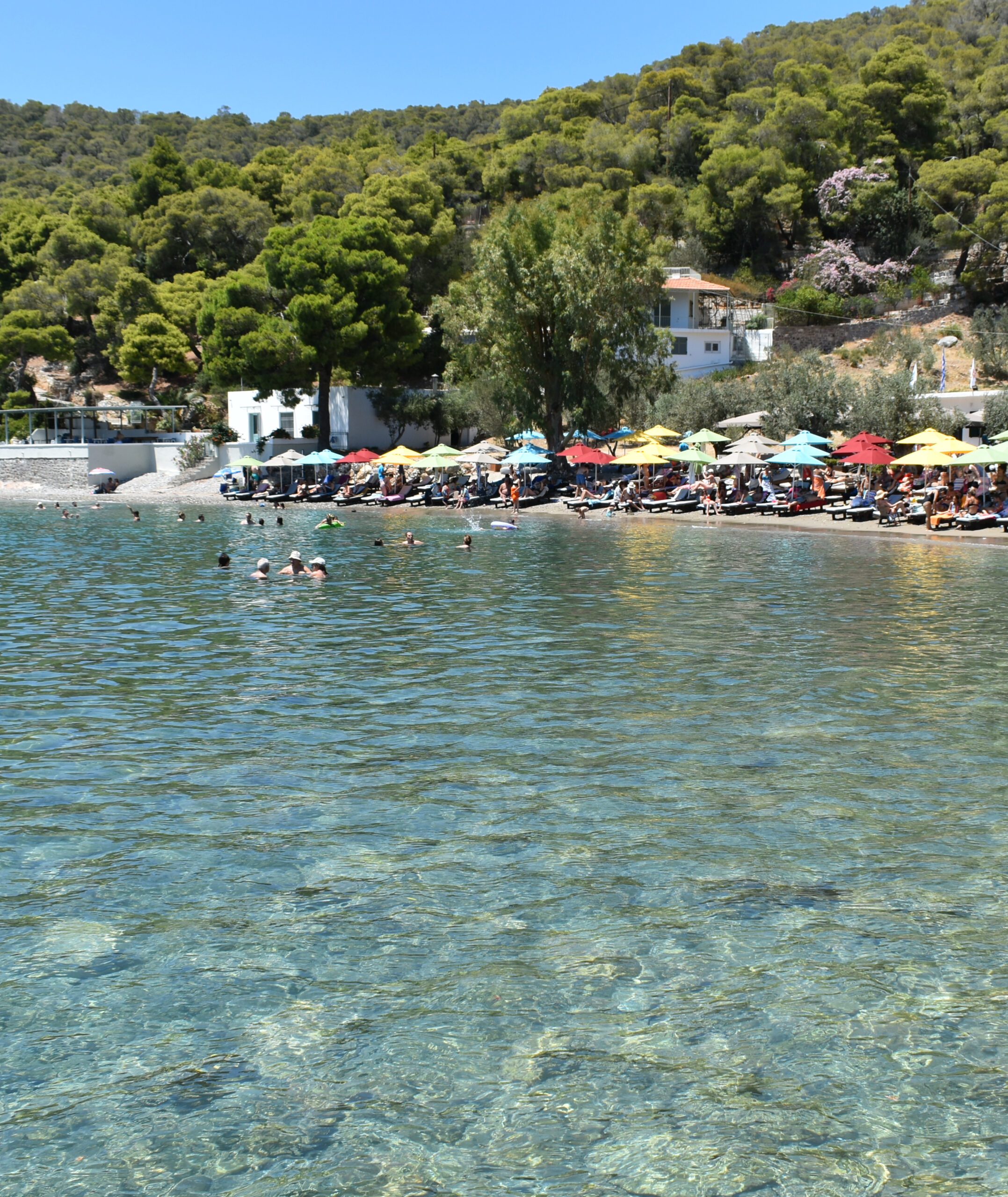 Είναι πλέον ώρα για μια αναζωογονητική βουτιά και χαλάρωση στη μικρή και γραφική παραλία που αγναντεύατε από ψηλά. Με το μεγαλύτερο μέρος της να καλύπτεται από πολύχρωμες ομπρέλες και άνετες ξαπλώστρες για τις οποίες γίνεται και κράτηση, με ένα καλά οργανωμένο beach bar-καντίνα που προσφέρει δροσερά αναψυκτικά, cocktails και χορταστικά σνακ και με διαθέσιμα ντους για όλους, το μόνο που έχετε να κάνετε είναι να απολαύσετε κολύμπι σε πεντακάθαρα και την υπέροχη θέα που φτάνει στις ακτές της Πελοποννήσου, στο Λεμονοδάσος του Γαλατά και στο μικρό νησάκι Μπούρτζι.