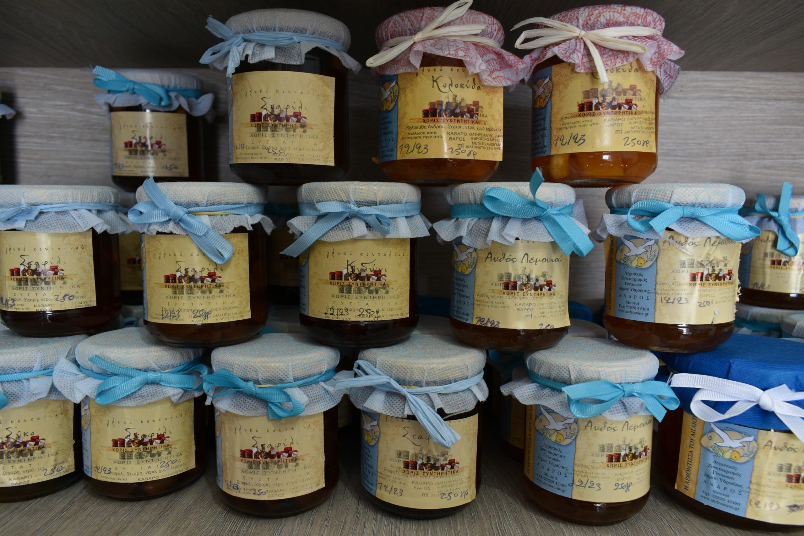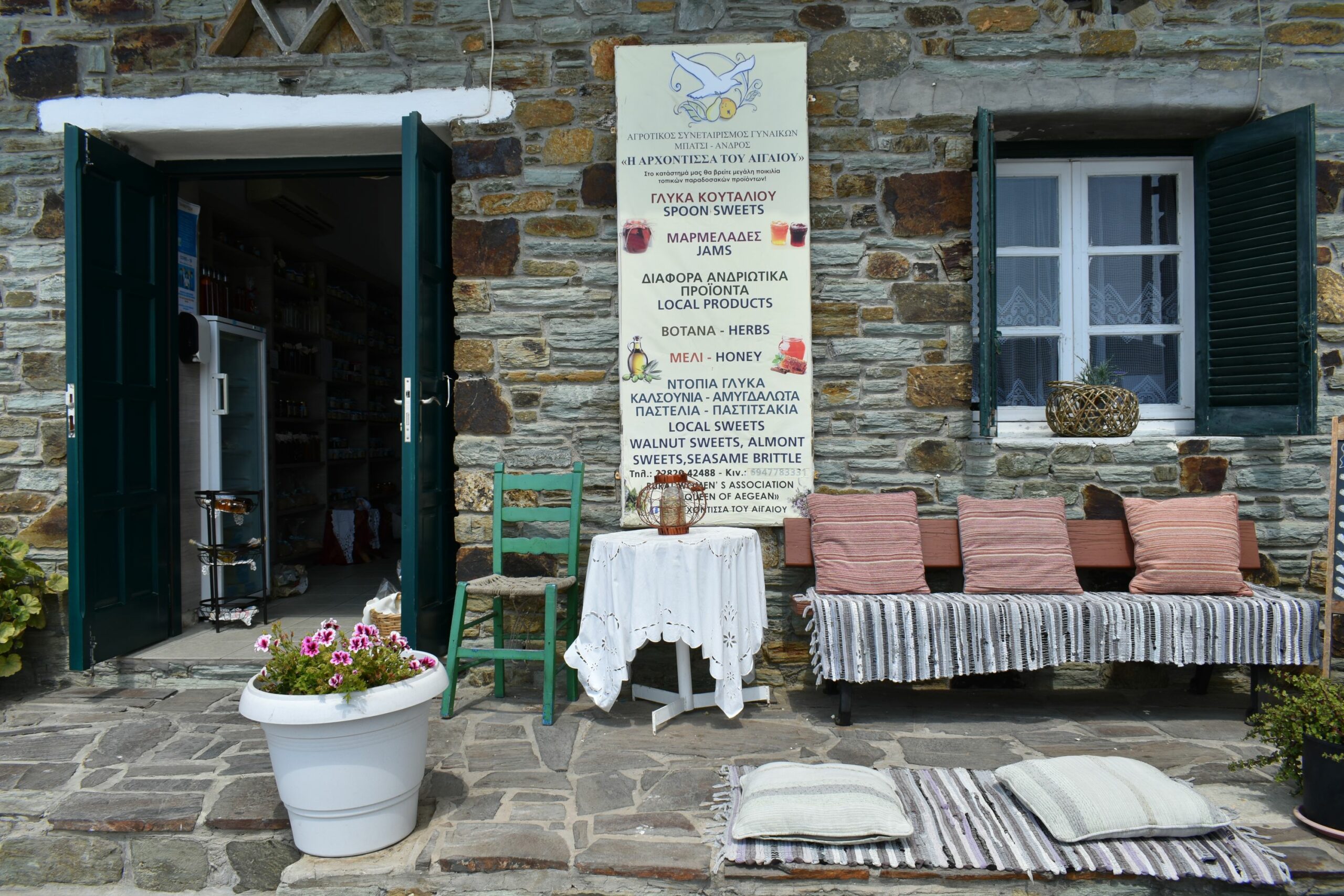 Η ώρα μετά το μεσημεριανό ή το μπάνιο είναι ιδανική για βόλτα και ψώνια σε μερικά από τα πιο αξιόλογα καταστήματα, με πρώτο εκείνο του Αγροτικού Συνεταιρισμού Γυναικών Δήμου Υδρούσας, «Η Αρχόντισσα του Αιγαίου». Εδώ και 16 χρόνια οι γυναίκες του Μπατσίου παρασκευάζουν και πωλούν στο μικρό, κεντρικό κατάστημά τους, παραδοσιακά ανδριώτικα γλυκά αλλά και τυροκομικά προϊόντα ντόπιων παραγωγών, για τα οποία εξάλλου φημίζεται το νησί. Εδώ θα βρείτε τα περίφημα αμυγδαλωτά Άνδρου, αφράτα και όλο άρωμα παστιτσάκια, καλιτσούνια και παστέλια που φτιάχνονται με την ιδιαιτερότητα της προσθήκης ροδόνερου. Τα φρούτα της εύφορης γης του νησιού, όπως το παμπιλόνι, η μπουρνέλα, το καρύδι, το φραγκόσυκο, το σύκο, το λεμόνι και τα άνθη του, γίνονται νόστιμα γλυκά του κουταλιού και μαρμελάδες, αλλά και σπιτικά λικέρ που συσκευάζονται σε όμορφα, ζωγραφιστά μπουκάλια. Και βέβαια, μην παραλείψετε τη ντόπια κάπαρη, το κρίταμο και το εξαιρετικό μέλι που παράγεται στο νησί.