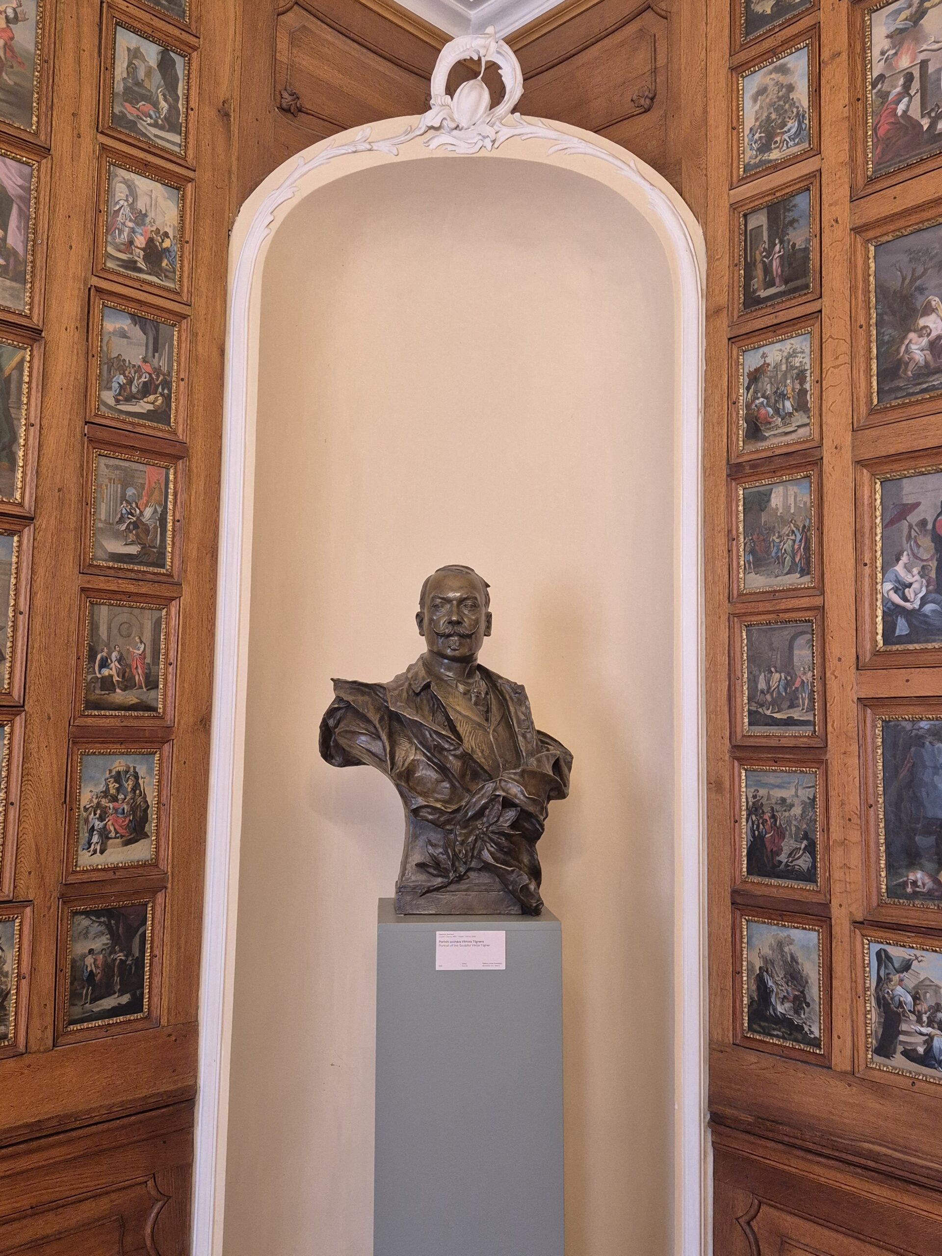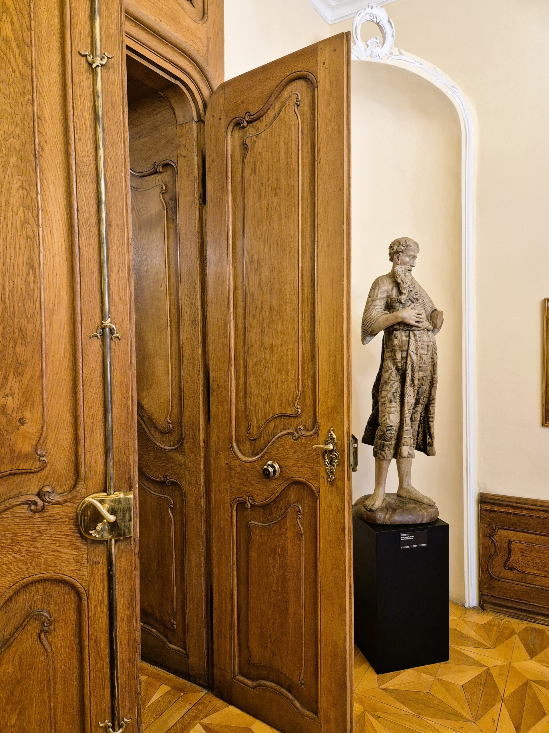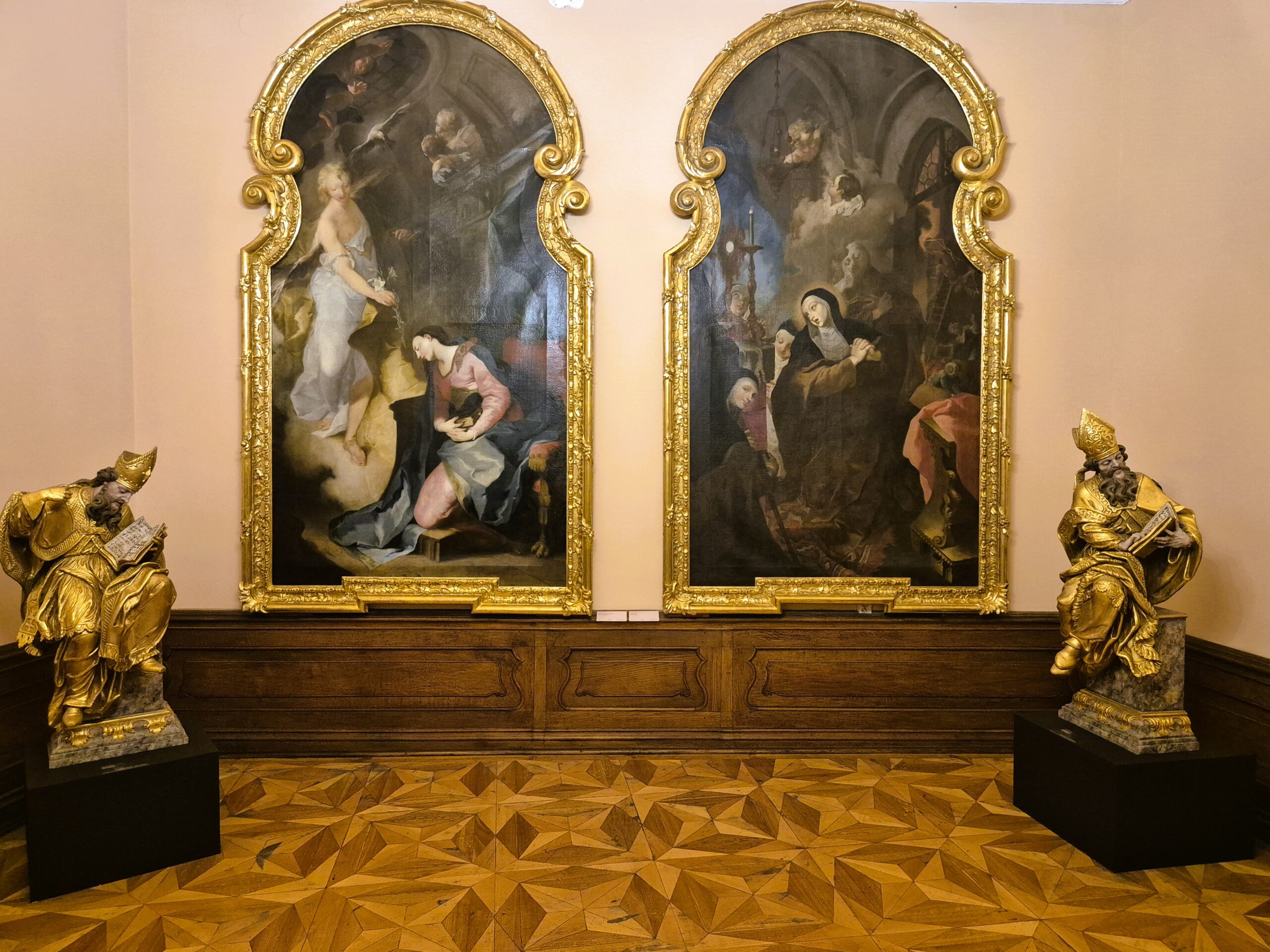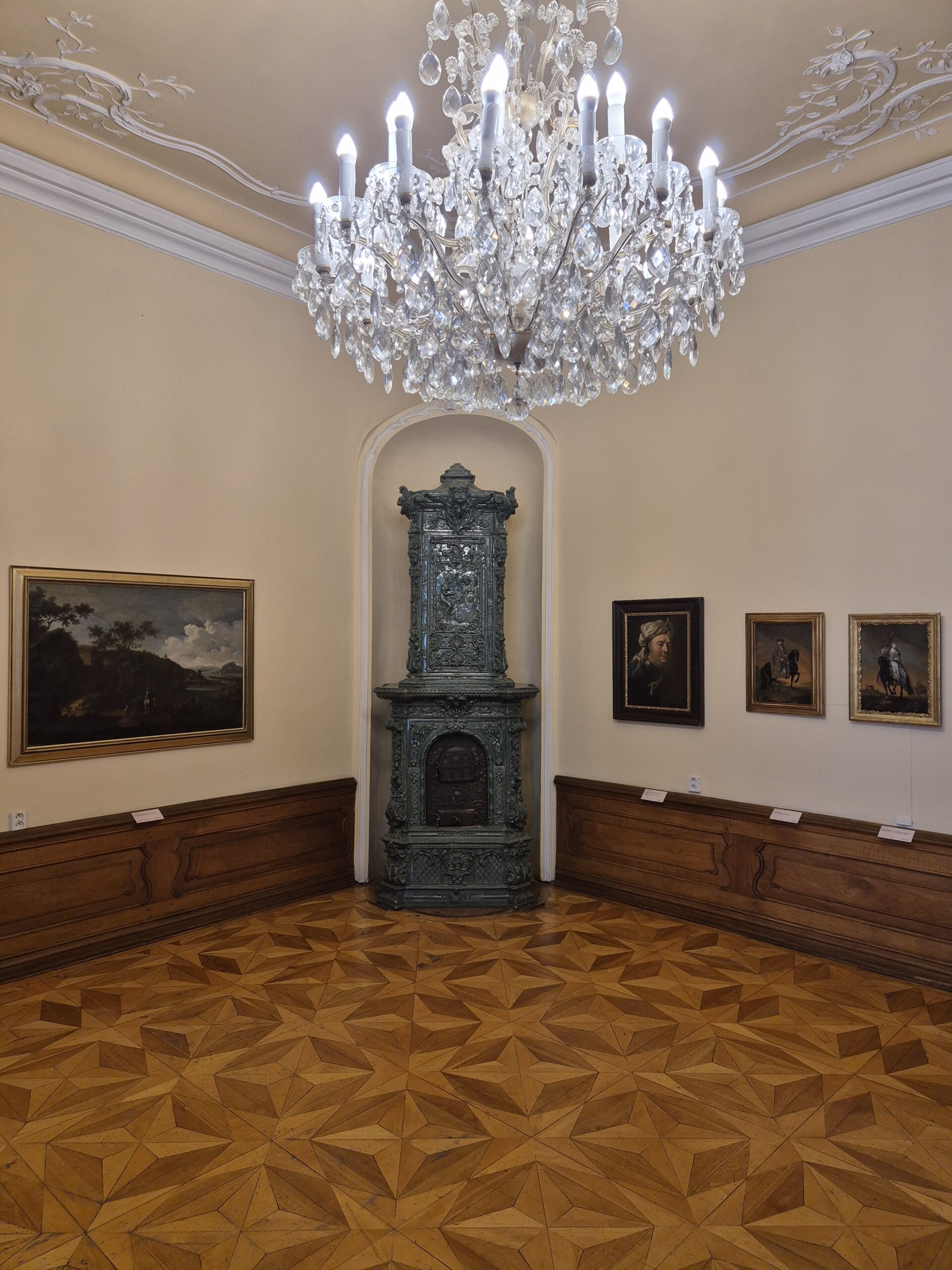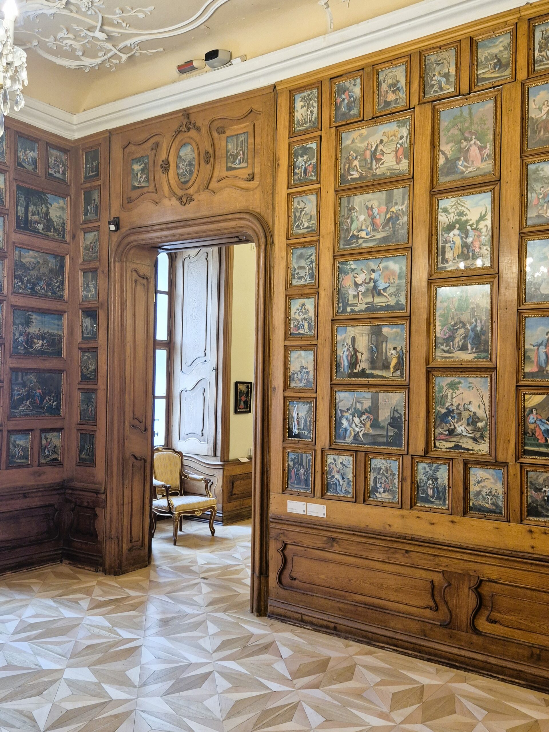Σε απόλυτα αρμονική συνύπαρξη των παραπάνω χαρακτηριστικών στοιχείων, οι δύο πρώτες αίθουσες που συναντάμε καλύπτονται εξ ολοκλήρου από ξυλόγλυπτες προθήκες, οι οποίες μοιάζουν με συνεχόμενες κορνίζες που φτιάχτηκαν για να φιλοξενούν τις εκτεταμένες συλλογές έργων, κυρίως της οικογένειας Nyári de Bedegh και του Κόμη Emil Mirbach, που αγόρασε τα περισσότερα έπιπλα και πίνακές της. Τα έργα με τη μικρή τους κλίμακα και τοποθετημένα κατά θεματική, δίνουν την αίσθηση ότι ξεφυλλίζεις τις σελίδες ενός βιβλίου εποχής, ότι παρακολουθείς σε μικρές οθόνες μια ιστορική ταινία, κι όλα αυτά με τη ζεστασιά του ξύλου να ντύνει το χώρο και το φως να διαχέεται μέσα από παράθυρα και καθρέφτες, επίσης με τις αυθεντικές, περίτεχνες μπρούτζινες κορνίζες τους.