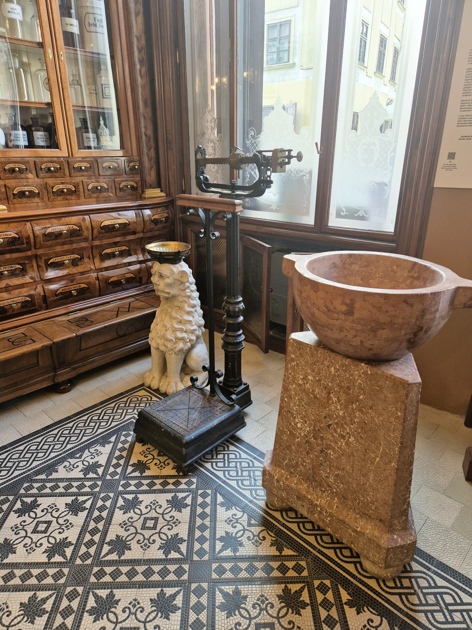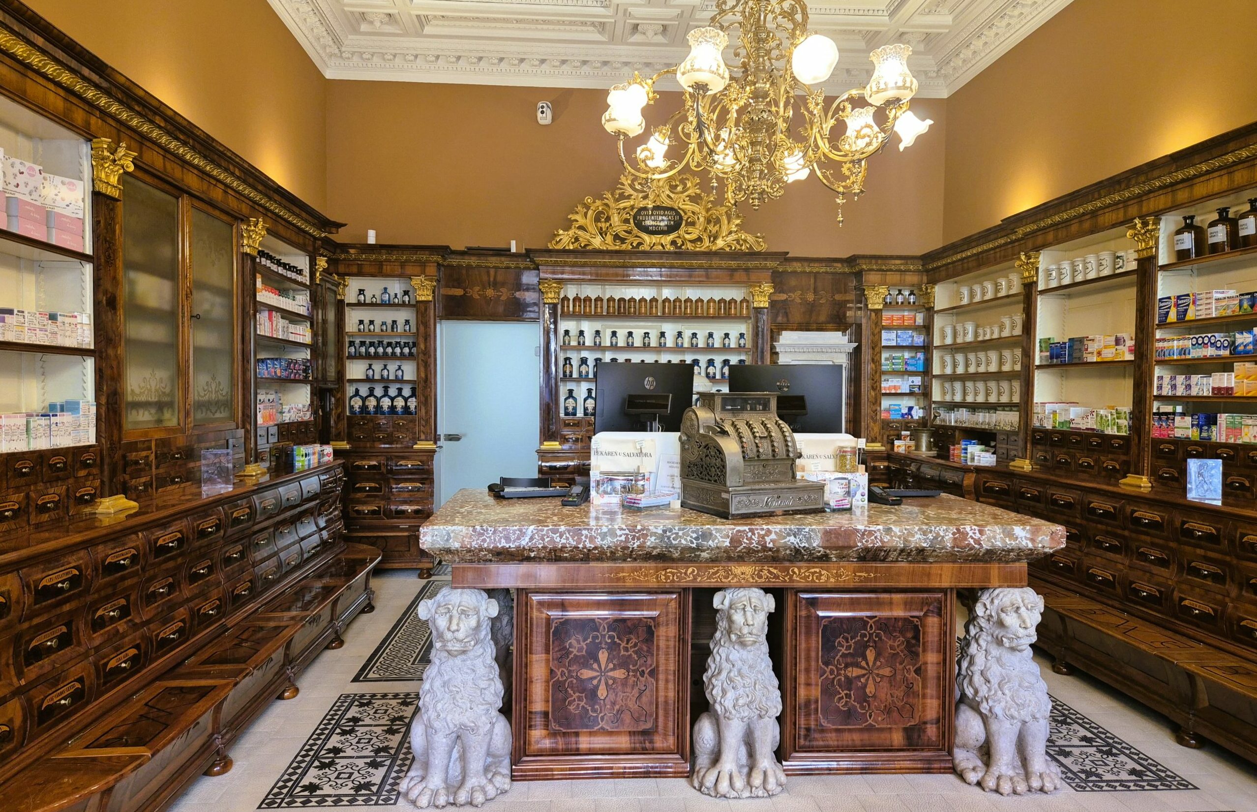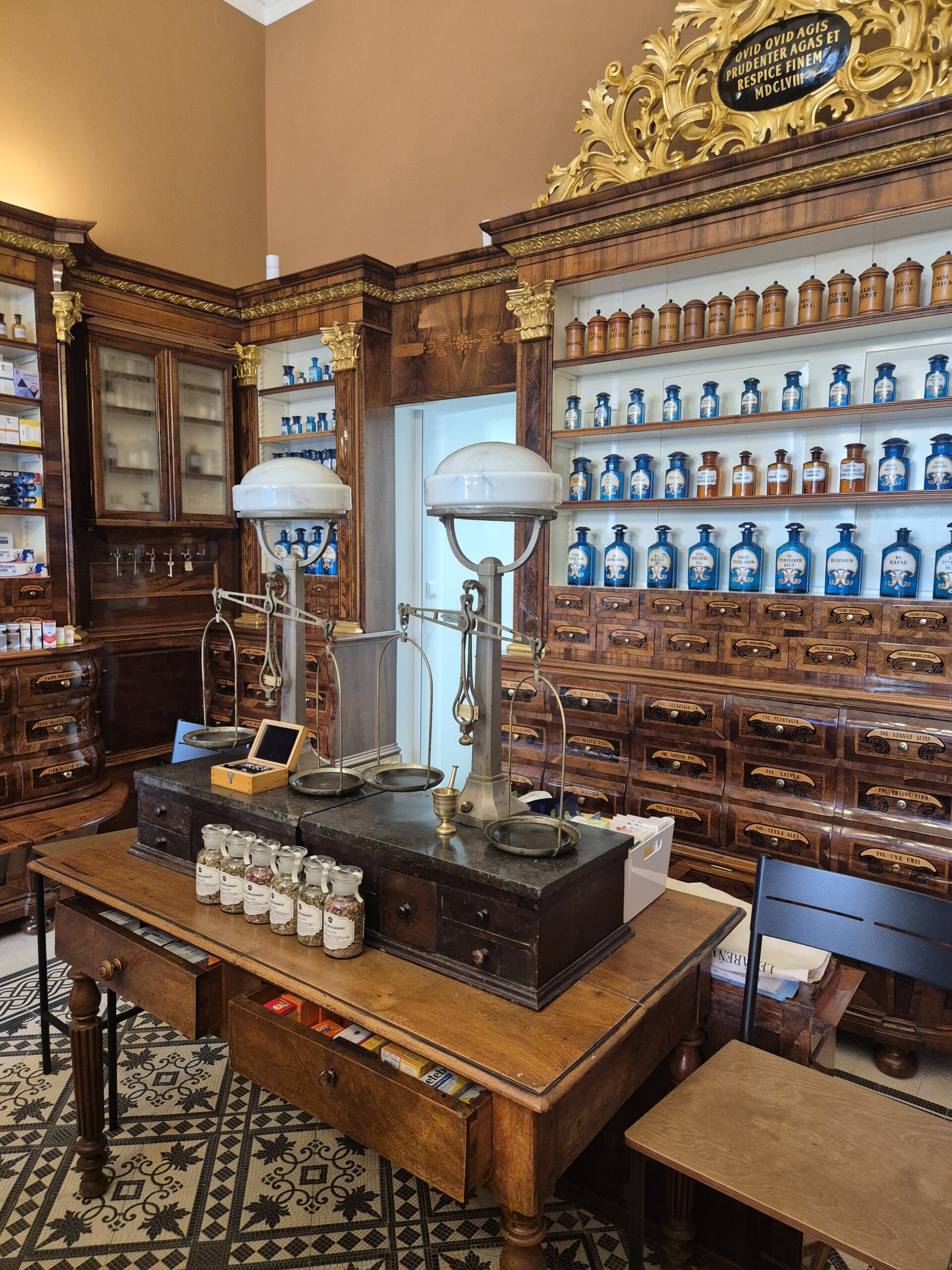 Κι αν το κτήριο απέκτησε ξανά ζωή εξακολουθώντας να προκαλεί θαυμασμό, είναι το εκπληκτικό εσωτερικό που προκαλεί δέος και αφήνει άφωνο όποιον περάσει τη βαριά σιδερένια πόρτα με τις σφυρήλατες μορφές. Αποκατεστημένο άψογα το πάτωμα με τα ασπρόμαυρα μοτίβα που θυμίζουν ρωμαϊκά μωσαϊκά, δίνει ένα δραματικό τόνο, ωστόσο είναι τα σπάνια μπαρόκ έπιπλα -κάποια εκ των οποίων είναι τα αυθεντικά, άνω των 300 ετών-, που μαγνητίζουν τα βλέμματα. Στο κέντρο δεσπόζει ένας μεγάλος εμπορικός πάγκος από ξύλο με υπέροχο μαρκετερί και ζωηρόχρωμο μάρμαρο, που στηρίζεται στα 6 λιοντάρια του ιστορικού φαρμακείου και διακοσμείται από μια παλιά ταμειακή μηχανή. Γύρω του, τα περισσότερα ξύλινα ερμάρια, ντουλάπια και βιτρίνες είναι τα αυθεντικά που αποκτήθηκαν από ιδιώτη συλλέκτη, τον επίσης φαρμακοποιό PharmDr. Erik Kovács, και αποκαταστάθηκαν με προσοχή, ώστε καλογυαλισμένα κι εντυπωσιακά, με τις πομπώδεις χρυσαφένιες κορνίζες τους, να εκθέτουν στα ράφια τους γυάλινα φαρμακευτικά δοχεία και μπουκάλια από τον 16ο ως τον προηγούμενο αιώνα. Κι όλα αυτά κάτω από το ταβάνι με τα γυψανάγλυφα και τις οροφογραφίες, υπό τη λάμψη του πολυελαίου του 1904.