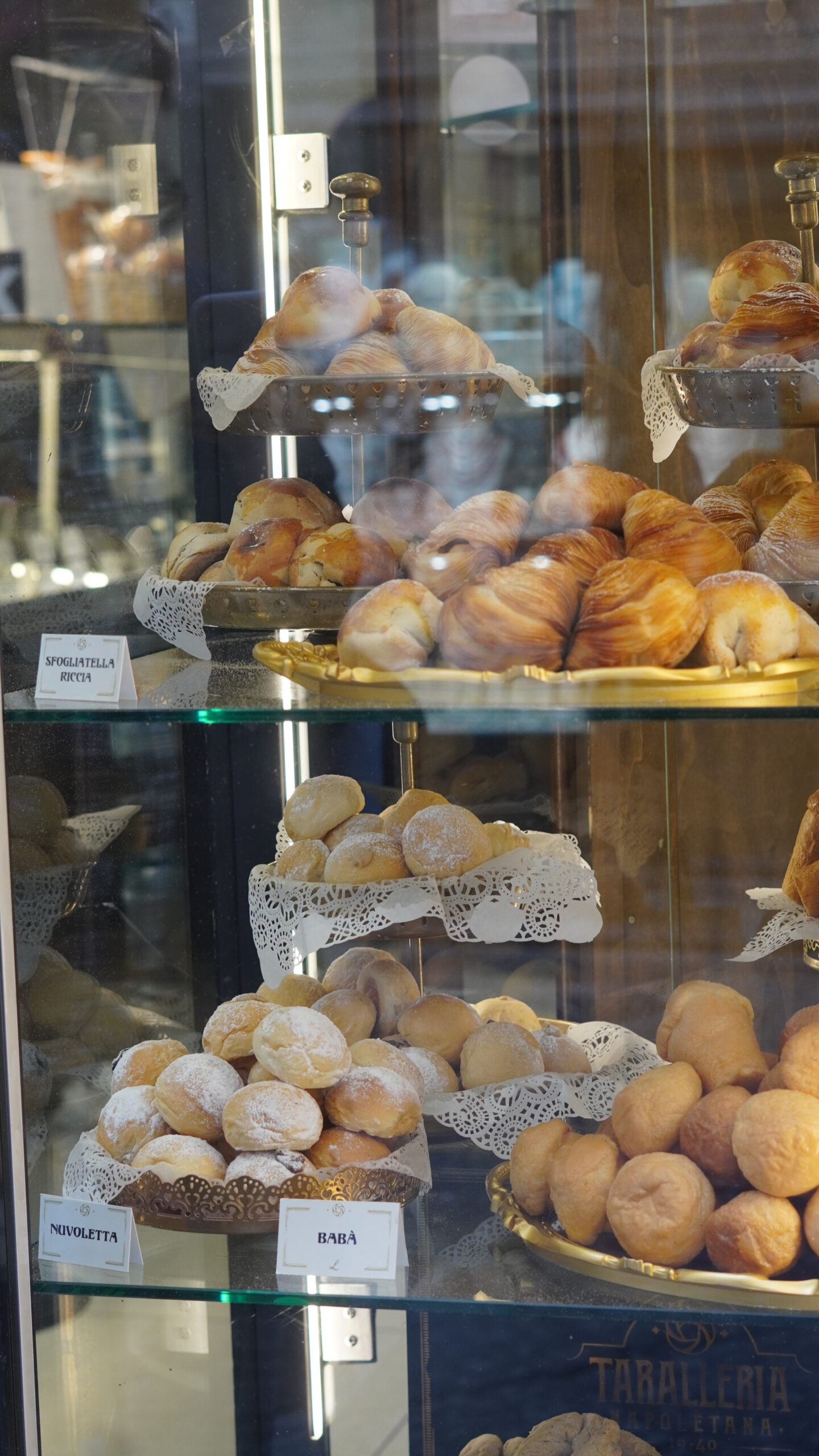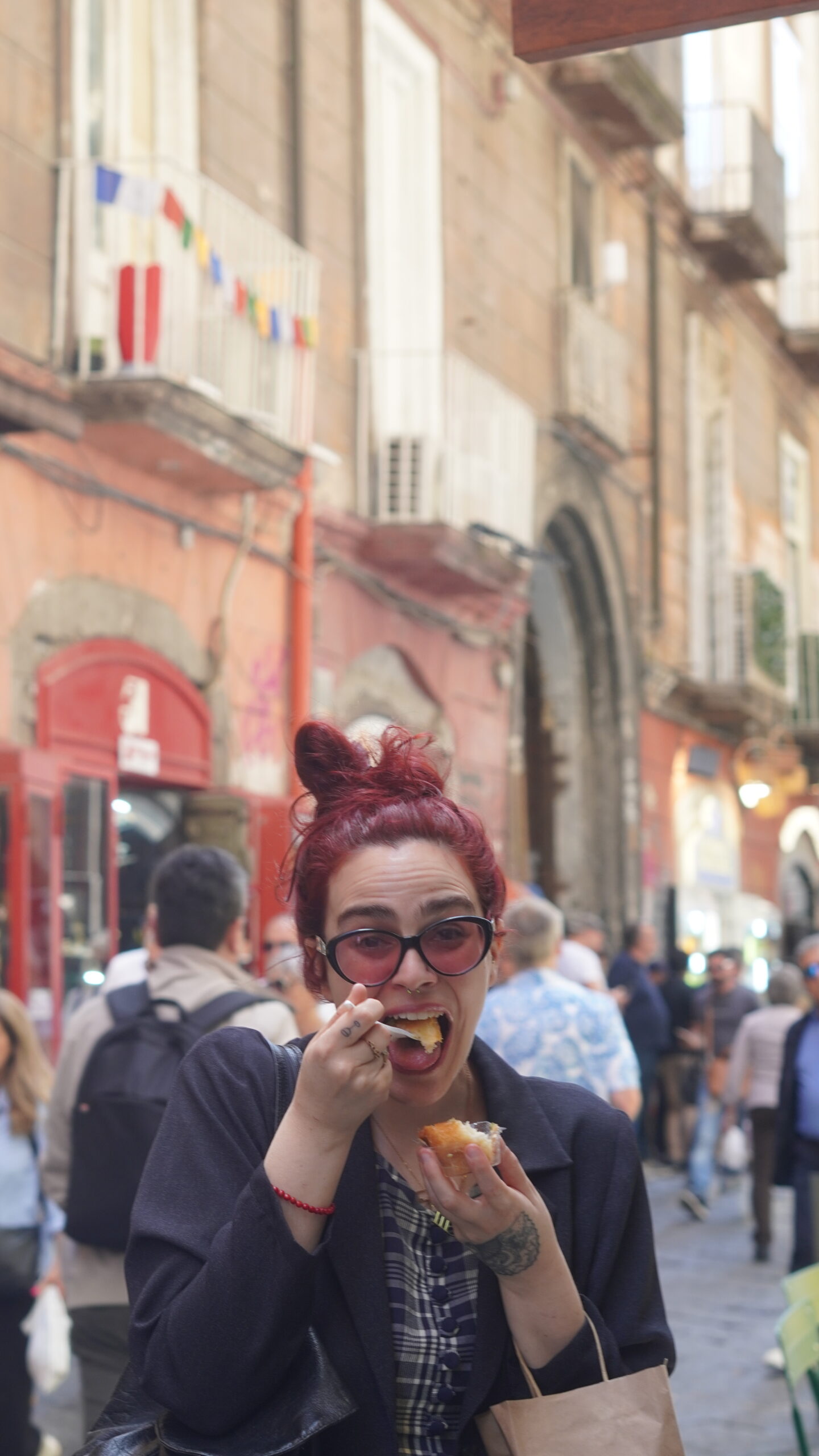 Μια μικρή αναφορά αξίζει και στις οικονομικές τιμές της Νάπολης. Βγάζαμε τις μέρες μας άνετα, βολτάροντας και τσιμπολογώντας από φούρνους και street foodάδικα: σφολιατέλι -εκείνα τα μικρά πιτάκια με γλυκές ή αλμυρές γεμίσεις-, baba au rhum, το αφράτο γλυκό με ρούμι που οι ντόπιοι έχουν κάνει δικό τους, αλλά και πίτσα. Η τηγανητή πίτσα από την Antica Pizza Fritta Da Zia Esterina Sorbillo ήταν εμπειρία από μόνη της. Πεντανόστιμη, γεμάτη ολόφρεσκη ντομάτα και λιωμένα τυριά, λερώνει στόμα, χέρια και ψυχούλα.