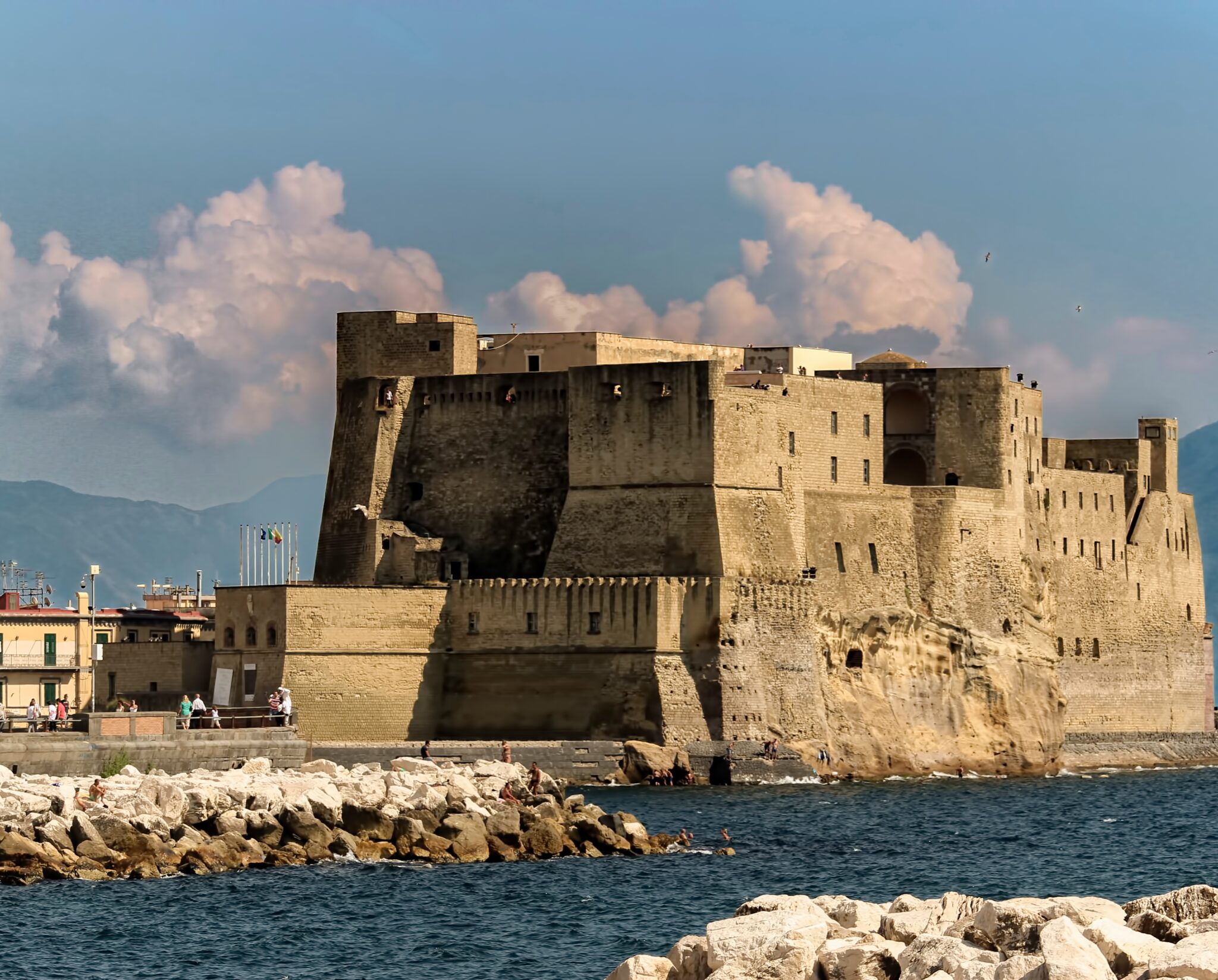 Ακόμη παλαιότερο, το «Κάστρο του Αυγού» – Castel dell’ Ovo, είναι η απαραίτητη στάση στην παραλιακή σας βόλτα κατά μήκος της Lungomare, που θα σας φέρει από την περιοχή της Chaia ως τη Margellina στα ανατολικά. Ο μύθος θέλει το όνομά του να οφείλεται σε ένα μαγικό αυγό κρυμμένο στα θεμέλιά του, ενώ η βόλτα στις επάλξεις αυτής της πρώην βασιλικής κατοικίας και φυλακής προσφέρει υπέροχη θέα του Βεζούβιου. Όταν τα δύο αυτά κάστρα κρίθηκαν μικρά για να στεγάσουν ολόκληρη την Αυλή των Ανδεγαυών, χτίστηκε και νέο κάστρο τον 13ο αι., που ονομάστηκε Castel Nuovo ώστε να ξεχωρίζει από τα προηγούμενα. Έκτοτε, στέκει επιβλητικό στο λιμάνι της πόλης, με το τραπεζοειδές σχήμα και τους 5 κυλινδρικούς του πύργους. Στην πρόσοψή του εντυπωσιακή αντίθεση προκαλεί η αναγεννησιακή Αψίδα του Θριάμβου με το λευκό της μάρμαρο γεμάτο ανάγλυφες παραστάσεις, που μοιάζει σφηνωμένη ανάμεσα στους μεσαιωνικούς πύργους. Στο εσωτερικό, επισκεφθείτε το Δημοτικό Μουσείο, το παρεκκλήσι Cappella Palatina με τοιχογραφίες του Giotto και τη Sala dei Baroni με το τεράστιο, οκτάγωνο αστέρι στο γοτθικό της θόλο. Τέλος, στο λόφο Vomero στο ψηλότερο σημείο της πόλης, θα ανεβείτε απόγευμα για να θαυμάσετε το μοναδικό ηλιοβασίλεμα και την πανοραμική θέα από τη Spaccanapoli ως τον Βεζούβιο, τα παραθαλάσσια κάστρα και τα νησιά του κόλπου στο βάθος ως τη συνοικία των ψαράδων Margellina, από το εντυπωσιακό Castel Sant’ Elmo. Βασιλική κατοικία απ΄όταν χτίστηκε τον 14ο αιώνα, οφείλει το σημερινό του σχήμα ως εξάγωνο αστέρι σε μετατροπές του 16ου αι., που το ανέδειξαν σε βασικό οχυρό της πόλης.