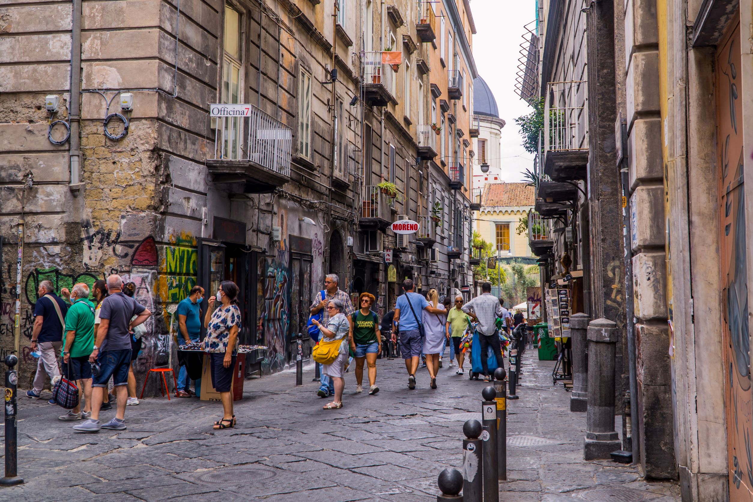 Μην περιμένετε όμως εντυπωσιακές φαρδιές λεωφόρους εδώ. Και οι τρεις δρόμοι είναι στενοί, με το πλακόστρωτο αιώνων να κατακλύζεται από μηχανάκια, γαργαλιστικές μυρωδιές παραδοσιακών τηγανιτών σνακ να σας δελεάζουν από παντού, προσόψεις παλατιών να μαρτυρούν την κυριαρχία των Γάλλων Ανδεγαυών και των Ισπανών Αραγόνων και Βουρβόνων και λαϊκές πολυώροφες κατοικίες, στα μπαλκόνια των οποίων επίδοξοι τραγουδοποιοί επιδίδονται σε ερμηνείες του “That’s amore” αλά Dean Martin.