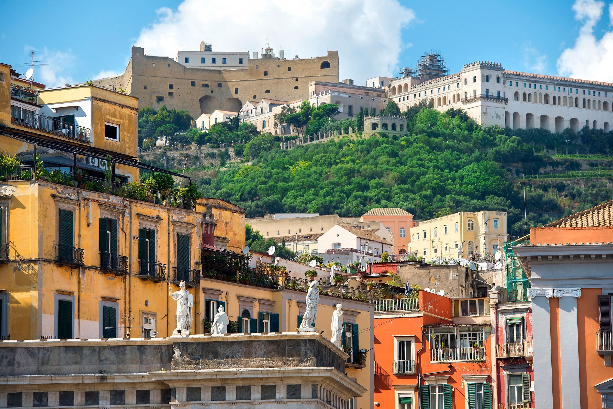 Επισκεφθείτε το κορυφαίο αξιοθέατο, το τεράστιο Μοναστικό Συγκρότημα Certosa di San Martino, που χρονολογείται από τον 14ο αιώνα, αλλά σήμερα κυριαρχεί ο μπαρόκ ρυθμός. Δείτε τον πολυτελή ναό, τα εντυπωσιακά περιστύλια με τις μαρμάρινες κολώνες και το μουσείο εντός του συγκροτήματος, με εκθέματα σχετικά με την ιστορία και την τέχνη της Νάπολης. Στην περιοχή αυτή μπορείτε να απολαύσετε έναν αναζωογονητικό περίπατο στο πάρκο Villa Floridiana , συνδυάζοντάς τον με μια επίσκεψη στο Εθνικό Μουσείο Κεραμικών, εντός της τεράστιας αυτής έκτασης πρασίνου. Για έναν διαφορετικό και πρωτότυπο τρόπο επιστροφής στην πόλη, επιλέξτε την Pedamentina, μια σειρά από 414 σκαλιά, που θα σας οδηγήσει από το κάστρο στο κέντρο, με διαρκή εναλλαγή της συναρπαστικής θέας καθώς κατηφορίζετε.