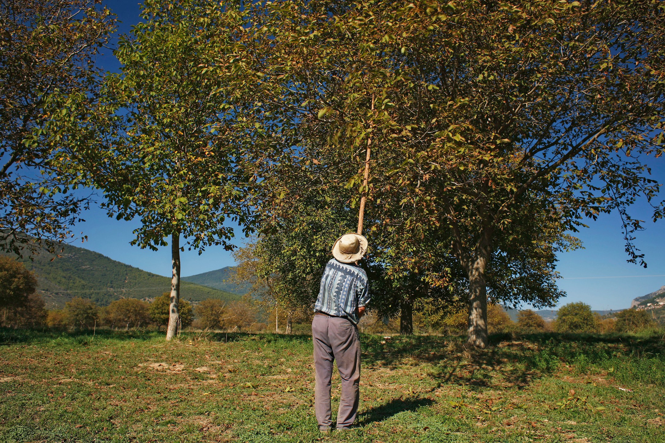 Λίγο έξω από το χωριό Μεσινό, στα όρια της Αρχαίας Φενεού, ένας αγρότης ραβδίζει με δύναμη τα στιβαρά κλαδιά των καρυδιών, ρίχνοντας τους πολύτιμους καρπούς στο καταπράσινο, νωπό από πότισμα, έδαφος. Σε λίγο, θα κάνει μια μεγάλη βόλτα κάτω από τις σκιές των γιγάντιων αυτών δέντρων και θα τους συλλέξει, γεμίζοντας και βαραίνοντας τα καλάθια του δίνοντάς μου την εικόνα μιας διαδικασίας η οποία πρέπει να επαναλαμβάνεται πανομοιότυπα για χιλιάδες χρόνια.