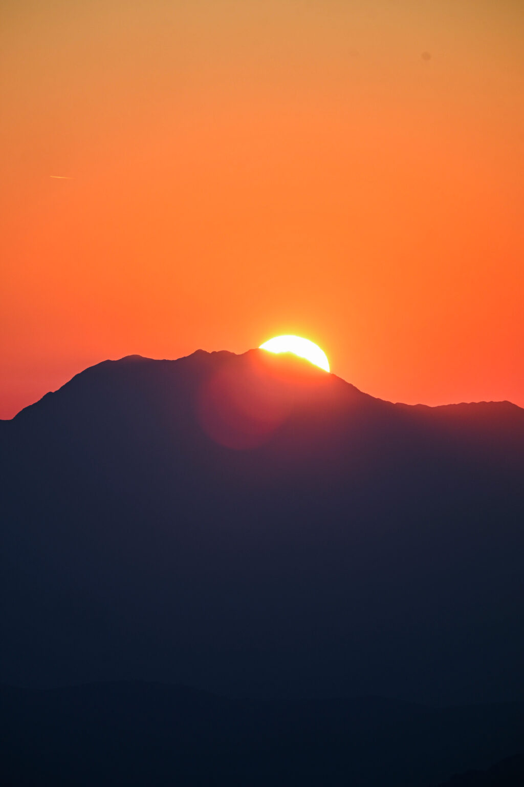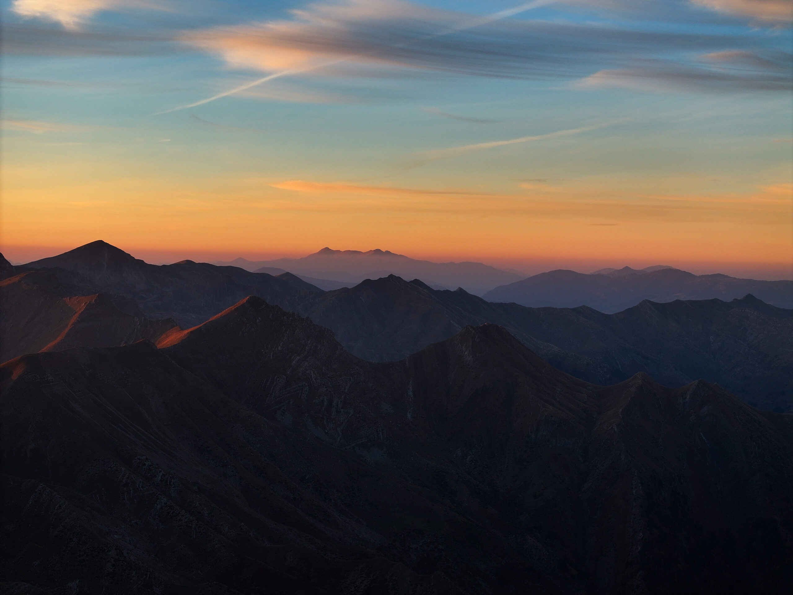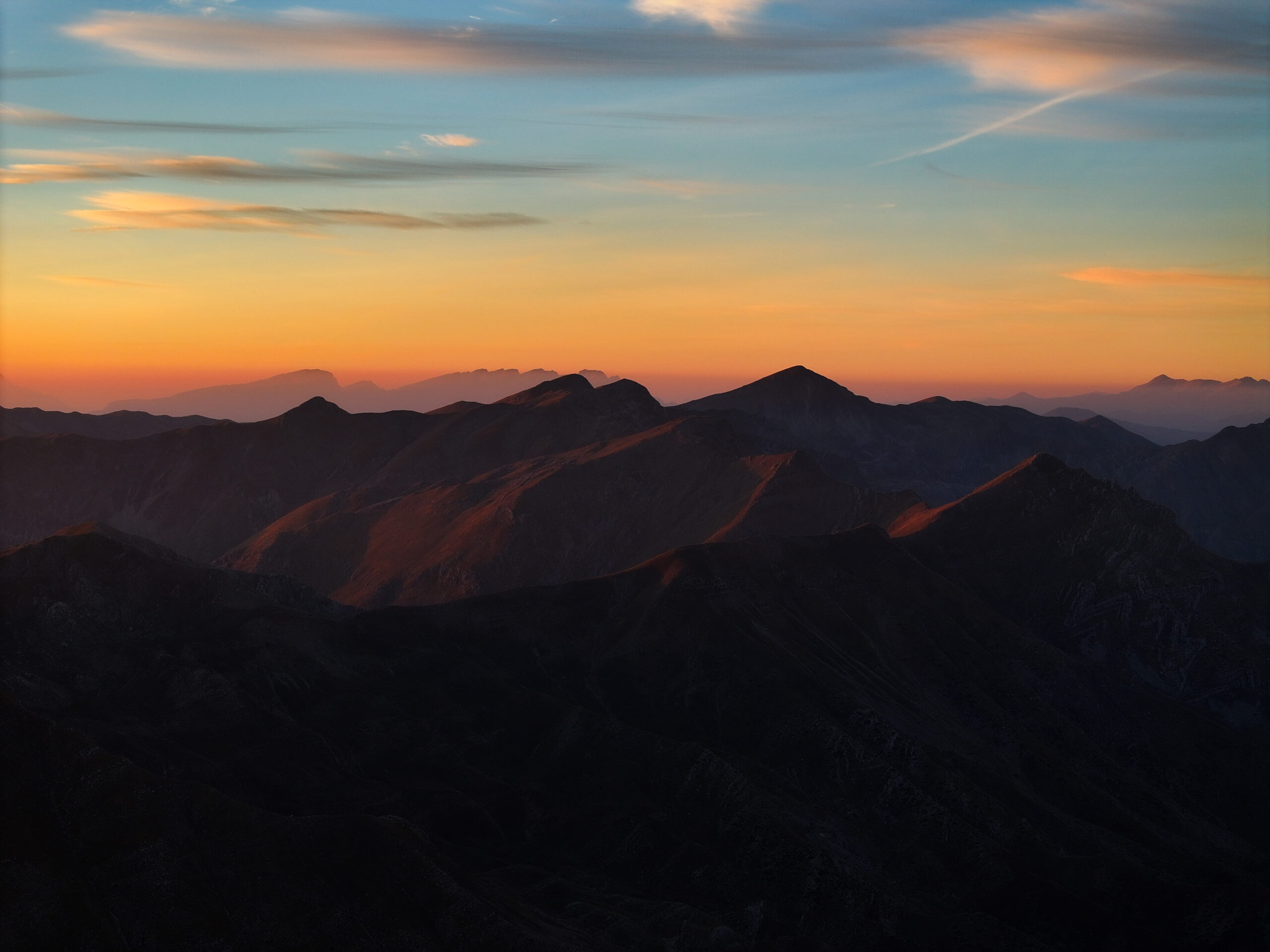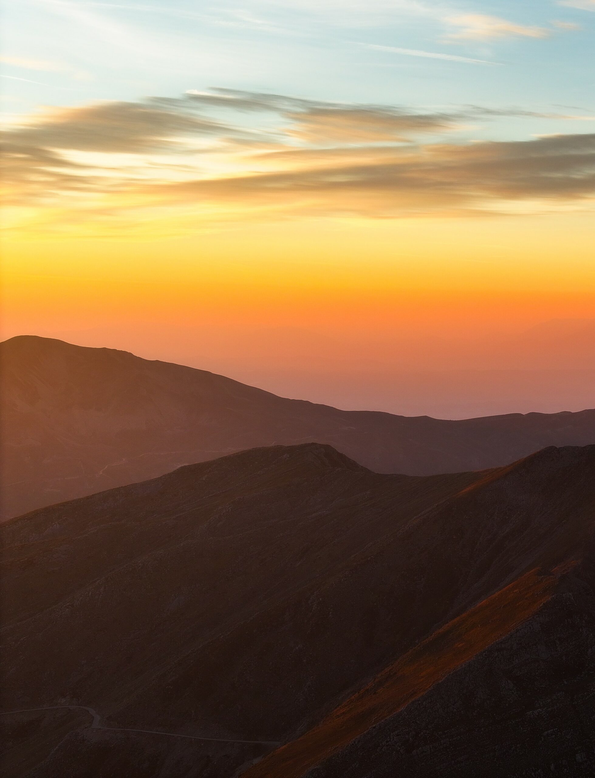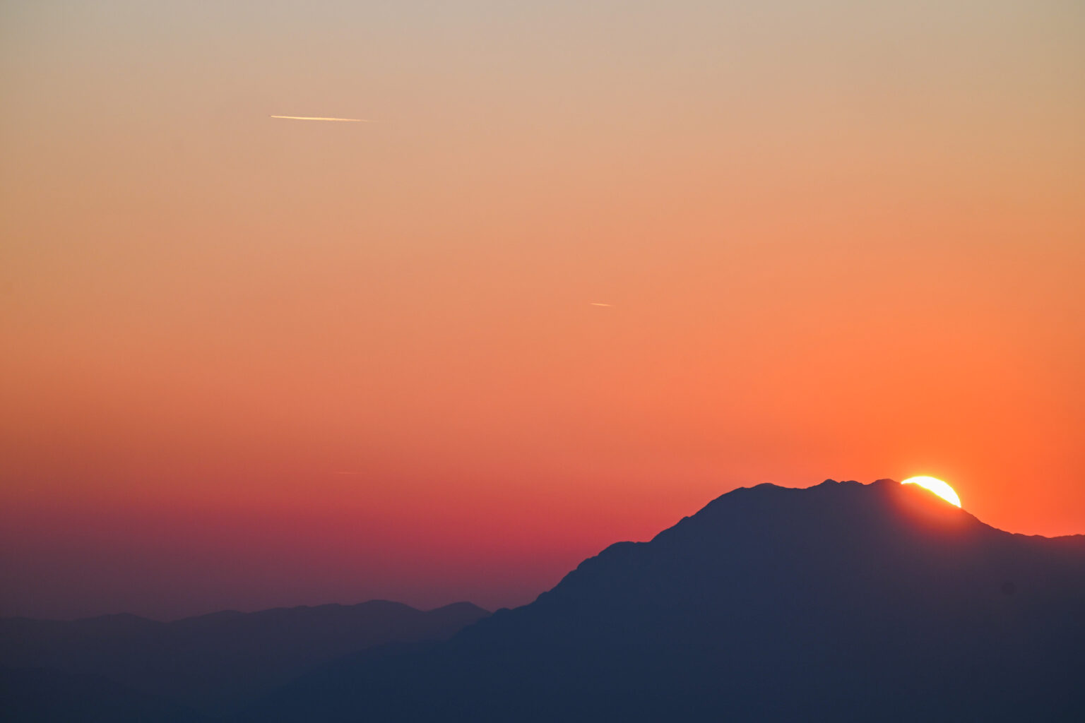 Τέτοιες στιγμές συναντά κανείς στις κορυφές της Πίνδου, όταν ο ήλιος αποφασίζει να αποχαιρετήσει τη μέρα με μια παράσταση που κόβει την ανάσα. Εδώ ψηλά, στη ραχοκοκαλιά της Ελλάδας, το ηλιοβασίλεμα δεν είναι απλά ένα καθημερινό φαινόμενο -είναι μια τελετουργία. Ο ουρανός φλέγεται σε αποχρώσεις του πορτοκαλί και του χρυσού, ενώ λεπτά σύννεφα, σαν πινελιές του πιο ταλαντούχου ζωγράφου, απλώνονται νωχελικά στον απέραντο γαλάζιο καμβά. Καθώς ο ήλιος κατεβαίνει αργά, οι σκιές των βουνών μεγαλώνουν, δημιουργώντας ένα παιχνίδι φωτός και σκότους που κάνει τις κορυφογραμμές να μοιάζουν με κύματα μιας πέτρινης θάλασσας. Η μαγεία αρχίζει πολύ πριν τη δύση.