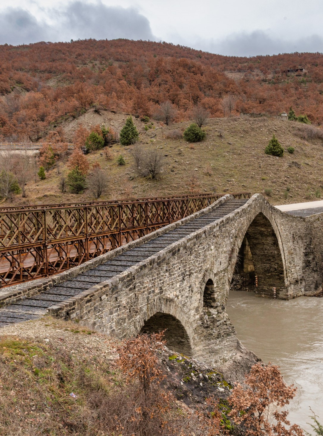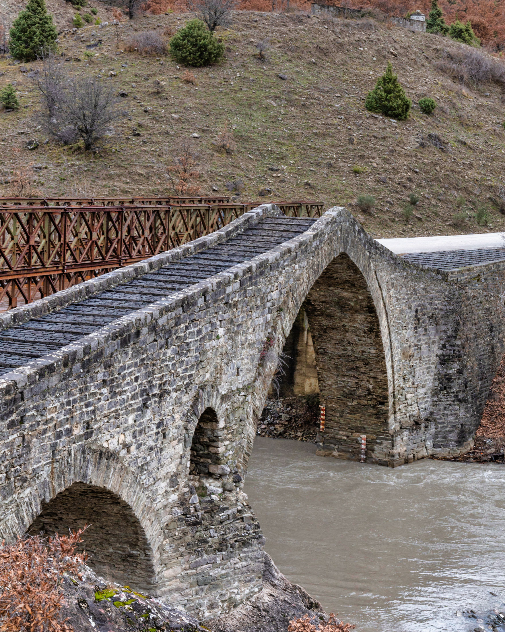 Αξίζει βέβαια να διασχίσετε και το ίδιο το γεφύρι, το οποίο διατηρείται σε εξαιρετική κατάσταση, ώστε να παρατηρήσετε την εντυπωσιακή κατασκευή του. Όπως και τη διπλανή σιδερένια γέφυρα, ώστε να το θαυμάσετε από το πλάι, προσέχοντας ιδιαίτερα τη μικροσκοπική καμάρα που διευκολύνει τη ροή του ποταμού, όταν ανεβαίνει η στάθμη του. Συνδυάστε το με μια επίσκεψη στο κοντινό Μοναστήρι της Κοιμήσεως της Θεοτόκου –ένα από τα σημαντικότερα θρησκευτικά μνημεία της περιοχής.