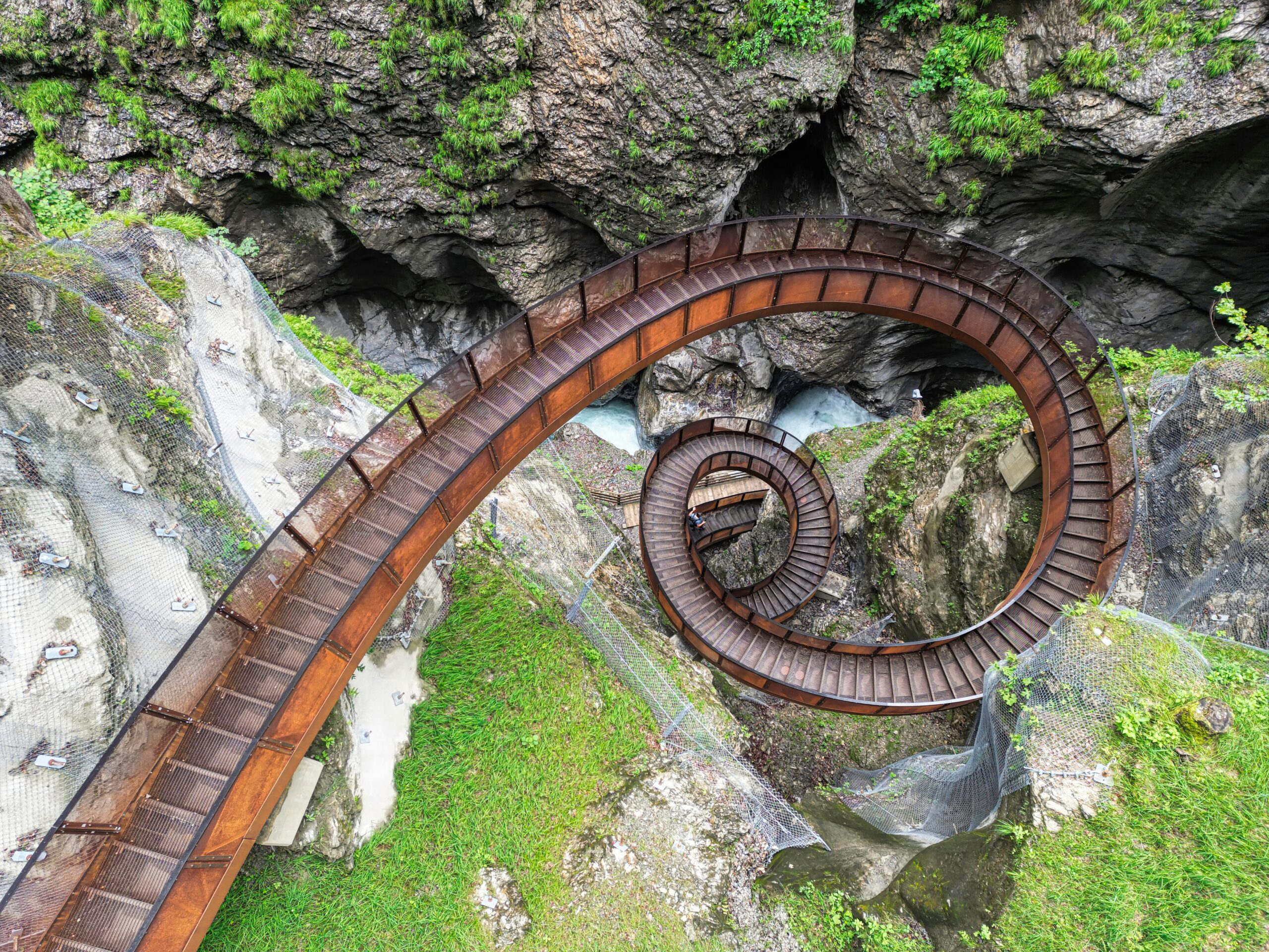 Χρειάστηκαν περίπου 7.000 λεπτά πτήσης και εξαιρετικά υψηλή ακρίβεια για τη μεταφορά των οικοδομικών υλικών, ορισμένα από τα οποία ζύγιζαν αρκετούς τόνους. Επιπλέον, έχει εγκατασταθεί ένα σύστημα παρακολούθησης που ανιχνεύει κινήσεις στα βράχια με ακρίβεια χιλιοστών, εξασφαλίζοντας την ασφάλεια των επισκεπτών. Το πιο εντυπωσιακό στοιχείο, ωστόσο, είναι η παράκαμψη της επικίνδυνης περιοχής μέσω μιας εντυπωσιακής σπειροειδούς χαλύβδινης σκάλας, γνωστής ως «Helix», που κατεβαίνει σε βάθος 30 μ.