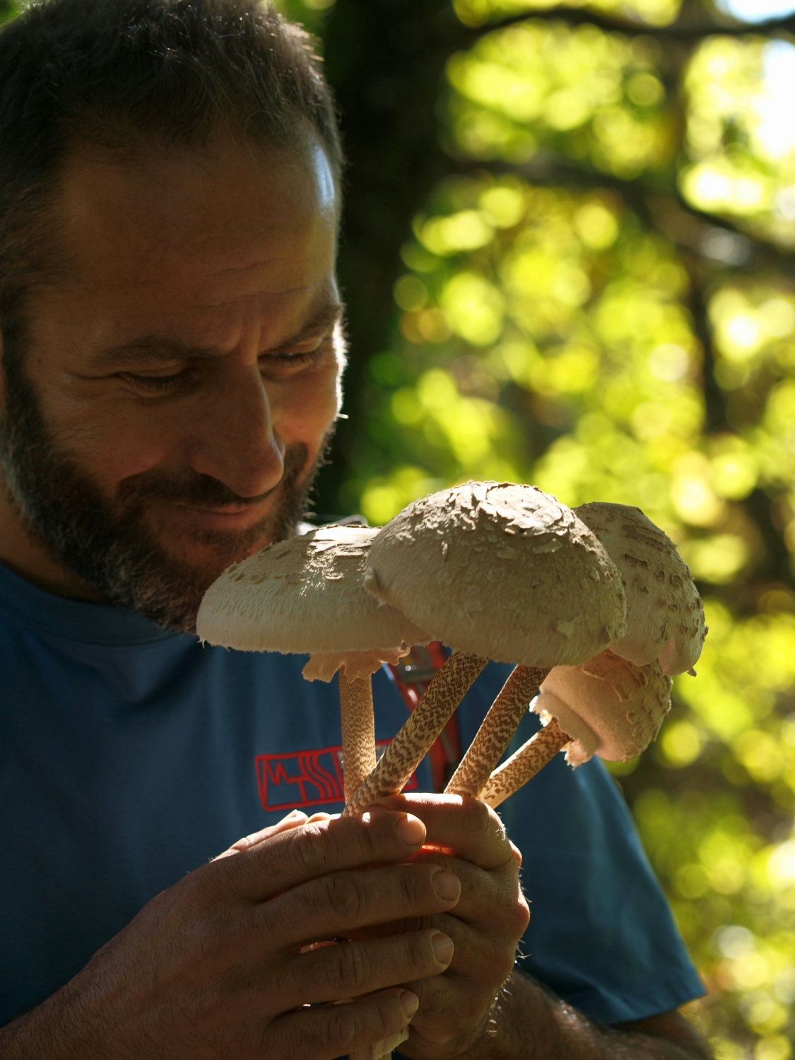 Φυσικά, προσπερνά χωρίς δεύτερη σκέψη όποιο μανιτάρι δεν γνωρίζει και δεν είναι σίγουρος ότι είναι άκακο. Δεν προσπερνά βέβαια τα «ζαρκαδίσια», τα ωραία εδώδιμα μανιτάρια που συναντήσαμε τη στιγμή που πιστέψαμε ότι το κυνήγι μας, αρκετές ημέρες μετά την τελευταία βροχή, δεν είχε καμιά τύχη. Το μπουκέτο με τα μανιτάρια έφερε ο Μανώλης κοντά στη μύτη του και ένα χαμόγελο ευτυχίας και ευχαρίστησης φώτισε το πρόσωπό του. Το ίδιο έκανε και η κυρία Κλειώ που ήταν ακόμη στη θέση της, στη σκιά του ψηλού καμπαναριού, κόβοντας προσανάμματα για το τζάκι, όταν την συναντήσαμε ξανά στην επιστροφή. Πήρε μια «κουκουμπέλα» όπως την είπε αυτό το μανιτάρι που εμείς λέγαμε ζαρκαδίσιο, το μύρισε, το λιμπίστηκε, και ζήτησε από τον Μανώλη να της το χαρίσουμε για να το τηγανίσει.
