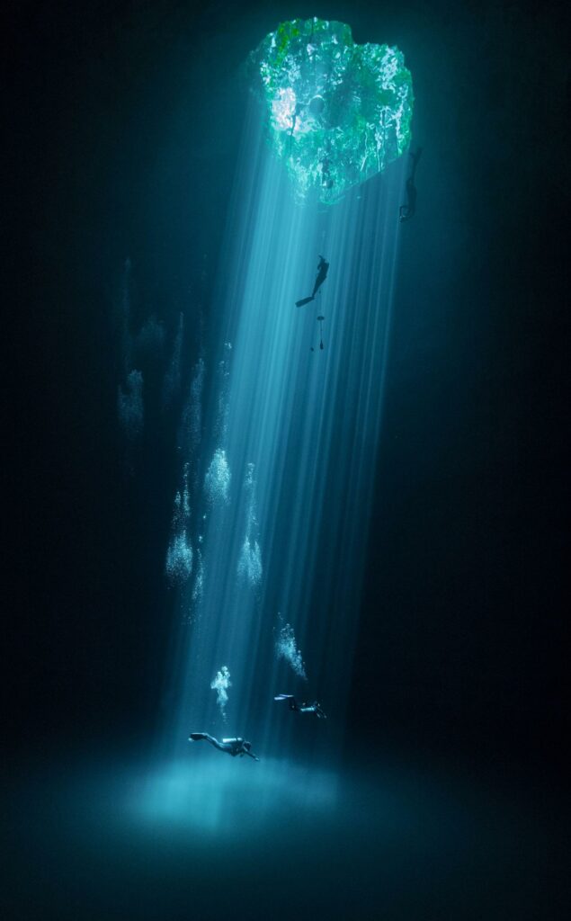 Καταδύτες και κολυμβητές απολαμβάνουν το νερό σε μία cenote, υπόγεια λίμνη στο Μεξικό.