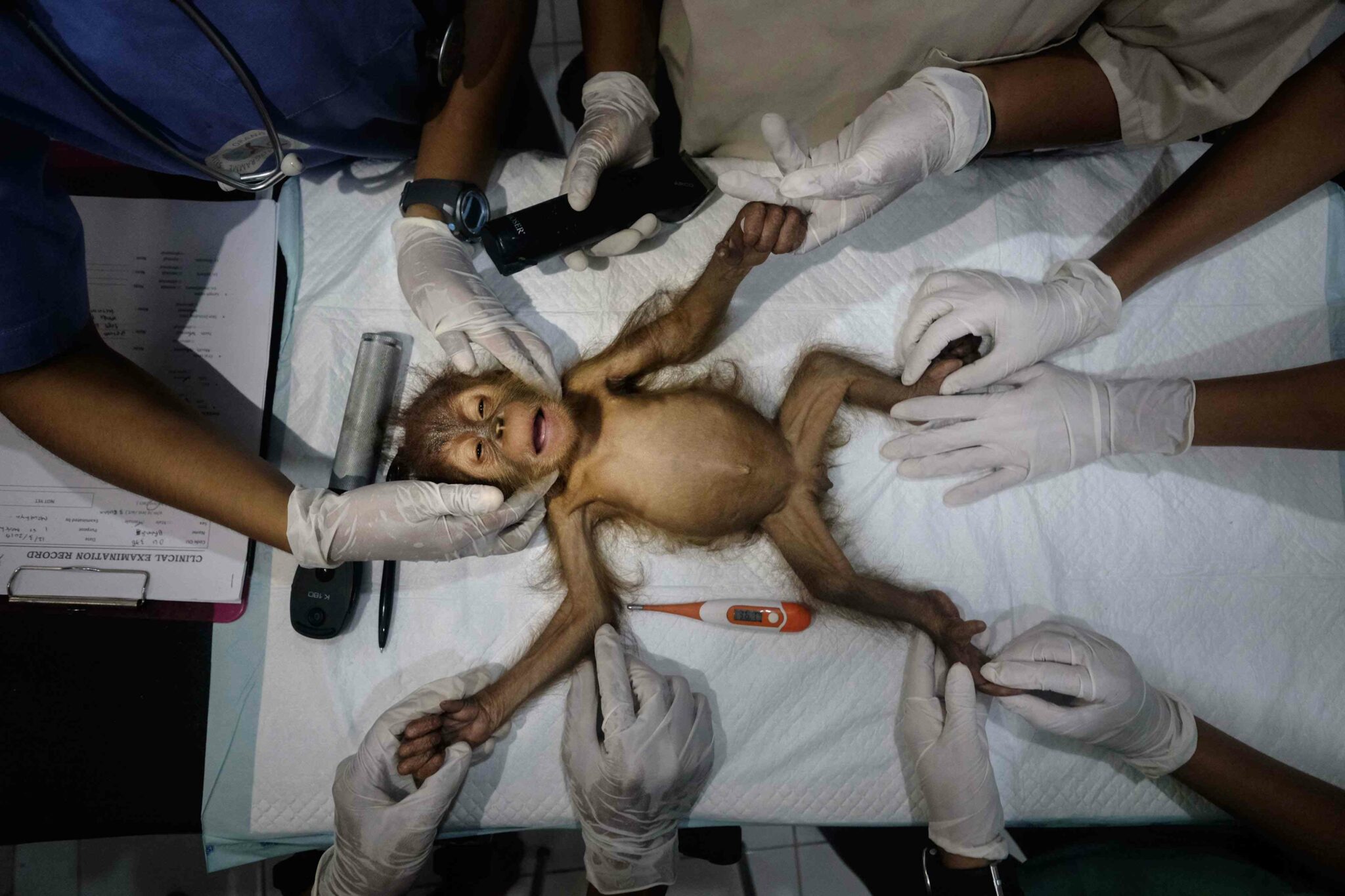 Η φωτογραφία δείχνει τη διάσωση, θεραπεία και απελευθέρωση ενός ουρακοτάγκου στην Ινδονησία. Ο ουρακοτάγκος ετοιμάζεται να υποβληθεί σε χειρουργική επέμβαση. Οι ουρακοτάγκοι της Ινδονησίας απειλούνται από την αποψίλωση του τροπικού δάσους. Αιτίες της αποψίλωσης είναι η υλοτομία, οι φυτείες για φοινικόδεντρα από τα οποία παράγεται φοινικέλαιο, το κυνήγι και οι εξορυκτικές δραστηριότητες.