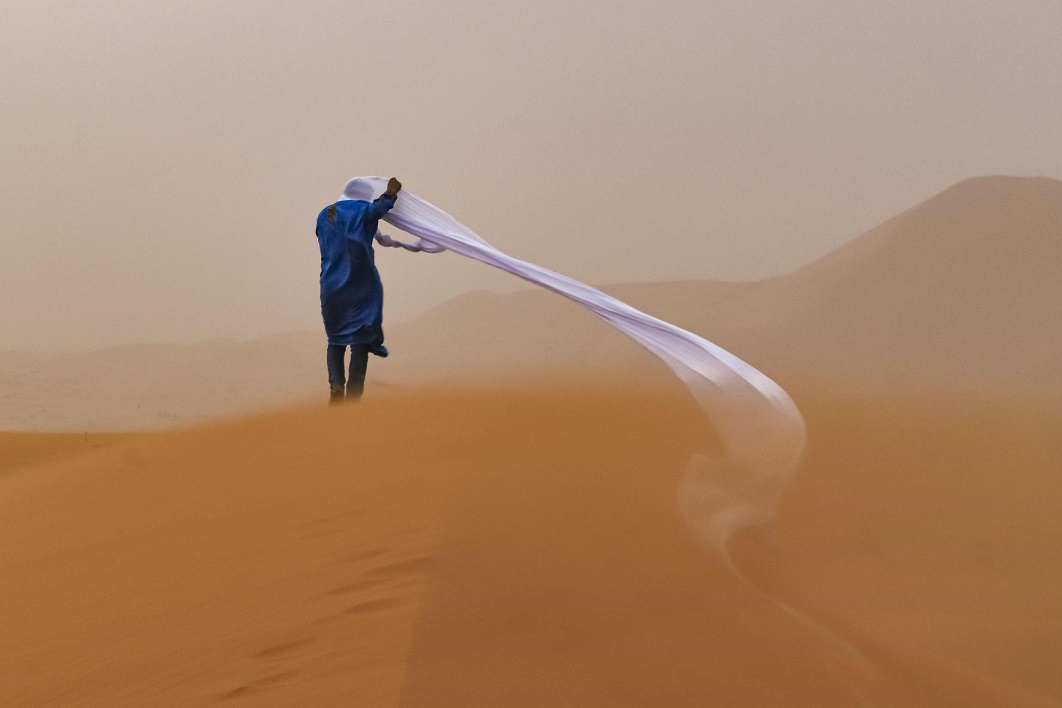 Ένας άνθρωπος διασχίζει τη Σαχάρα κατά τη διάρκεια ανεμοθύελλας.