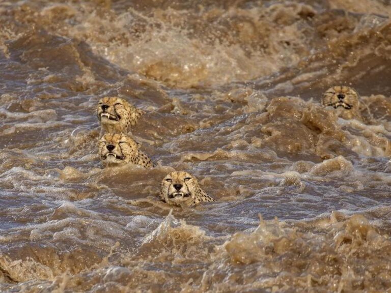 Η ασυνήθιστη εικόνα από πέντε τσίταχ που προσπαθούν να διασχίσουν έναν ποταμό στην Κένυα κατά τη διάρκεια μιας πλημμύρας. Η προσπάθειά τους έμοιαζε καταδικασμένη αλλά τελικά τα κατάφεραν. Το κλικ είναι μια υπενθύμιση για το τι έχει προκαλέσει ο άνθρωπος στο κλίμα της Γης.