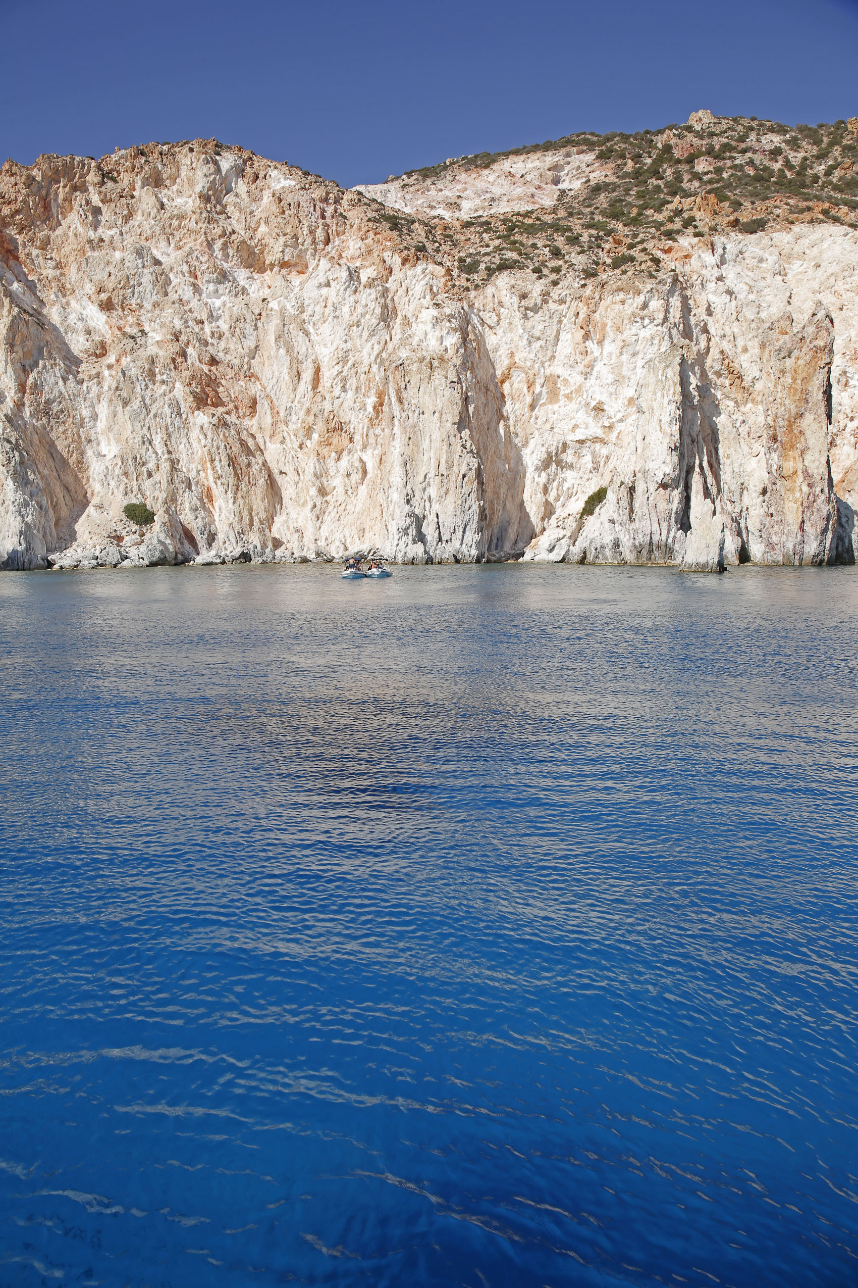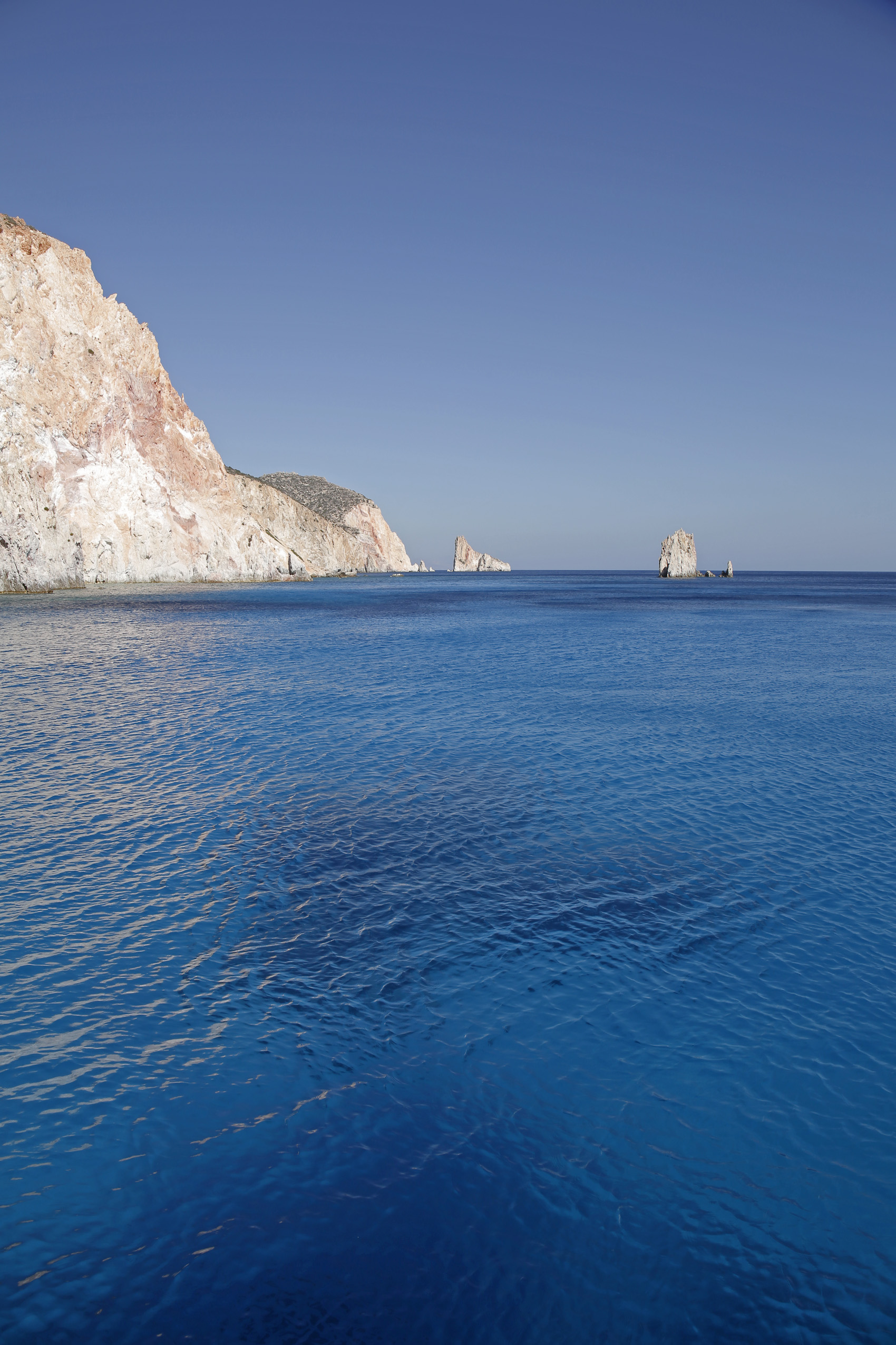 Πράγματι, η Πολύαιγος εντυπωσιάζει με την πρώτη ματιά. Ήδη πριν φτάσεις κοντά της, δηλαδή, το βλέμμα πέφτει με θαυμασμό στα λευκά κατακόρυφα βράχια, τα οποία ορθώνονται επιβλητικά πάνω από μια θάλασσα που μοιάζει σαν γαλανή όαση μέσα στο μπλε των βαθύτερων, πελαγικών νερών του Αιγαίου. Γεωλογικά, το νησί έχει ηφαιστειακή καταγωγή –και το δείχνει στον επισκέπτη του, με τρόπο γοητευτικό για το μάτι.