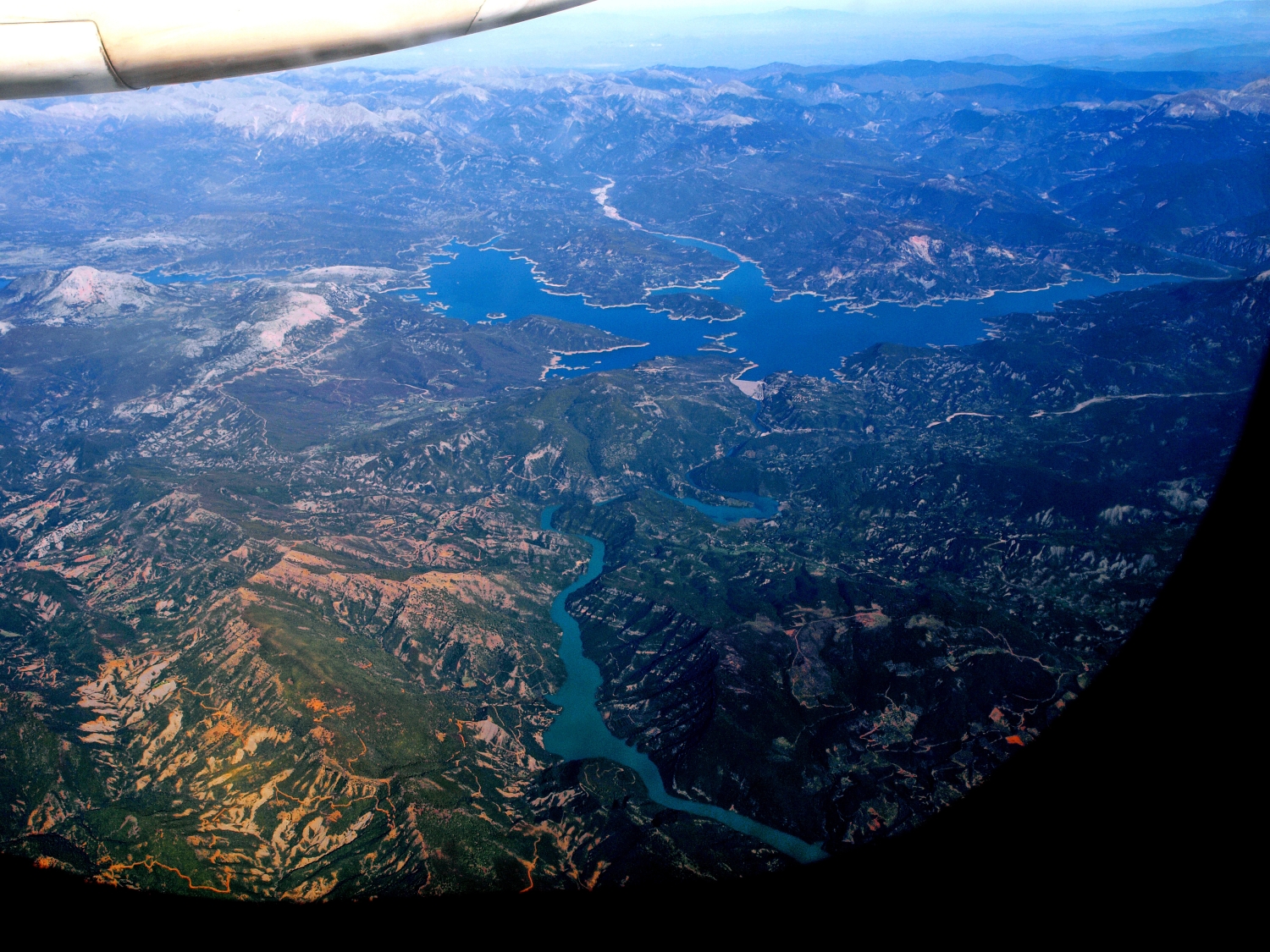 Οι λίμνες, είναι όντως, οι αποφασιστικές στιγμές, τα πιο φωτεινά σημεία, της αιθέριας διαδρομής. Απογειώνεσαι από την Αττική, έχοντας μέσα στο κάδρο του παραθύρου σου τη λίμνη του Μαραθώνα, και ισορροπείς στους αιθέρες πάνω από τον Κορινθιακό και την ακτογραμμή της Στερεάς, με το κόσμημα του Γαλαξιδιού εμφανώς ακουμπισμένο στο βάθος της κοιλότητας. Όταν το βλέμμα διεκδικεί και κερδίζει η λίμνη του Μόρνου, η δεύτερη γαλάζια πινελιά στο χάρτη των πράσινων βουνών, κάτω από το μονοπάτι των δέκα λιμνών. Τεχνητή λίμνη, όπως και οι επόμενες που θα δούμε από τη δεξιά πλευρά του αεροπλάνου όπου τώρα καθόμαστε, μέχρι τη φυσική Παμβώτιδα, που θα προσεδαφιστούμε, σχεδόν, στην επιφάνειά της.
