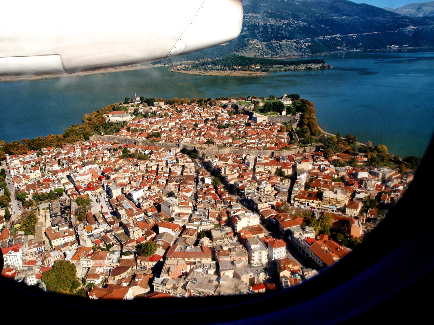 Κατεβαίνουμε στο επίπεδο της κορυφογραμμής των Τζουμέρκων για να απολαύσουμε καλύτερα τους βαθυπράσινους όγκους της οροσειράς της Πίνδου, που γκρεμίζονται μέχρι το ασημένιο βάθος της χαράδρας του Αράχθου κάτω από τη μονή Τσούκας, όταν αρχίζει να εκτυλίσσεται γοργά μέσα στο κάδρο του παραθύρου του αεροσκάφους το ευφάνταστο παιχνίδι των παραλληλόγραμμων χωραφιών και μετά των καλαμιώνων, των ζωντανών ζωνών των νερών και μετά των ίδιων των γλυκών υδάτων της Παμβώτιδας με το περιγεγραμμένο Νησάκι, των ιχνών των ιδιότυπων σκαφών της λίμνης και των βαπορέτων που ταξιδεύουν μέχρι την αποβάθρα του και των χερσονήσων – ακροπόλεων των Ιωαννίνων που ταξιδεύουν φορτωμένες περιώνυμα τζαμιά και μνήμες από καιρούς περασμένους, που όμως φέρνουν γοητεία στο παρόν.