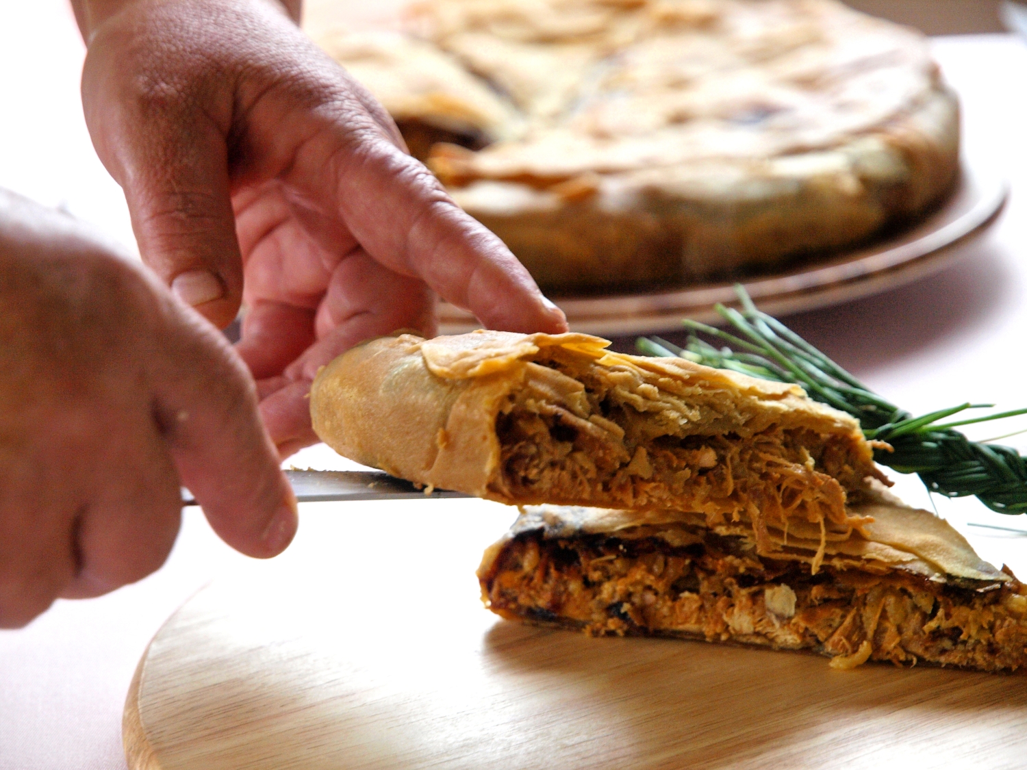 Κάθε εξαιρετική παραδοσιακή ηπειρώτικη πίτα που σέβεται πάνω απ’ όλα την ιστορία της, αρχίζει και τελειώνει με τα αριστοτεχνικά ανοιγμένα λεπτά φύλλα. Για αυτά τα ωραία φύλλα η Φρειδερίκη ζυμώνει μαλακό αλεύρι, αλάτι, ελαιόλαδο, λίγο ξίδι και χλιαρό νερό. Πριν αρχίσει η τελετουργία του ανοίγματος των φύλλων, η ζύμη και η Φρειδερίκη ξεκουράζονται, όσο ο Γιώργος ετοιμάζει τη γέμιση. Ξεκοκαλίζει το ακέραιο κοτόπουλο και κρατά το ζωμό από τα κόκαλα. Τσιγαρίζει σε ελαιόλαδο χοντροκομμένα ξερά κρεμμύδια, τα κομμάτια του κοτόπουλου και φρέσκο κρεμμυδάκι. Συμπληρώνει το ζωμό, αλάτι και πιπέρια, και τα αφήνει όλα μαζί να λειτουργήσουν σιγοβράζοντας για, σχεδόν, μία ώρα. Μόλις αρχίσουν να δένουν μπαίνει η γραβιέρα και λίγο ρύζι, για να απορροφήσει όλα τα υγρά. Στο μεταξύ η Φρειδερίκη έχει αρχίσει να ανοίγει τα φύλλα, και όταν η γέμιση κρυώσει, λαδώνει το ταψί και τα φύλλα, και βάζει τρία κάτω, τη γέμιση και δύο από πάνω. Χαράζει την πίτα σε κομμάτια και τη βάζει σε φούρνο, προθερμασμένο στους 160 βαθμούς, για να ψηθεί μία ώρα.