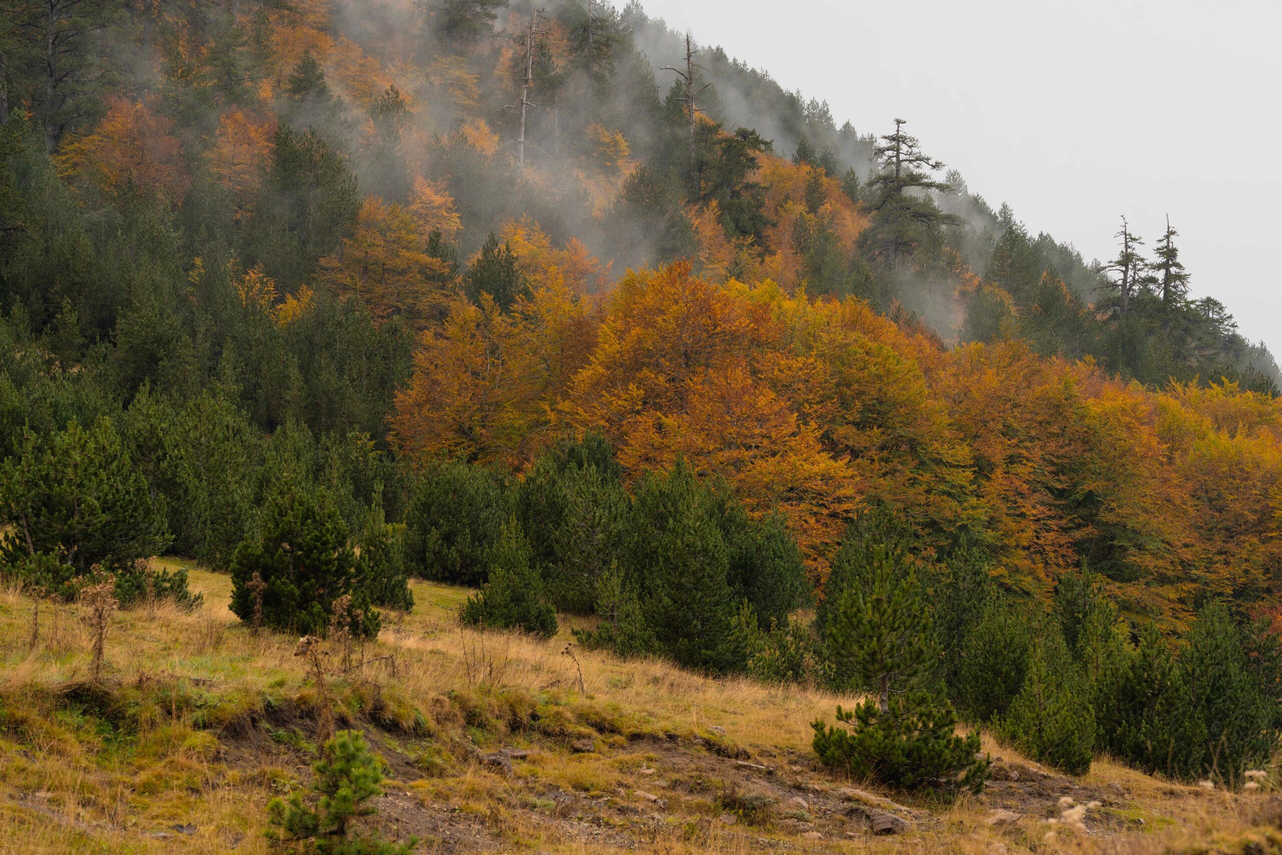 Κι όμως, με μια προσεχτικότερη ματιά στην ατελείωτη χλωρίδα φανερώνεται η πολυποικιλία της. Πλατύφυλλα και κωνοφόρα μπλέκονται μεταξύ τους σε μια πανδαισία χρωμάτων που την εποχή αυτή σφύζει από διακυμάνσεις. Έλατο και σφενδάμη, οξιά και δρυς, μαύρο πεύκο και, όσο αυξάνεται το υψόμετρο, ρόμπολο. Πράσινο, καφετί, πορτοκαλί, κόκκινο. 2.000 και πλέον είδη μορφοποιούν έναν ανάγλυφο πίνακα γεννημένο από χώμα και νερό. «Είναι σαν το δέντρο να φωνάζει δύο χρώματα!», αναφωνεί ο Γιώργος μιλώντας για το αγέρωχο ρόμπολο, ή αλλιώς ασπρόπευκο. «Θα προσέξετε πως ο κορμός του δεν είναι σχηματισμένος σε φέτες, αλλά σε φολίδες. Είναι είδος πεύκου που δεν αναπτύσσεται ποτέ σε συστάδα. Ένα βρίσκεις εδώ, ένα πιο εκεί, διάσπαρτα», τονίζει, συμπληρώνοντας πως το προτιμούν εταιρείες καλλυντικών για δείγματα και εκχύλισμα.