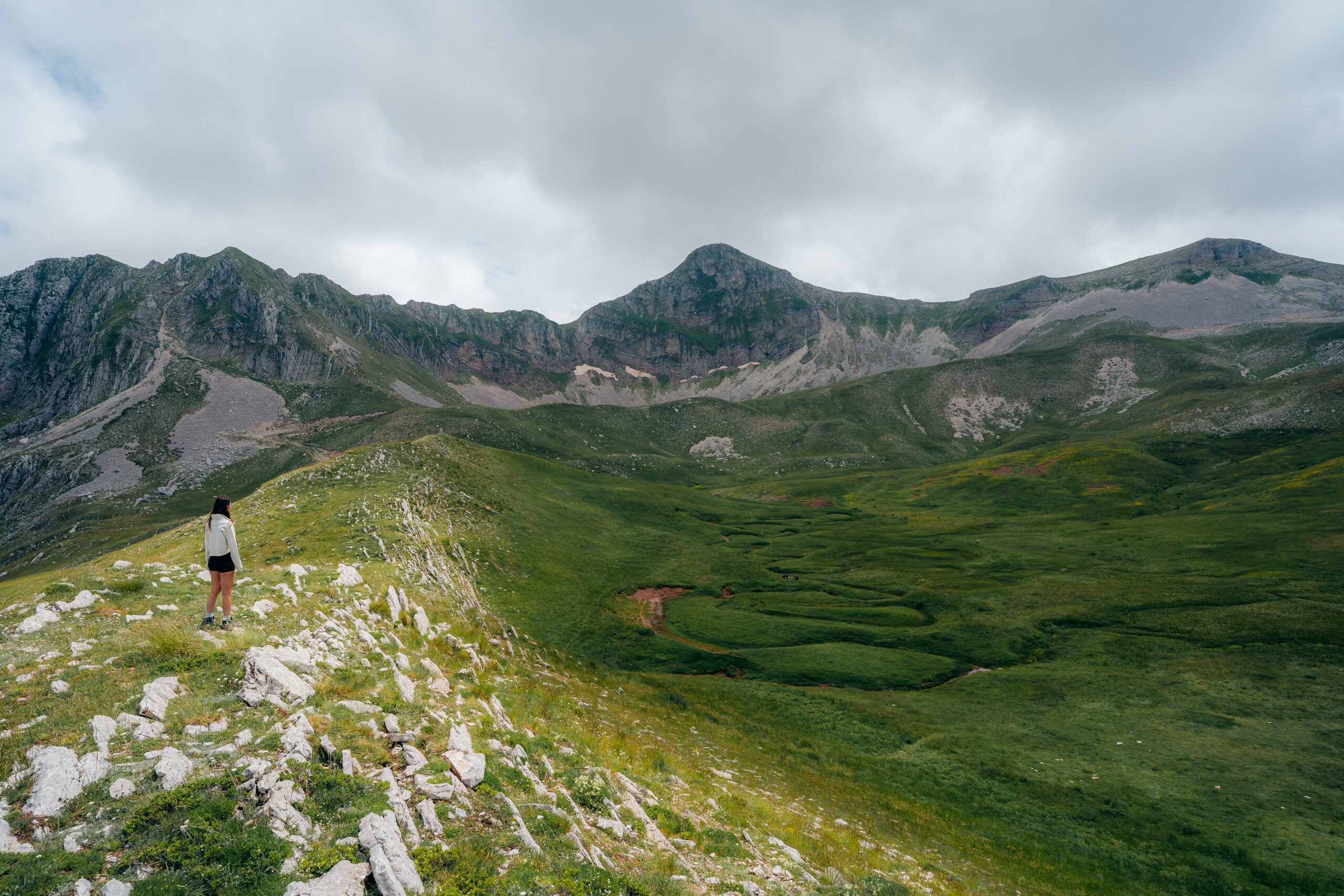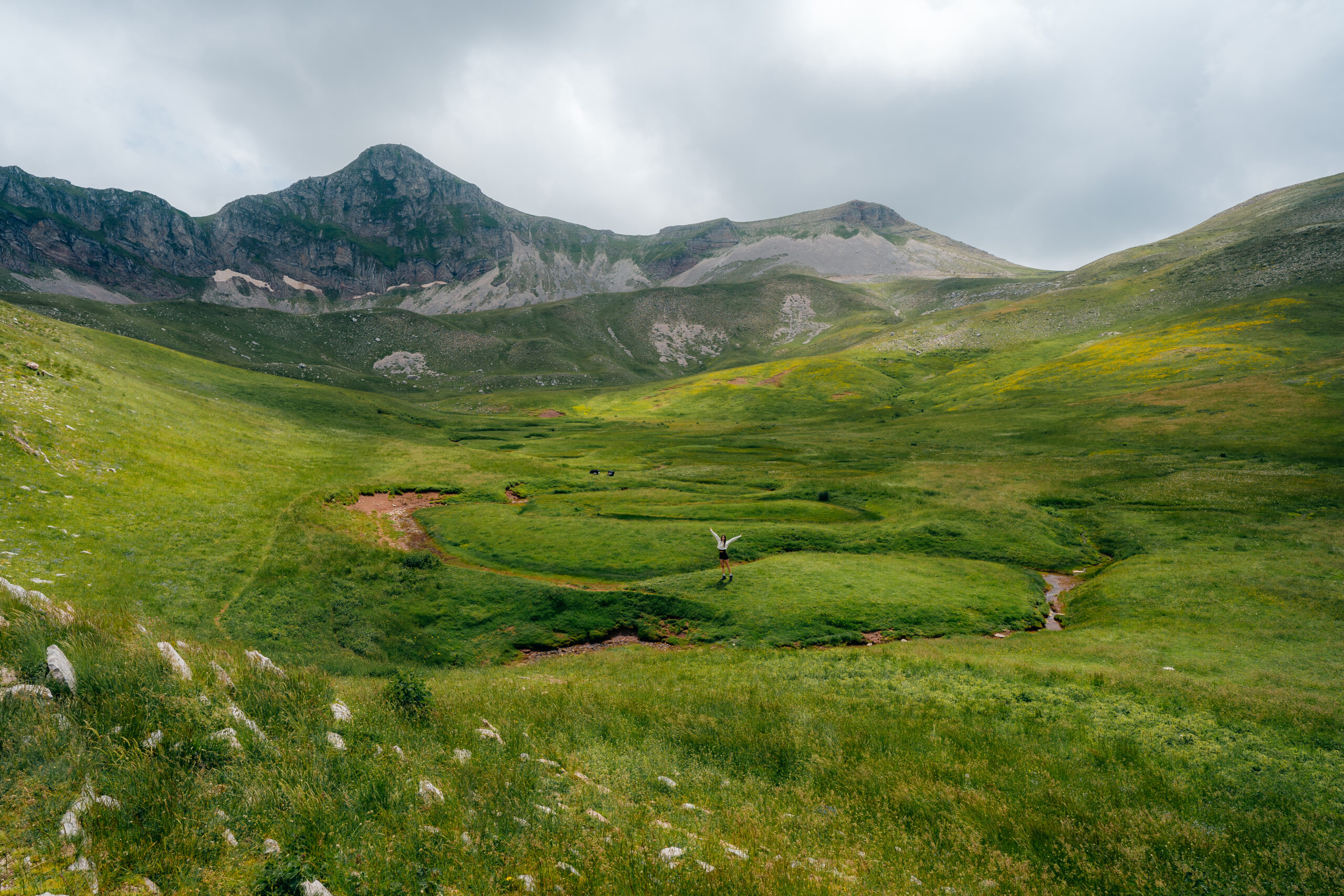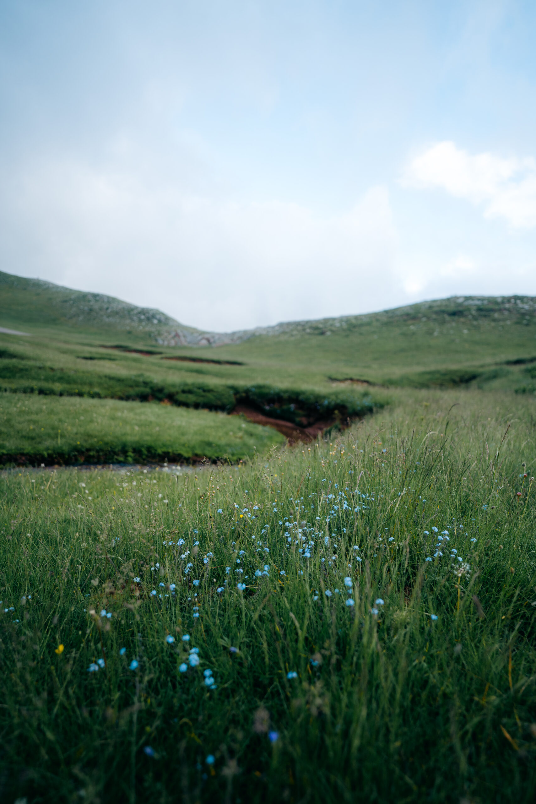 Παρότι τα μέρη αυτά χρησιμοποιούνται ως βοσκοτόπια, το έδαφος τους ευδοκιμεί την πλούσια ύπαρξη χλωρίδας και πανίδας. Ανάμεσα στο πράσινο του οροπεδίου καθίσαμε για να παρατηρήσουμε τα σκορπισμένα μικρά αγριολούλουδα, γαλάζιοι κρόκοι (Crocus veluchensis) και κίτρινες νεραγκούλες (Ranunculus acris), που ξεπετάγονταν διάσπαρτα και συνέθεταν ένα χρωματιστό χαλί.