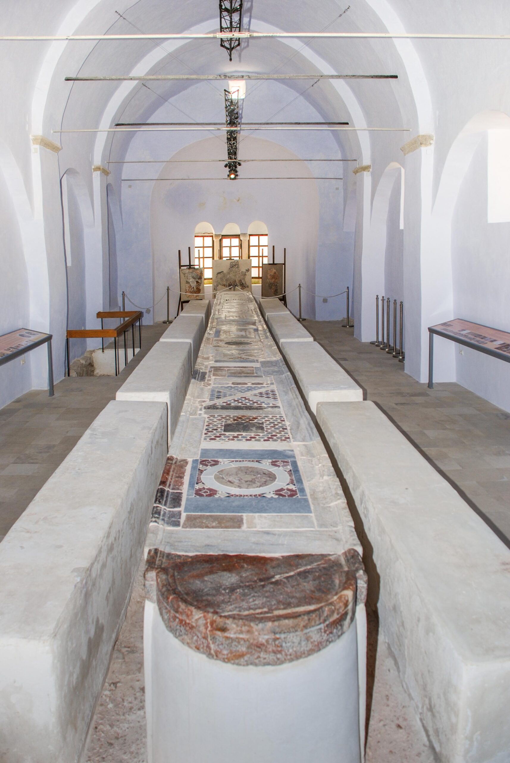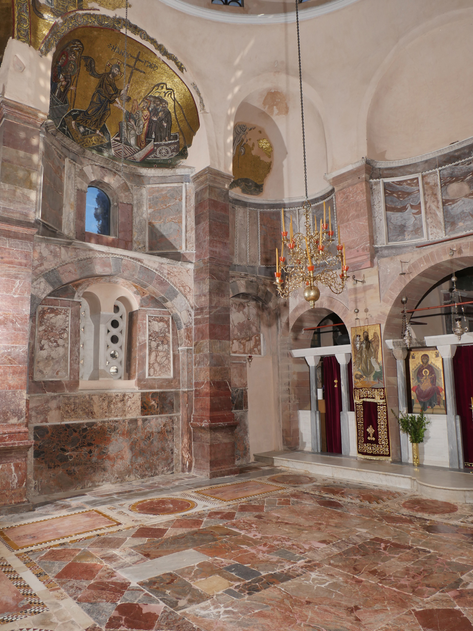 Την ίδια τύχη είχαν και οι 32 συνολικά μαρμάρινες κολώνες, όπως και το μαρμάρινο τέμπλο που χώριζε τον κυρίως ναό από το Άγιο Βήμα, ενώ κάποιες από τις τοιχογραφίες εκτίθενται σήμερα στο Βυζαντινό Μουσείο, στη Χώρα της Χίου. Απαράμιλλης τέχνης ήταν και το δάπεδο, διακοσμημένο με την τεχνική των Κοσμάτι, που σπάνια απαντάται στη χώρα μας, με ψηφίδες πολύχρωμων μαρμάρων -κυρίως σε πορφυρές, λευκές και μαύρες αποχρώσεις- να σχηματίζουν περίπλοκα, συμμετρικά γεωμετρικά μοτίβα γύρω από πέντε ένθετους στο δάπεδο, μαρμάρινους δίσκους – αριθμός που συμβολίζει το θαύμα των πέντε πολλαπλασιασθέντων άρτων.