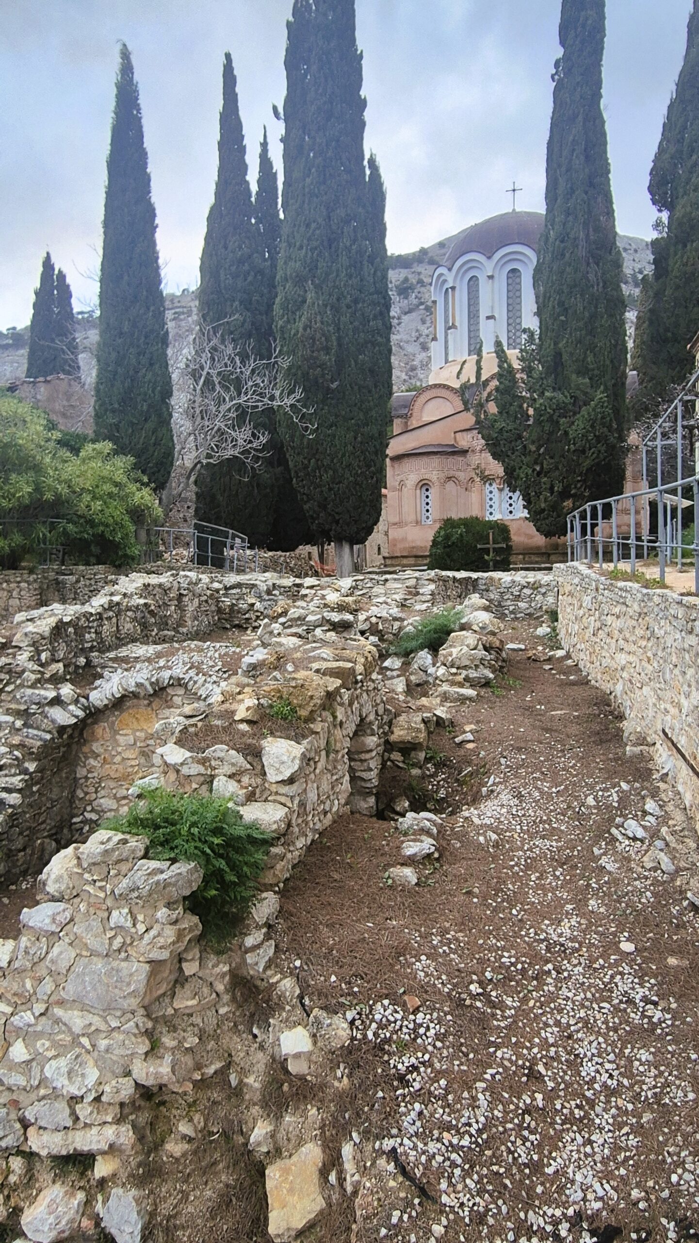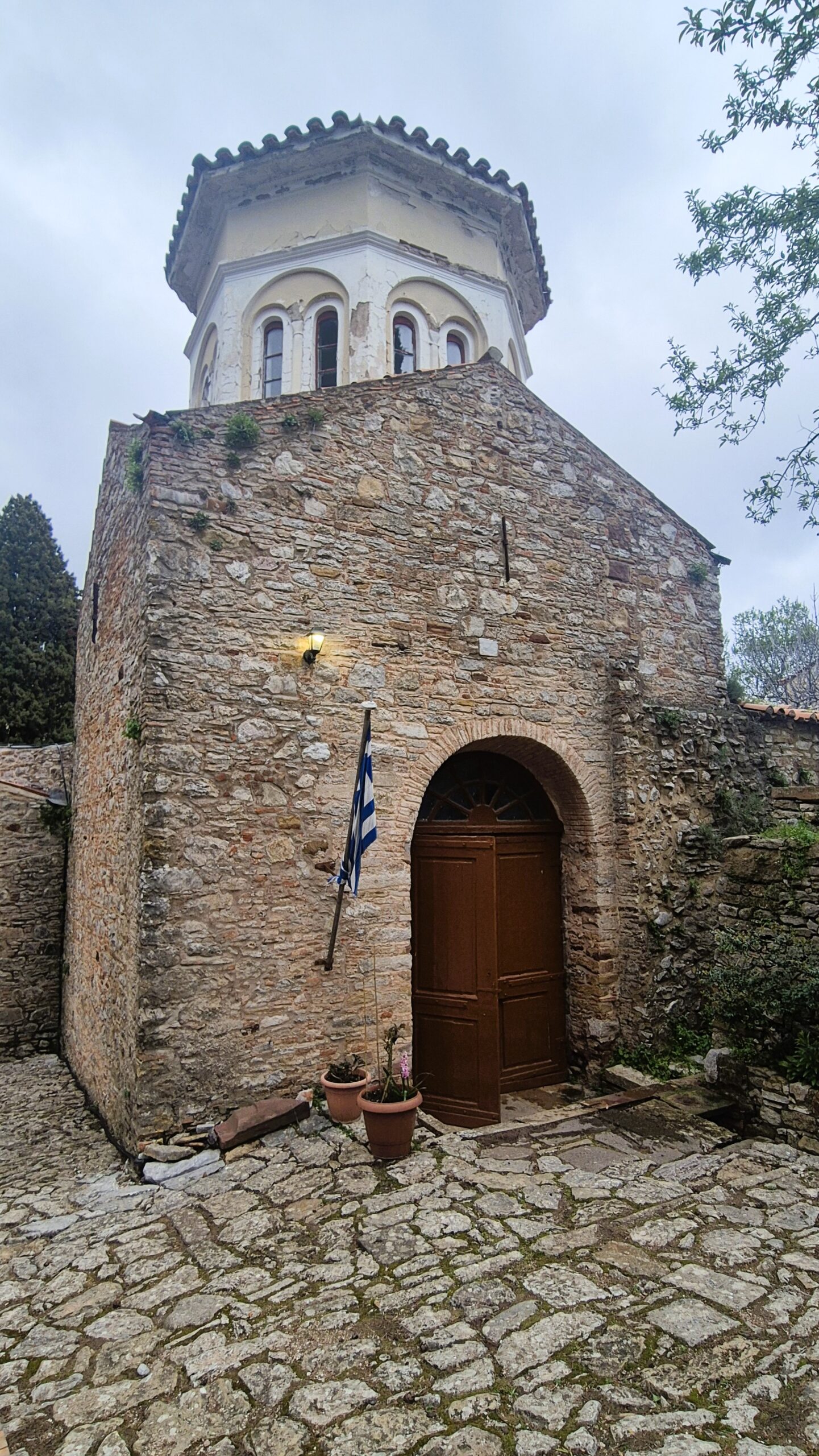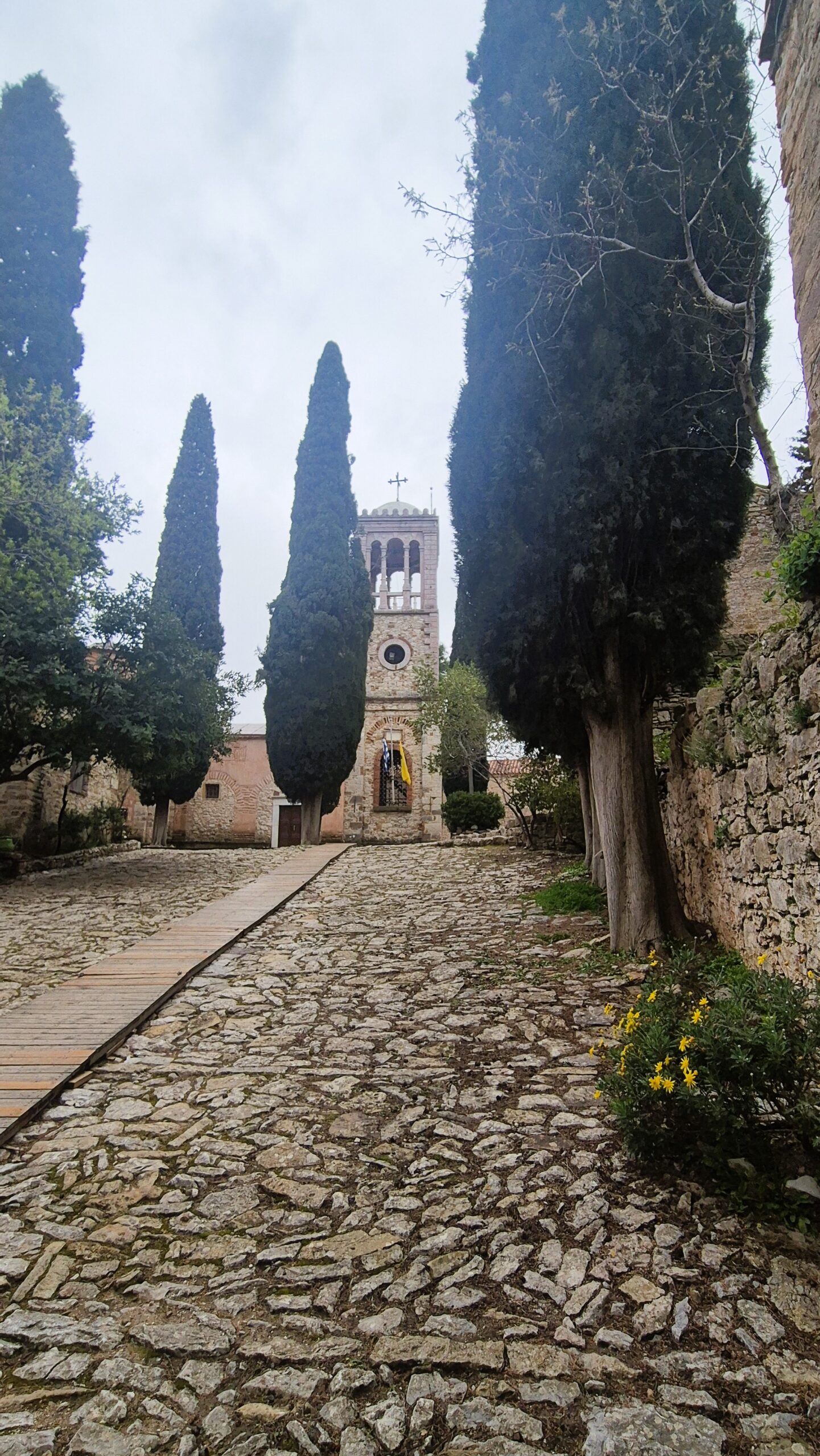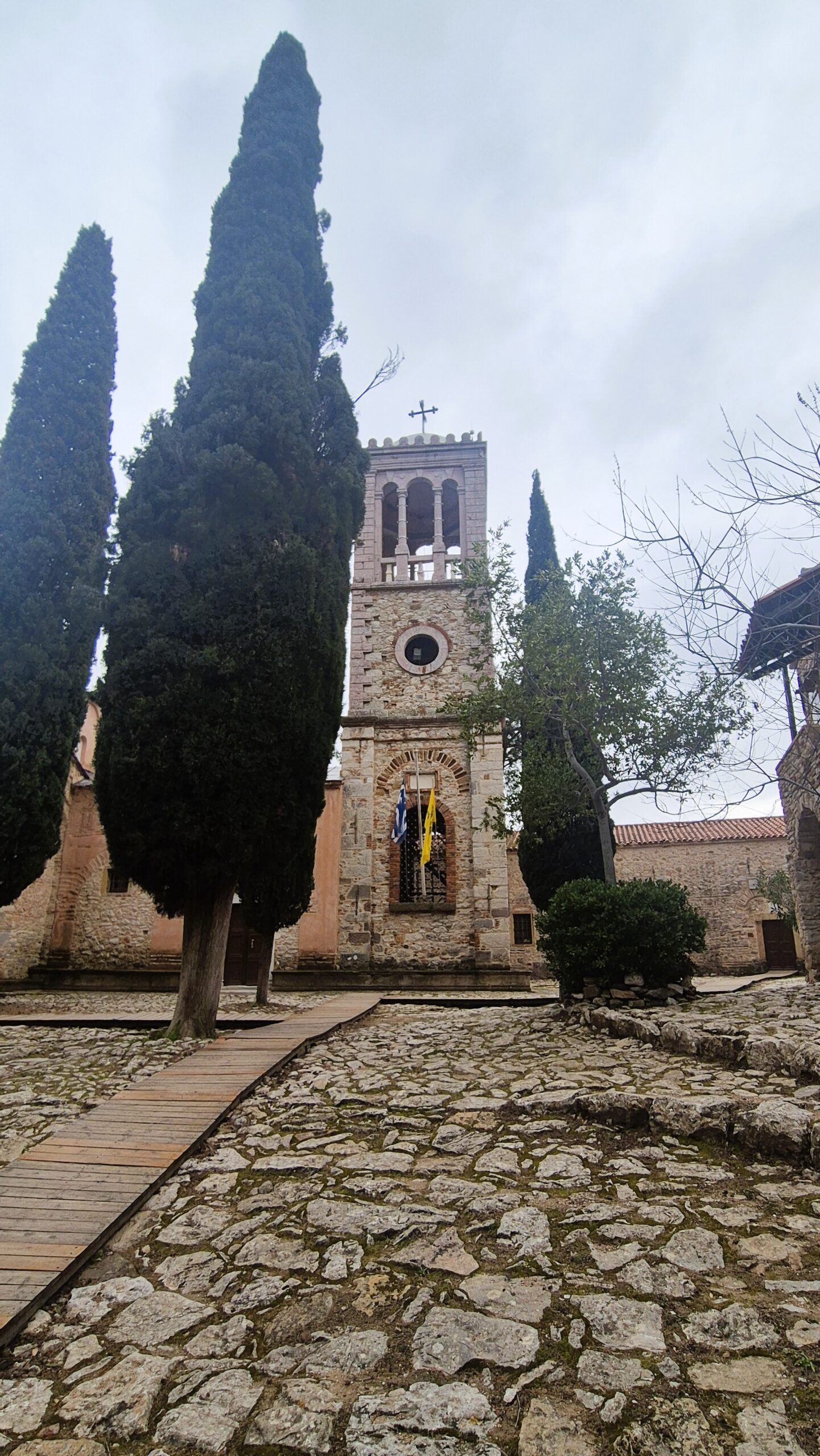 Τα υπόλοιπα κτίσματα της αυλής μοιάζουν πια χωρίς ζωή, καθώς εδώ μονάζει πλέον μόνο μία καλόγρια. Το καμπαναριό ανοικοδομήθηκε το 1900 αντικαθιστώντας εκείνο του 1512, ενώ στην άλλη πλευρά απ΄όπου η υπέροχη θέα κατηφορίζει από την πλαγιά ως το Αιγαίο, αρχαιολογικές ανασκαφές φέρνουν στο φως ερείπια της ανατολικής πτέρυγας των κελιών των μοναχών. Κι αν από την αρχική Τράπεζα του 11ουαιώνα σώζεται μόνο μια ημικυκλική αψίδα, εντύπωση προκαλεί το αυθεντικό τραπέζι της εποχής εκείνης, που πλησιάζει σε μήκος τα 16 μέτρα και παρουσιάζει παρόμοιο μαρμάρινο διάκοσμο με το δάπεδο του Καθολικού.
