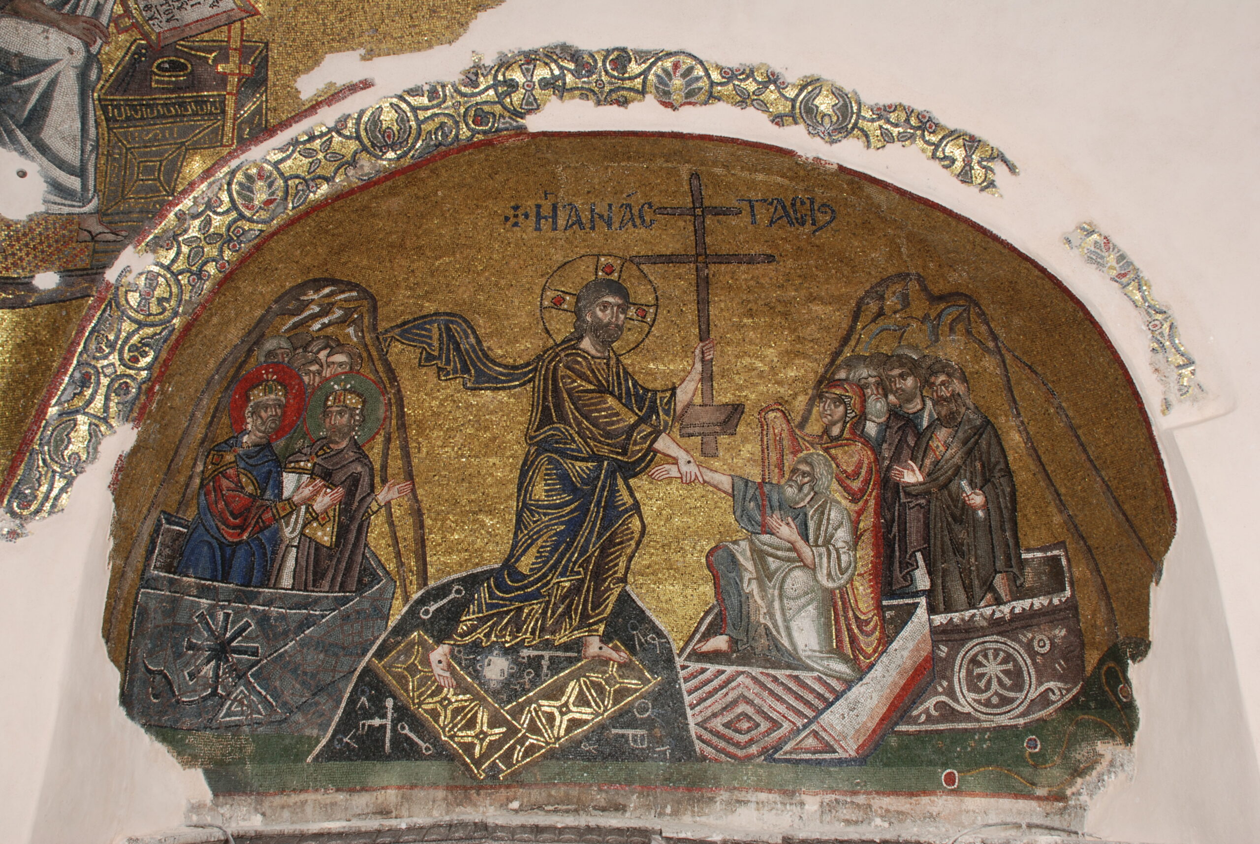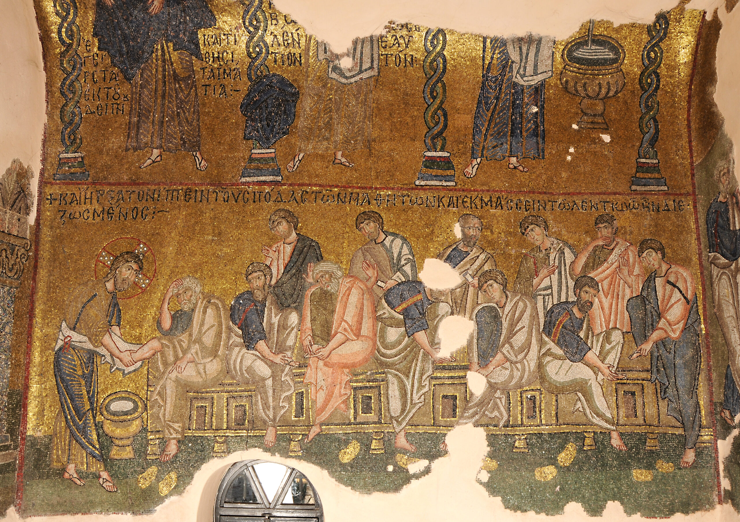 Τα μωσαϊκά της φιλοτεχνήθηκαν από κορυφαίους ψηφιδογράφους, ίδιας σχολής με της Αγίας Σοφίας στην Κωνσταντινούπολη, λάμποντας σαν χρυσάφι καθώς το φως εισέβαλε από τα παράθυρα του Καθολικού. Ωστόσο, η προσέγγιση στην απόδοση των μορφών θεωρείται νεωτεριστική για την εποχή και οι μικρές, πολυεδρικές λίθινες ή και γυάλινες ψηφίδες αποδίδουν με ιδιαίτερη λεπτομέρεια και πνευματικότητα, πρόσωπα και σκηνές από τη ζωή του Ιησού: οι Ευαγγελιστές Ιωάννης και Μάρκος, η Πλατυτέρα, άγιοι και άγγελοι, καθώς και η Βάπτιση, η Σταύρωση, η Ανάσταση, η Μεταμόρφωση του Σωτήρος και η Αποκαθήλωση. Καθώς ο τρούλος κατέπεσε πλήρως στον καταστροφικό σεισμό του 1881, δεν υπάρχει καμία ένδειξη για την ψηφιδωτή παράσταση που τον στόλιζε.