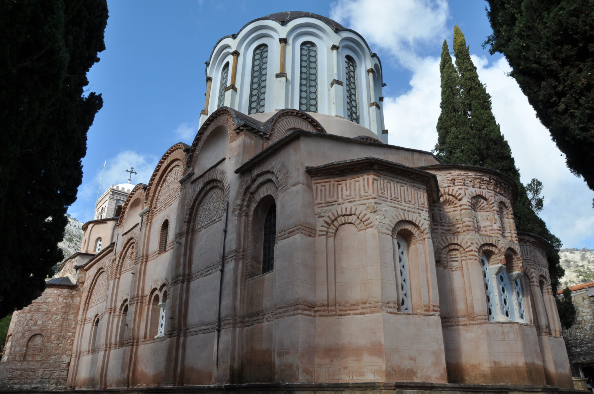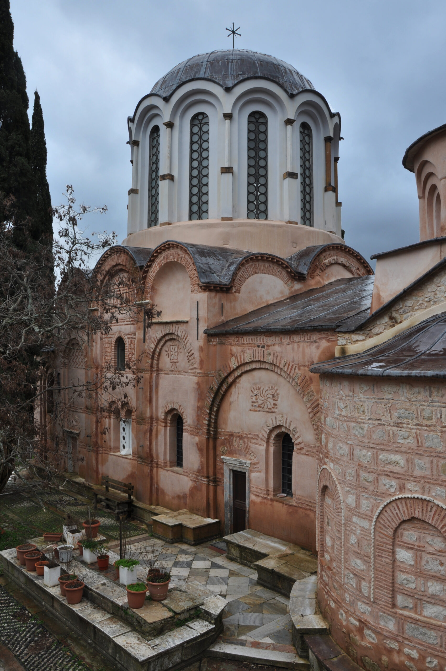 Το περιτειχισμένο κατά τα βυζαντινά πρότυπα μοναστήρι, αποτελούνταν από μια σειρά κτισμάτων που περιέβαλαν το Καθολικό, την κύρια εκκλησία της μονής. Ανάμεσα στις πτέρυγες των μοναστικών κελιών, στην Τράπεζα όπου γευμάτιζαν από κοινού οι μοναχοί, στη μαρμάρινη κινστέρνα για τη συλλογή του βρόχινου νερού, στο Συνοδικό, στα δύο παρεκκλήσια και στον αμυντικό πύργο των τειχών που προστάτευε τη μονή, δέσποζε όπως και σήμερα το Καθολικό με το τετράγωνο σχέδιο που φέρει ως επιστέγασμα τρούλο οκτώ πλευρών. Το αρχιτεκτονικό σχέδιο της Μονής υπήρξε πρότυπο για μεταγενέστερες εκκλησίες, αλλά ήταν ο εκπληκτικός της διάκοσμος που την έχει αναδείξει σε κορυφαίο μνημείο.