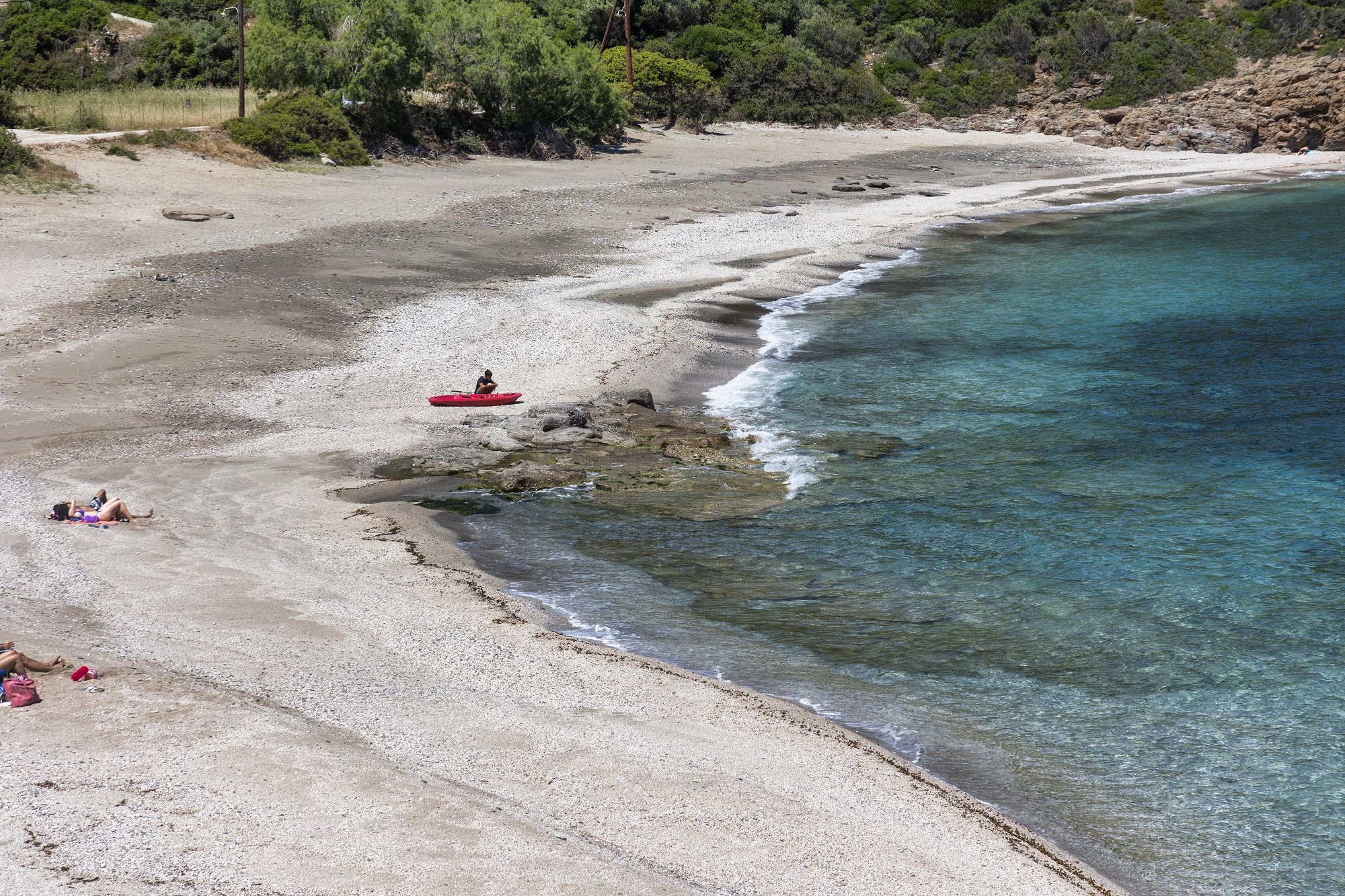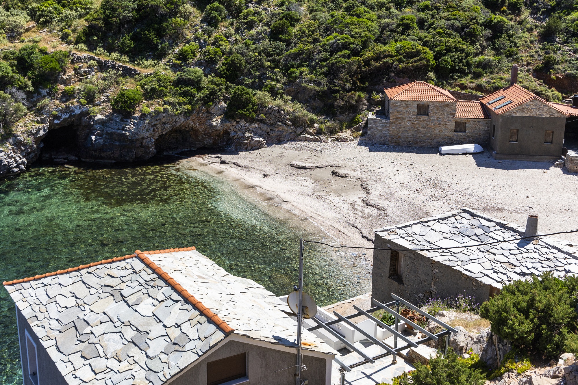Στην αριστερή μεριά βρίσκεται θαλασσινή σπηλιά με βράχια για βουτιές, στα δεξιά υπάρχουν ταβέρνες, από τις οποίες ξεχωρίζει «Ο Γιώργος» (6932771777). Το τρίπτυχο κλείνει με το Αλμυρίχι: μια μικρή, απάνεμη, τιρκουάζ παραλία με δύο θαλασσινές σπηλιές στην άκρη (έχουν σκιά), στις οποίες φθάνετε περπατώντας μέσα στο ρηχό νερό. Είναι προστατευμένη από τον αέρα κι έχει λευκό, ψιλό βοτσαλάκι. Καλό ελληνικό φαγητό στο γραφικό ταβερνάκι «Cavo Armirihi» (6949912936, 6983041016), θα βρείτε όμως κι ένα χαριτωμένο καφέ-μπαρ.
