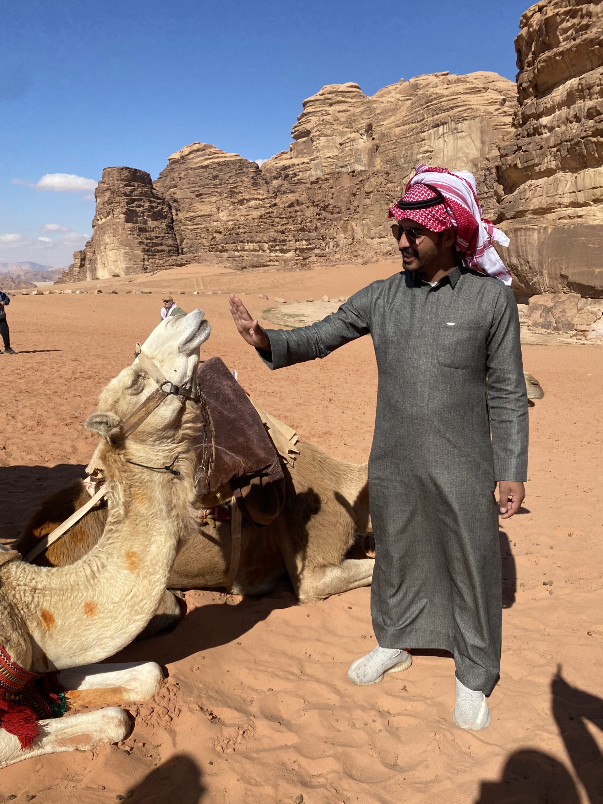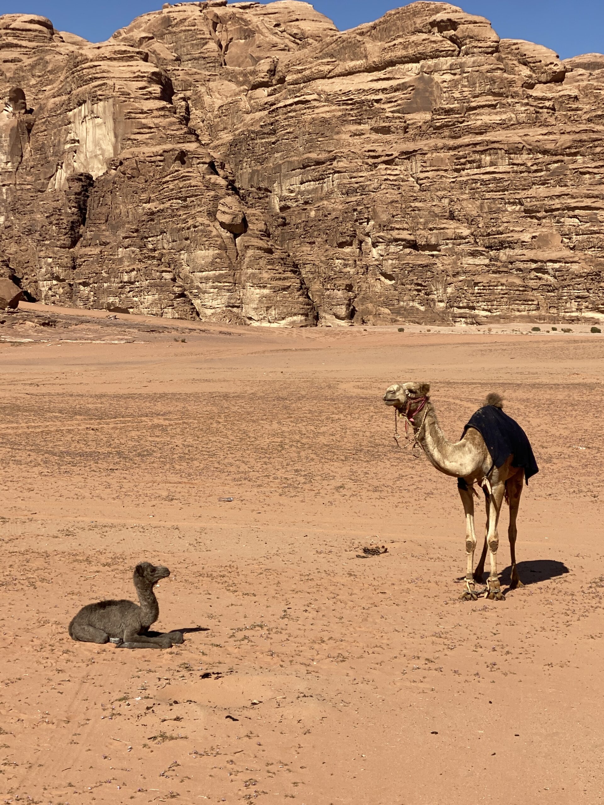 Θα σταθώ ωστόσο στην εικόνα μίας καμήλας που έχει δίπλα της το δύο ημερών μωρό της. Με το που αντιλαμβάνεται την παρουσία μας, γίνεται αμέσως πιο προστατευτική απέναντι στο μικρό καμηλάκι. Συνεχίζουμε το οδοιπορικό μας σε αυτό τον προστατευόμενο και χαρακτηρισμένο από την Unesco ως Μνημείο Παγκόσμιας Κληρονομιάς και κάνουμε μία ακόμη στάση. Ο συνοδός μας εδώ, ο Βεδουίνος Yanal, θα μας πάει σε ένα σημείο όπου η σύσταση των βράχων είναι τέτοια που θεωρείται το ιδανικό υλικό για τον καλλωπισμό του προσώπου. Θα βγάλουμε φωτογραφίες μπροστά σε έναν βράχο που παρομοιάζεται με το ανθρώπινο πρόσωπο και θα σταματήσουμε στη μέση της διαδρομής σε ένα χώρο που σερβίρουν τσάι. Θα περπατήσουμε πάνω στην άμμο, βιώνοντας αυτή τη μοναδική εμπειρία και θα ανέβουμε σε ένα λόφο για ακόμη καλύτερη θέα. Θα ανέβουμε στις καμήλες και θα φθάσουμε σε ένα σημείο για να δούμε το ηλιοβασίλεμα να χάνεται πίσω από τα βουνά.