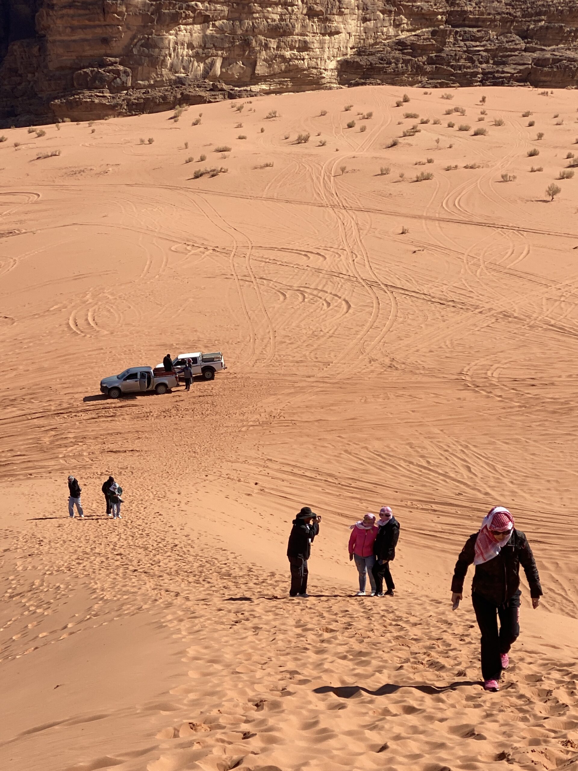 Το επόμενο πρωί, και αφού πέρασα από την αίθουσα πρωινού του ξενοδοχείου, αισθάνομαι πραγματικά έτοιμος για το ταξίδι των σχεδόν 4 ωρών με το λεωφορείο με προορισμό την έρημο Wadi Rum. Αφού αλλάξαμε λεωφορείο, γιατί το μικρό δεν χωρούσε εμάς αλλά και τα πράγματα είμαστε στην ενδοχώρα της Ιορδανίας και κατευθυνόμαστε νότια. Όσο απομακρυνόμαστε από την πρωτεύουσα, το σκηνικό διαφοροποιείται. Μικρά χωριά με υποτυπώδεις υποδομές, απέραντες ευθείες σε ένα δρόμο που οδηγεί στην Άκαμπα, τη μοναδική έξοδο της χώρας στη θάλασσα. Κάνουμε μία στάση στη διαδρομή. Αυτό που εδώ το λέμε ΣΕΑ, εκεί είναι λίγο διαφορετικό. Εκτός από τα βασικά, καφέ, χυμούς και φαγητό σε μπουφέ, με standard τιμή, περίπου 11 ευρώ, εδώ θα βρείτε άπειρα αναμνηστικά αλλά και ολόκληρα σαλόνια με φίλντισι της τάξης των 20 και 25 χιλιάδων ευρώ. Ναι, καλά διαβάσατε. Ο Saleem μου λέει ότι «έρχονται Αμερικανοί και περνάνε την κάρτα και τους τα στέλνουν με φορτωτική στην πόρτα τους». Όσο μιλούσαμε για αυτά, μας είδε κάποιος από το μαγαζί και πλησίασε. Κατάλαβε ότι δεν… και μας άφησε!