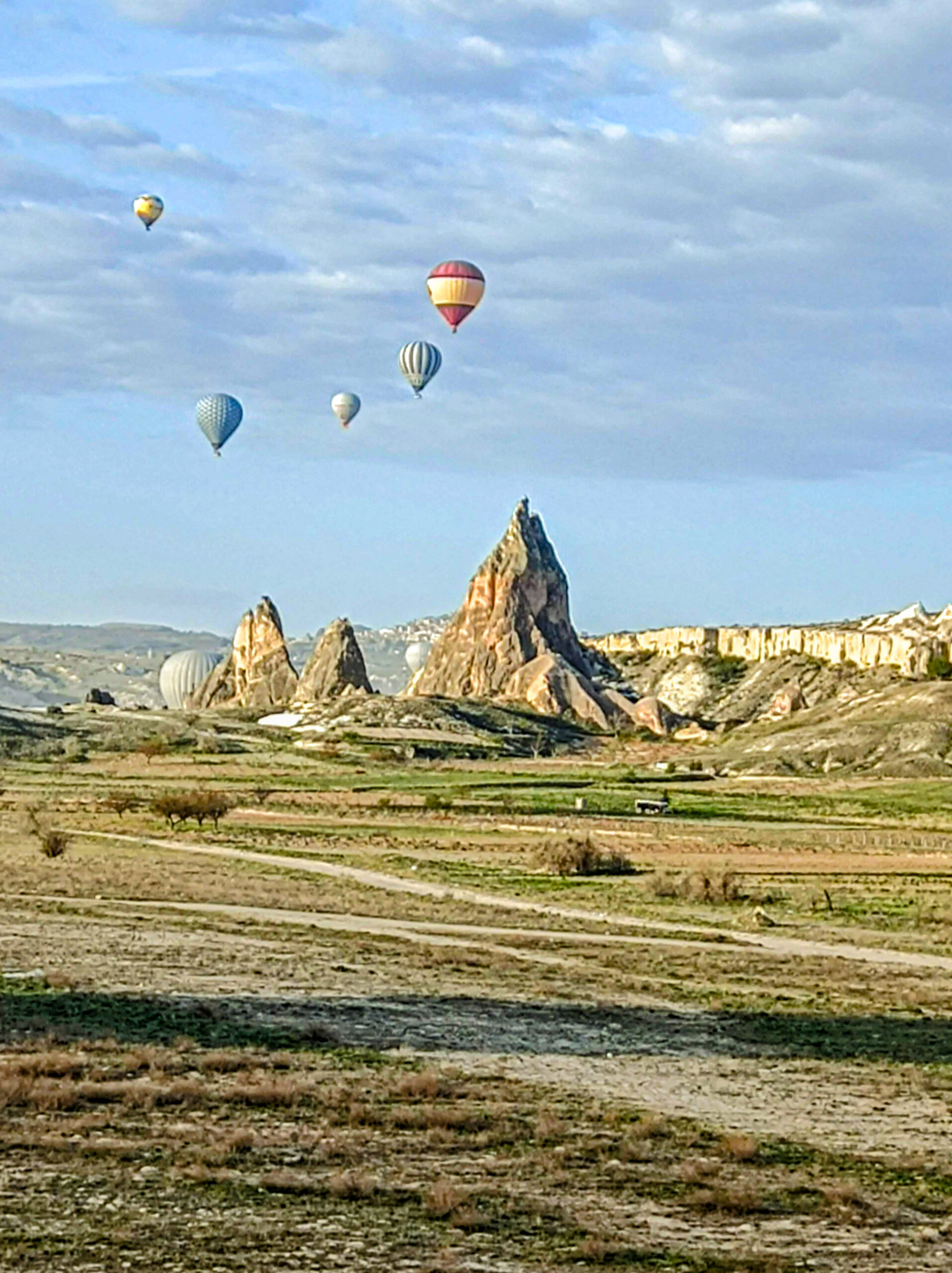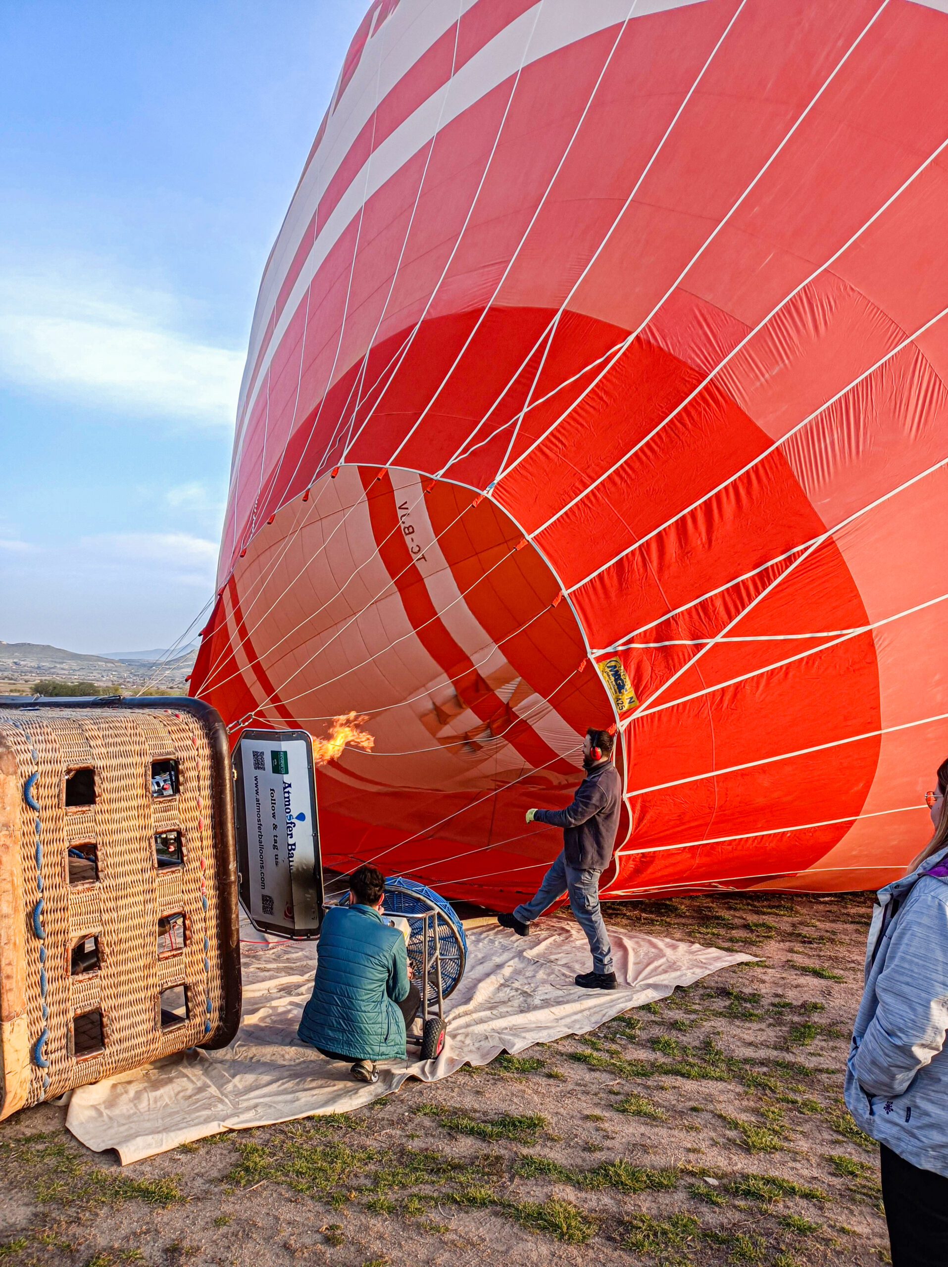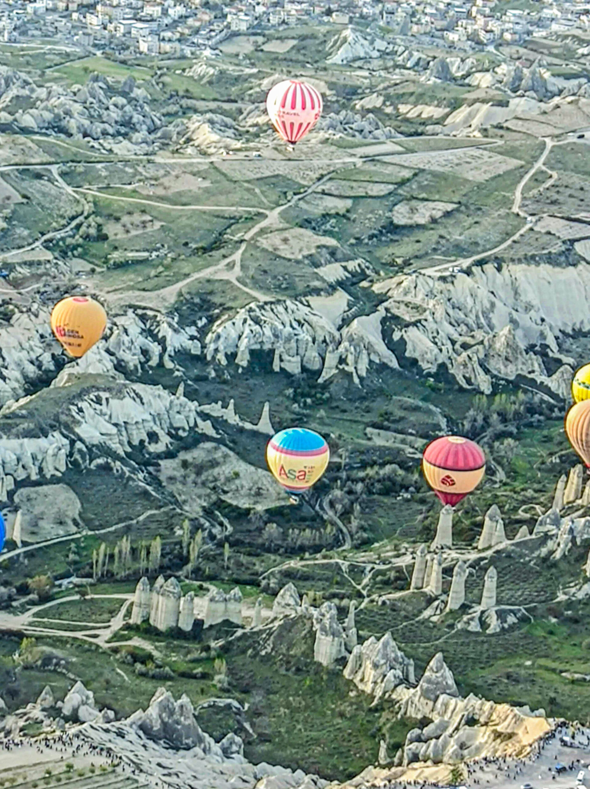 Το highlight του ταξιδιού μας στην Καππαδοκία είναι αναμφισβήτητα η πτήση με αερόστατο την ώρα που ο ήλιος ζωγραφίζει τον ουρανό με αποχρώσεις πορτοκαλί και ροζ πάνω από κοιλάδες διάσπαρτες με ηφαιστειακούς κώνους και αρχαία χωριά. Αυτό που την κάνει ξεχωριστή είναι τόσο το σεληνιακό τοπίο όσο και τα υπόλοιπα αερόστατα που αιωρούνται πάνω από τις κοιλάδες προσφέροντας μια μοναδική εμπειρία που μένει αξέχαστη. Ξυπνάμε λοιπόν στις 4 το πρωί και κατευθυνόμαστε με ένα βαν προς το Γκιόρεμε εκεί όπου εδρεύουν όλες οι εταιρίες με τα αερόστατα. Κατά τις 6:30 το πρωί, λίγο πριν εμφανιστεί ο ήλιος, ήμασταν στον αέρα. Μια μαγευτική βόλτα με ξενάγηση στον αέρα για μιάμιση ώρα που σου επιτρέπει να δεις το ανάγλυφο του εδάφους. Κινητήριος δύναμη ήταν ο άνεμος με τον πιλότο να ανεβάζει και να κατεβάζει το αερόστατο χρησιμοποιώντας τις δεξαμενές αερίου. Κάποια στιγμή που έχουμε πάρει ύψος μας λέει ο πιλότος ότι βρισκόμαστε ήδη στα 1000 μ. πάνω από το έδαφος. Προσγειωνόμαστε δίπλα από την Κοιλάδα του Έρωτα, σε ένα περιβάλλον που οι σχηματισμοί πετρωμάτων θυμίζουν φαλλικές κατασκευές -σαν ένα μνημείο προς τιμή της ανδρικής γονιμότητας. Εκεί οι διοργανωτές ανοίγουν σαμπάνια για να γιορτάσουμε την επιτυχία της πτήσης. Επιστρέφουμε στο ξενοδοχείο για πρωινό και στην συνέχεια αναχωρούμε για την Καισάρεια, στην πρωτεύουσα της Καππαδοκίας.