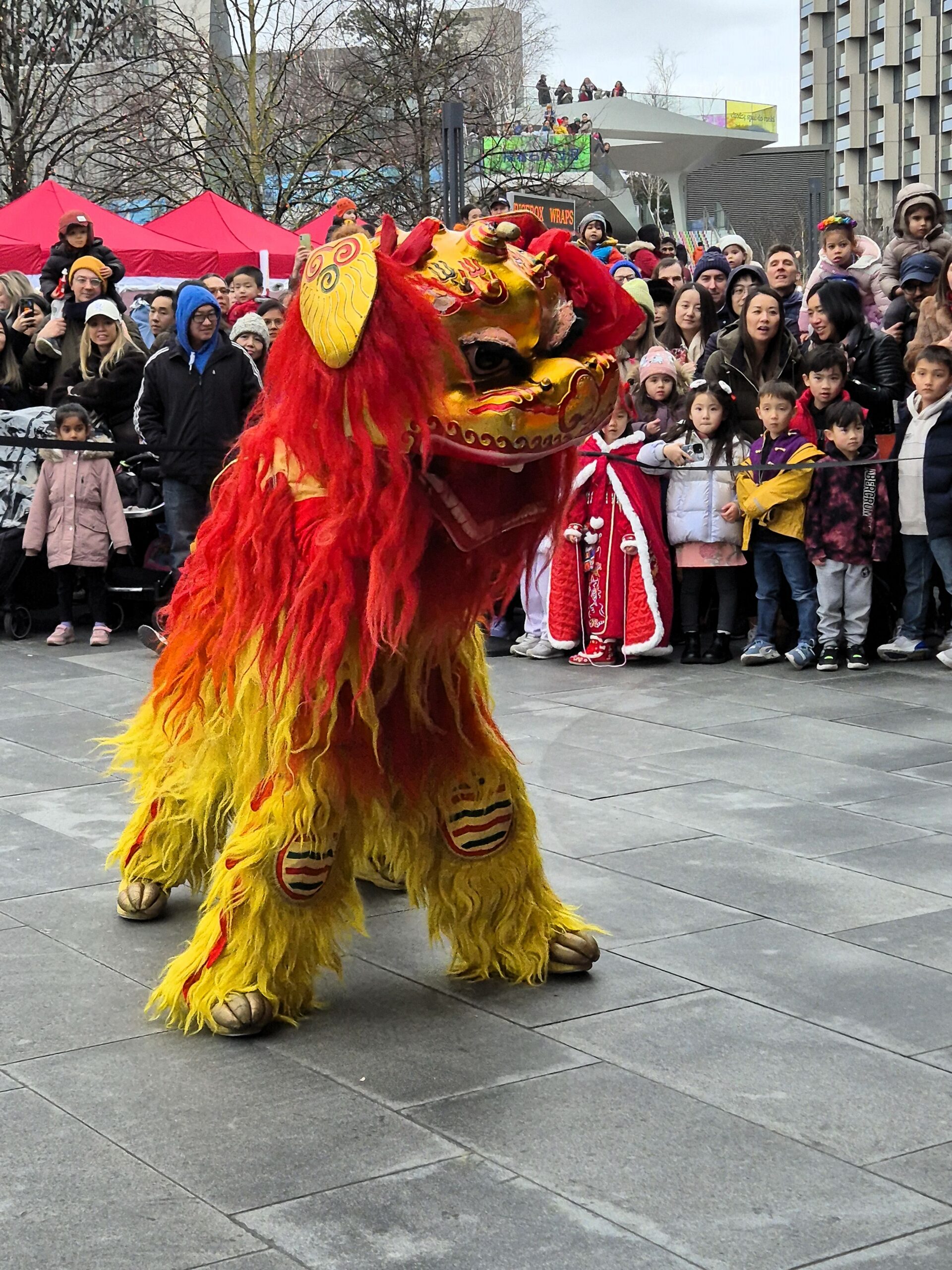 Κανείς, όμως, δεν έλειψε τη στιγμή που ήχησαν τύμπανα και κρουστά, ανακοινώνοντας την άφιξη των εντυπωσιακών -και καθόλου τρομακτικών- λεόντων αρχικά, και έπειτα του μεγάλου φιδιού, εκπροσώπου της νέας χρονιάς. Η μικρή κλίμακα και η οικεία ατμόσφαιρα της παράστασης έδιναν την ευκαιρία σε όλους να παρακολουθήσουν από πολύ κοντά το show, ενώ οι χορευτές πλησίαζαν τα φανταχτερά ερπετά στα παιδιά, που δεν φάνηκαν να τρομάζουν καθόλου. Κι όταν η παραδοσιακή μουσική σίγασε, τα ηνία πέρασαν στους DJs, που φρόντισαν να διατηρήσουν τη διάθεση όλων εξίσου ανεβασμένη.