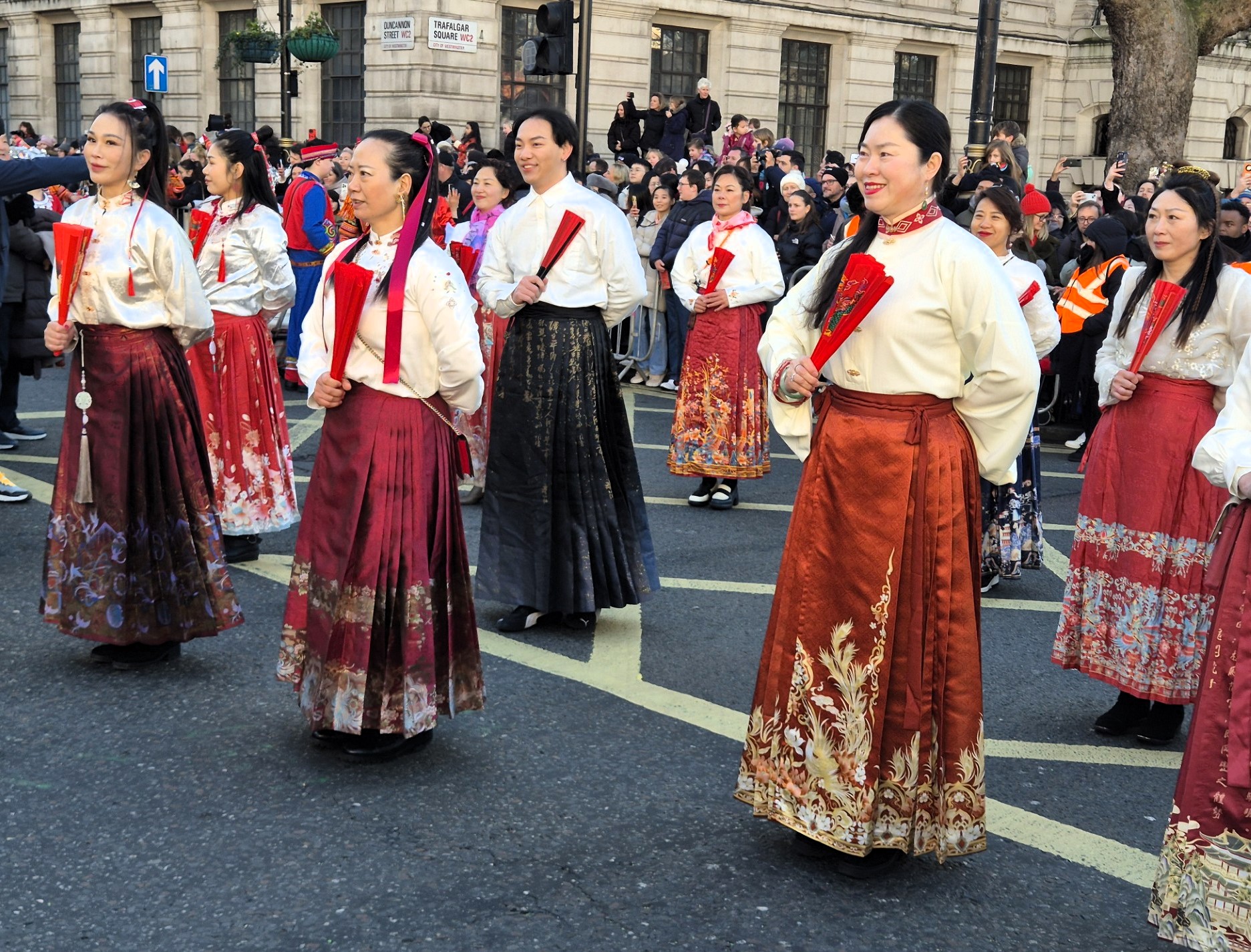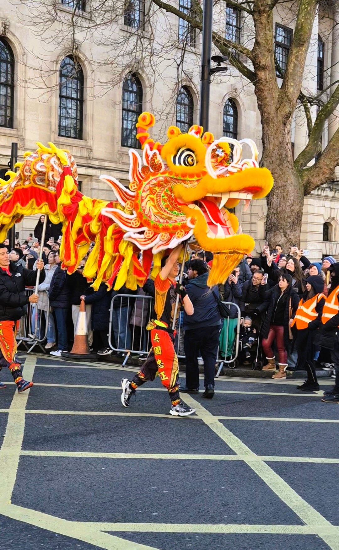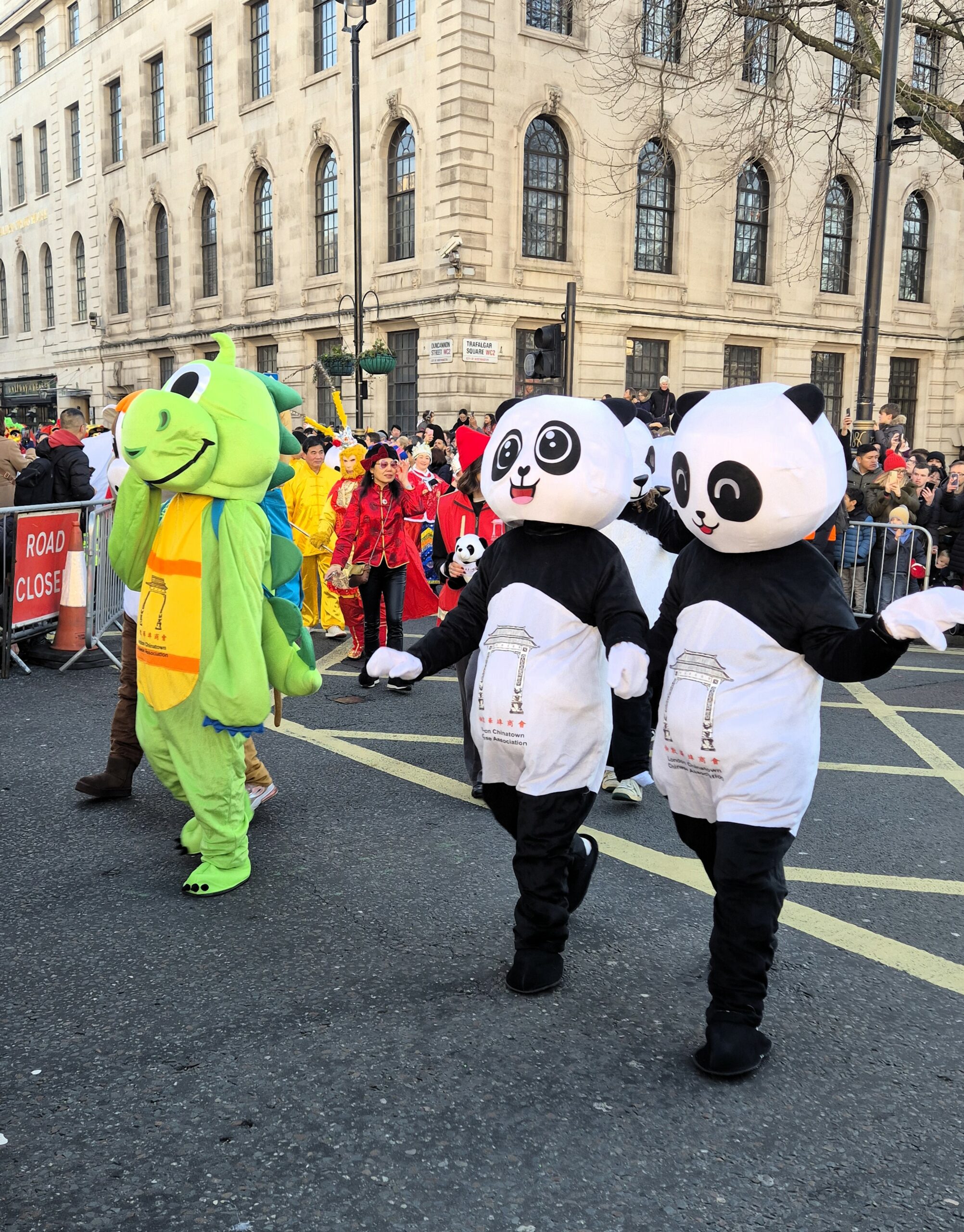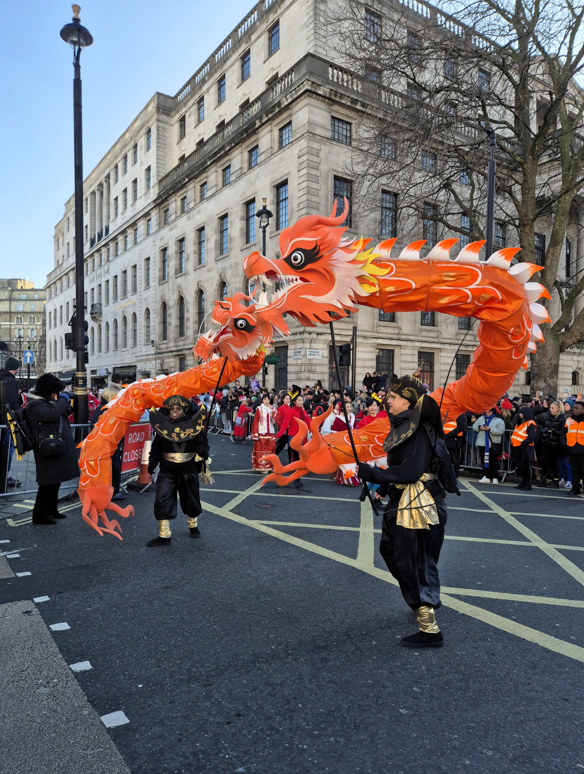 Παρά το γεγονός ότι η θερμοκρασία ξεπερνούσε το μηδέν μόλις κατά έναν βαθμό, ο άστατος λονδρέζικος καιρός μάς έκανε τη χάρη, κρατώντας μακριά τα σύννεφα και τη βροχή και χαρίζοντάς μας μια λαμπερή, ηλιόλουστη -αν και παγωμένη- Κυριακή. Το πλήθος, από τις εννιά το πρωί έως τις δέκα, είχε ήδη κατακλύσει την περίμετρο της μεγάλης πλατείας, τα σκαλιά της εκκλησίας St Martin in the Fields -της οποίας η καμπάνα δεν έπαψε να ηχεί χαρούμενα- και απλωνόταν έως το Cambridge Circus, όπου θα γινόταν η στάση για το πρώτο χορευτικό νούμερο. Όσο δε κατέφθαναν τα άρματα, τόσο ο ενθουσιασμός μεγάλωνε, και οι χάρτινοι δράκοι ή τα λούτρινα χρυσοκόκκινα φίδια, που πωλούνταν στους πάγκους της Chinatown, ανέμιζαν χαρούμενα στα χέρια των παιδιών.