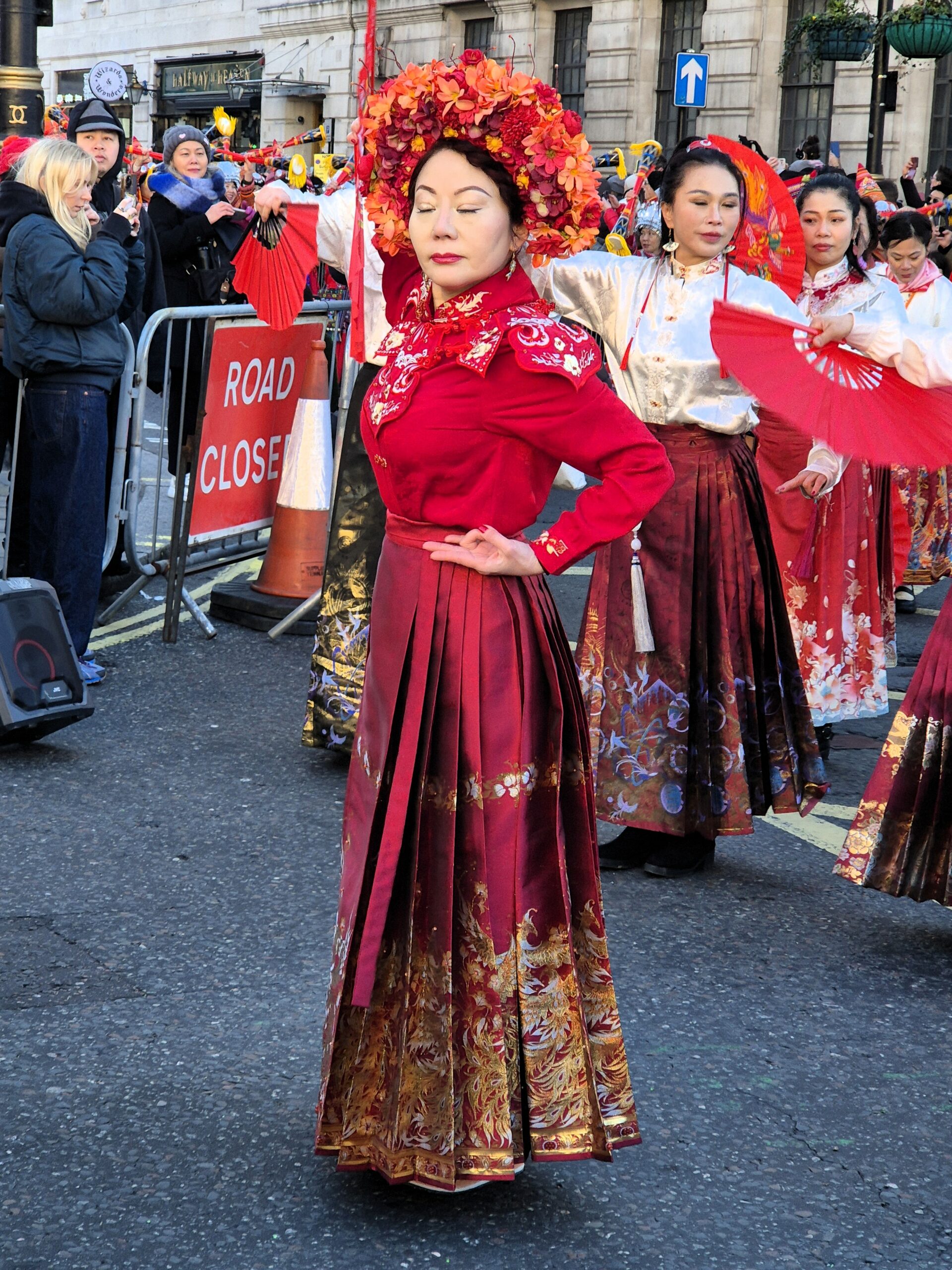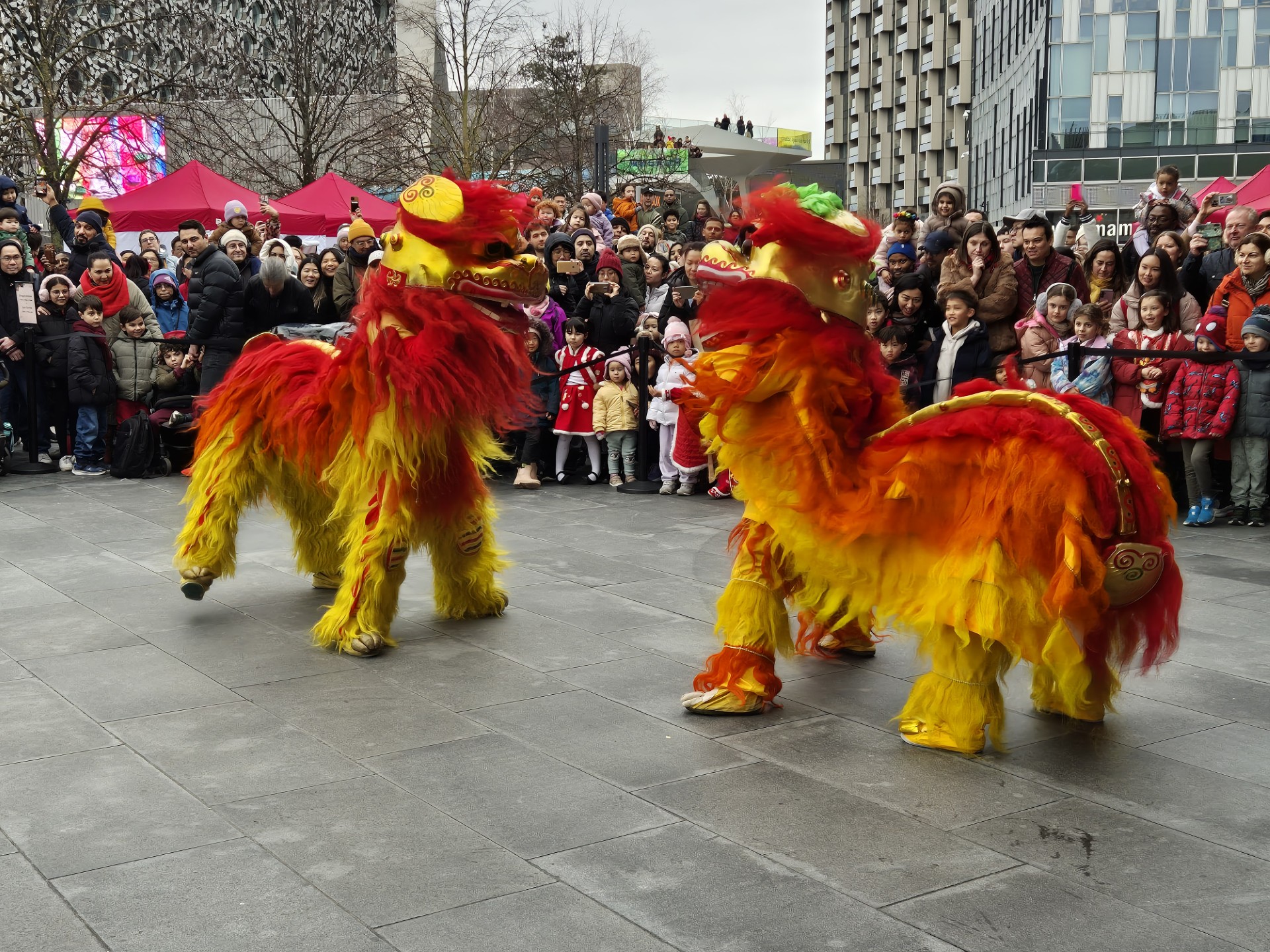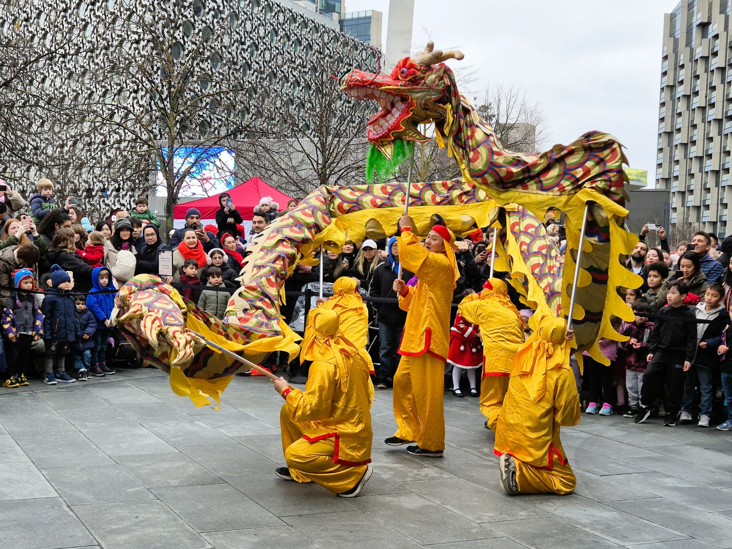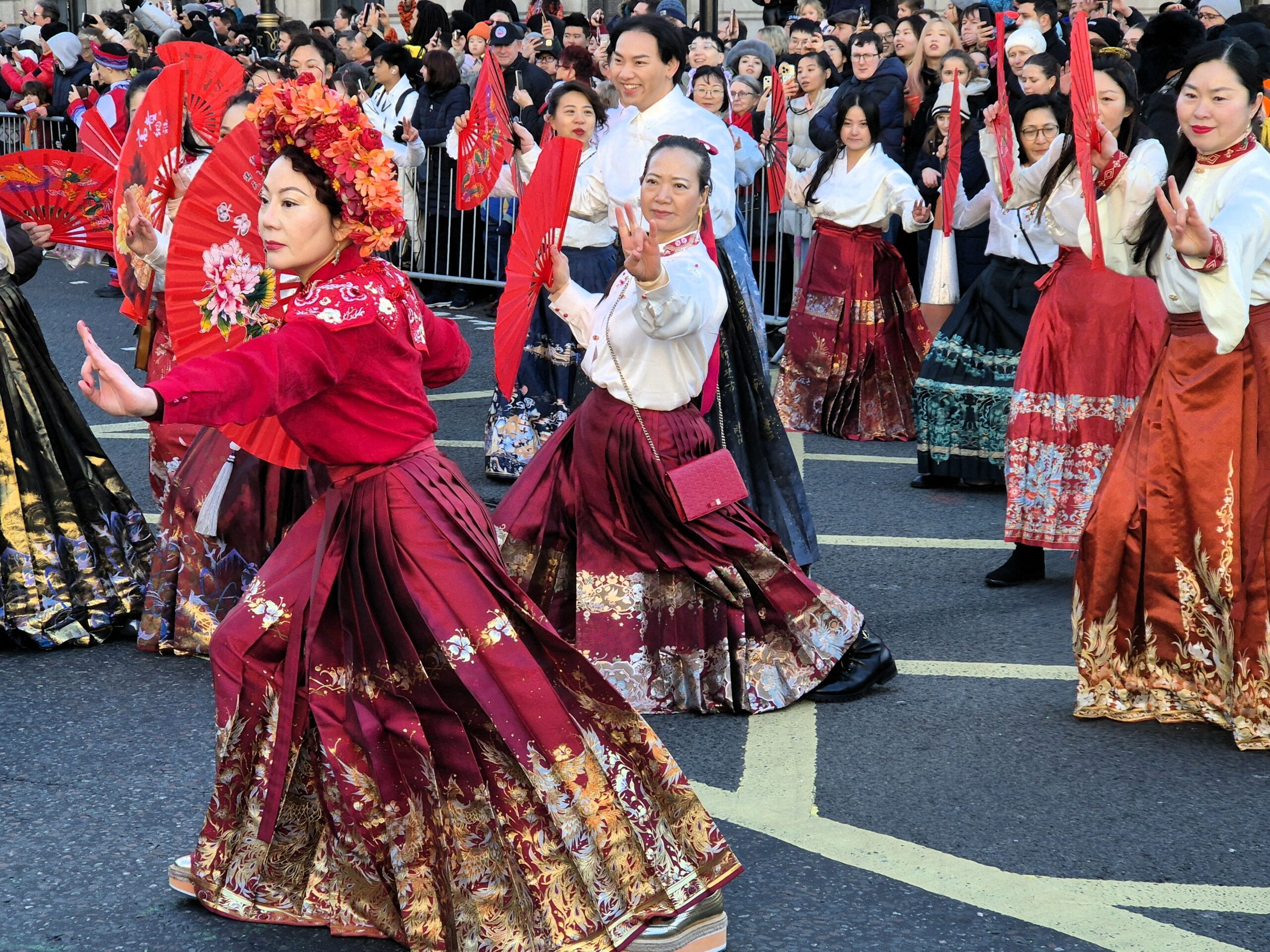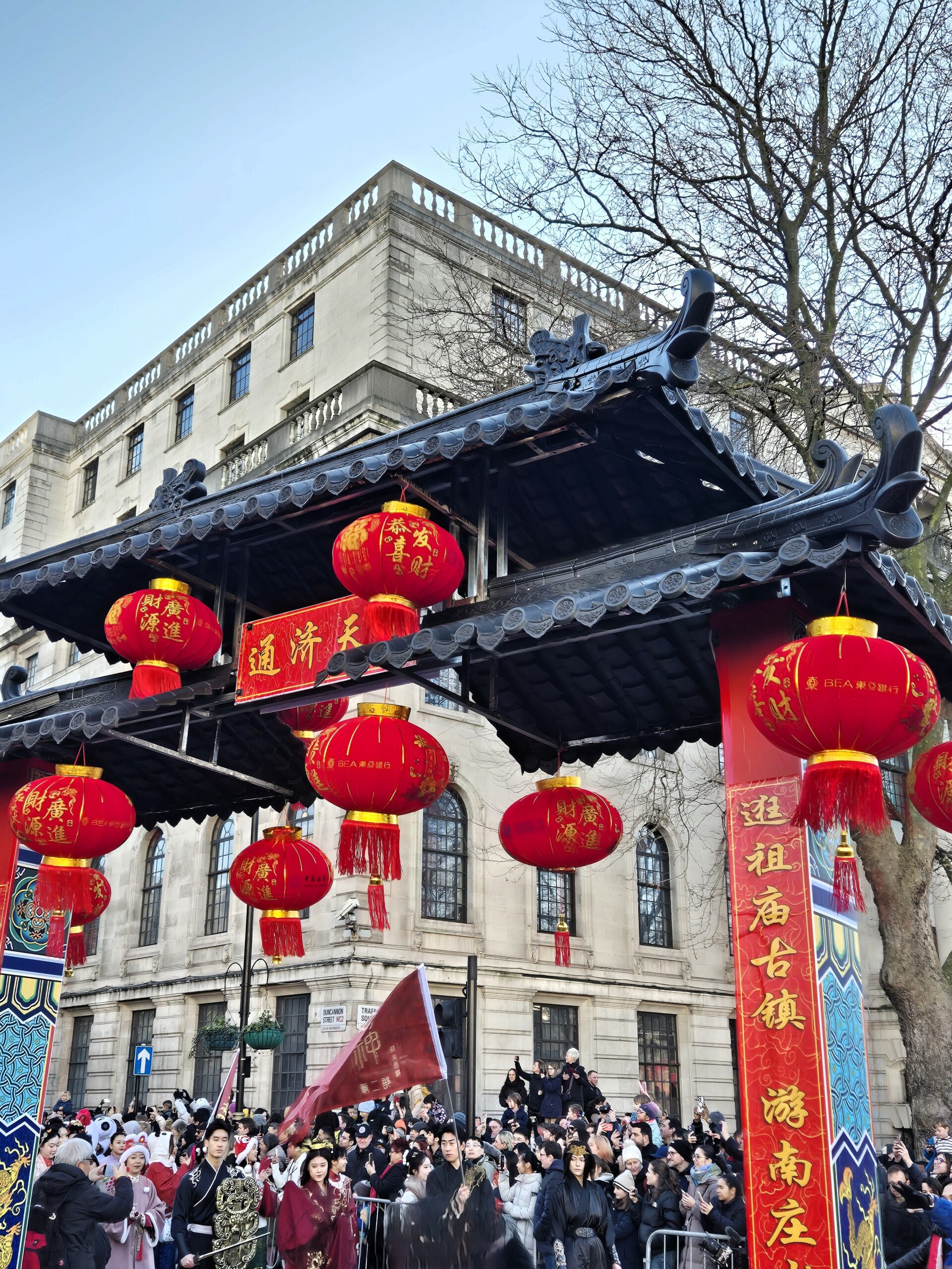 Παρά το γεγονός ότι η θερμοκρασία ξεπερνούσε το μηδέν μόλις κατά έναν βαθμό, ο άστατος λονδρέζικος καιρός μάς έκανε τη χάρη, κρατώντας μακριά τα σύννεφα και τη βροχή και χαρίζοντάς μας μια λαμπερή, ηλιόλουστη -αν και παγωμένη- Κυριακή. Το πλήθος, από τις εννιά το πρωί έως τις δέκα, είχε ήδη κατακλύσει την περίμετρο της μεγάλης πλατείας, τα σκαλιά της εκκλησίας St Martin in the Fields -της οποίας η καμπάνα δεν έπαψε να ηχεί χαρούμενα- και απλωνόταν έως το Cambridge Circus, όπου θα γινόταν η στάση για το πρώτο χορευτικό νούμερο. Όσο δε κατέφθαναν τα άρματα, τόσο ο ενθουσιασμός μεγάλωνε, και οι χάρτινοι δράκοι ή τα λούτρινα χρυσοκόκκινα φίδια, που πωλούνταν στους πάγκους της Chinatown, ανέμιζαν χαρούμενα στα χέρια των παιδιών.