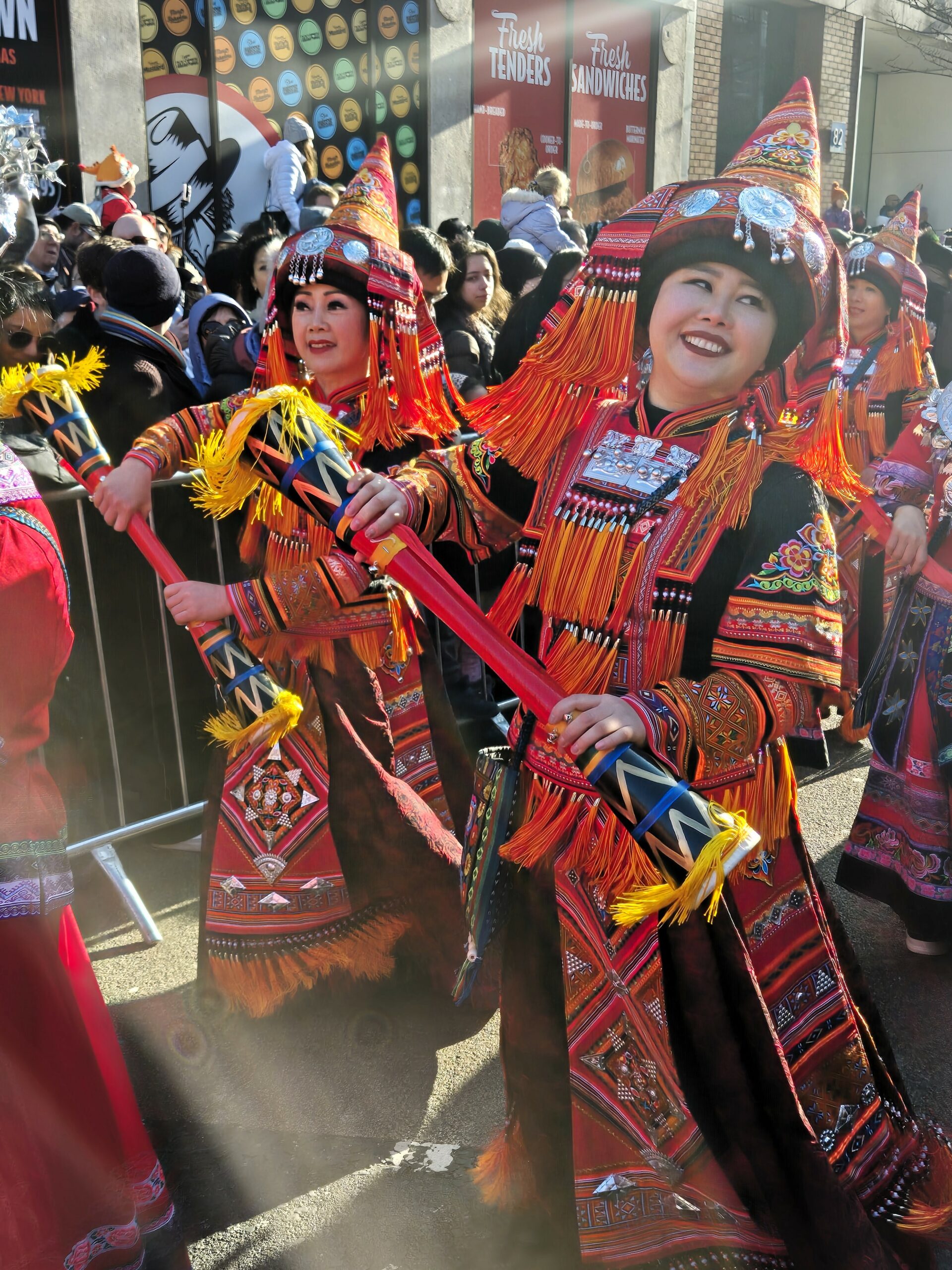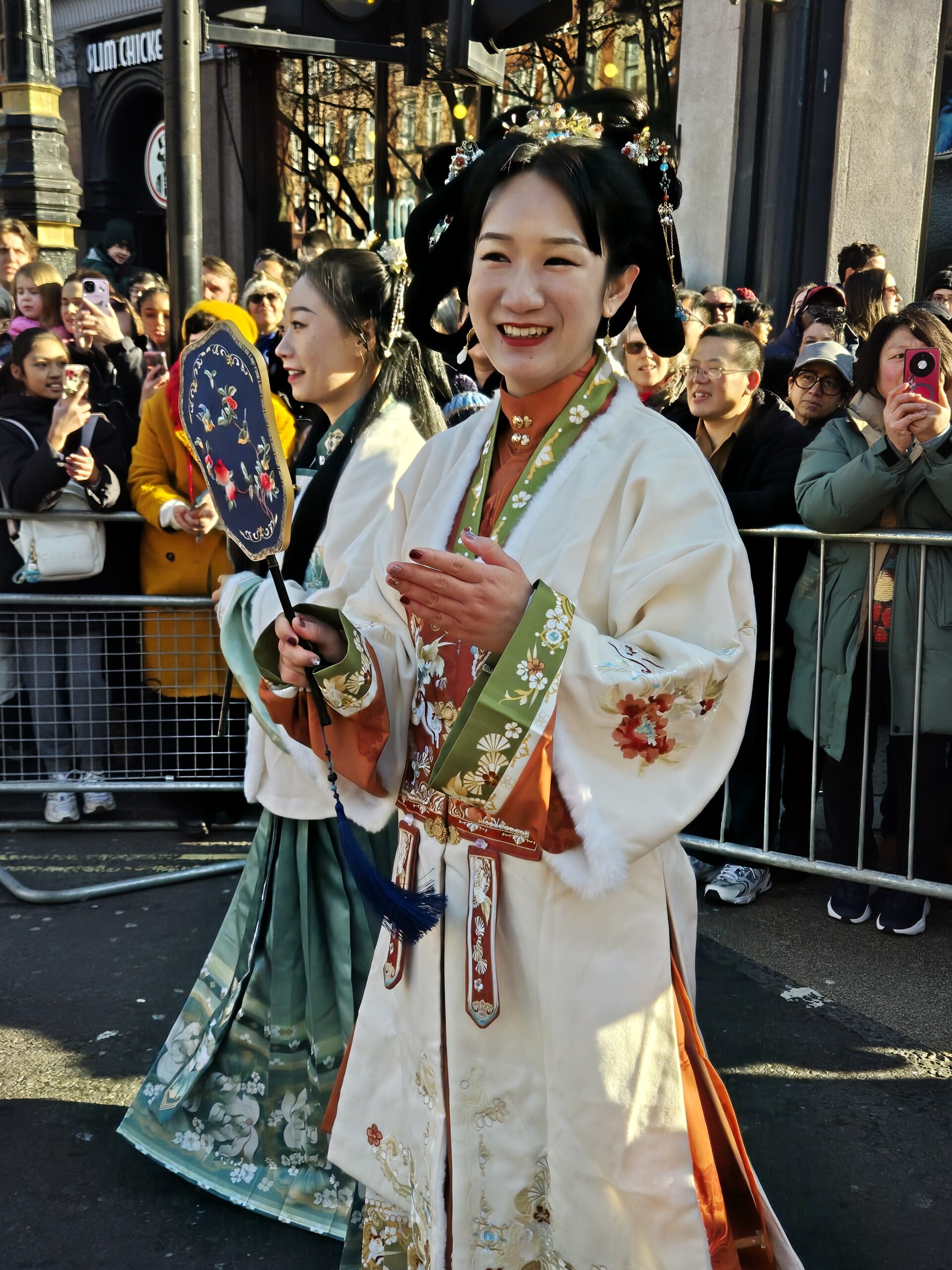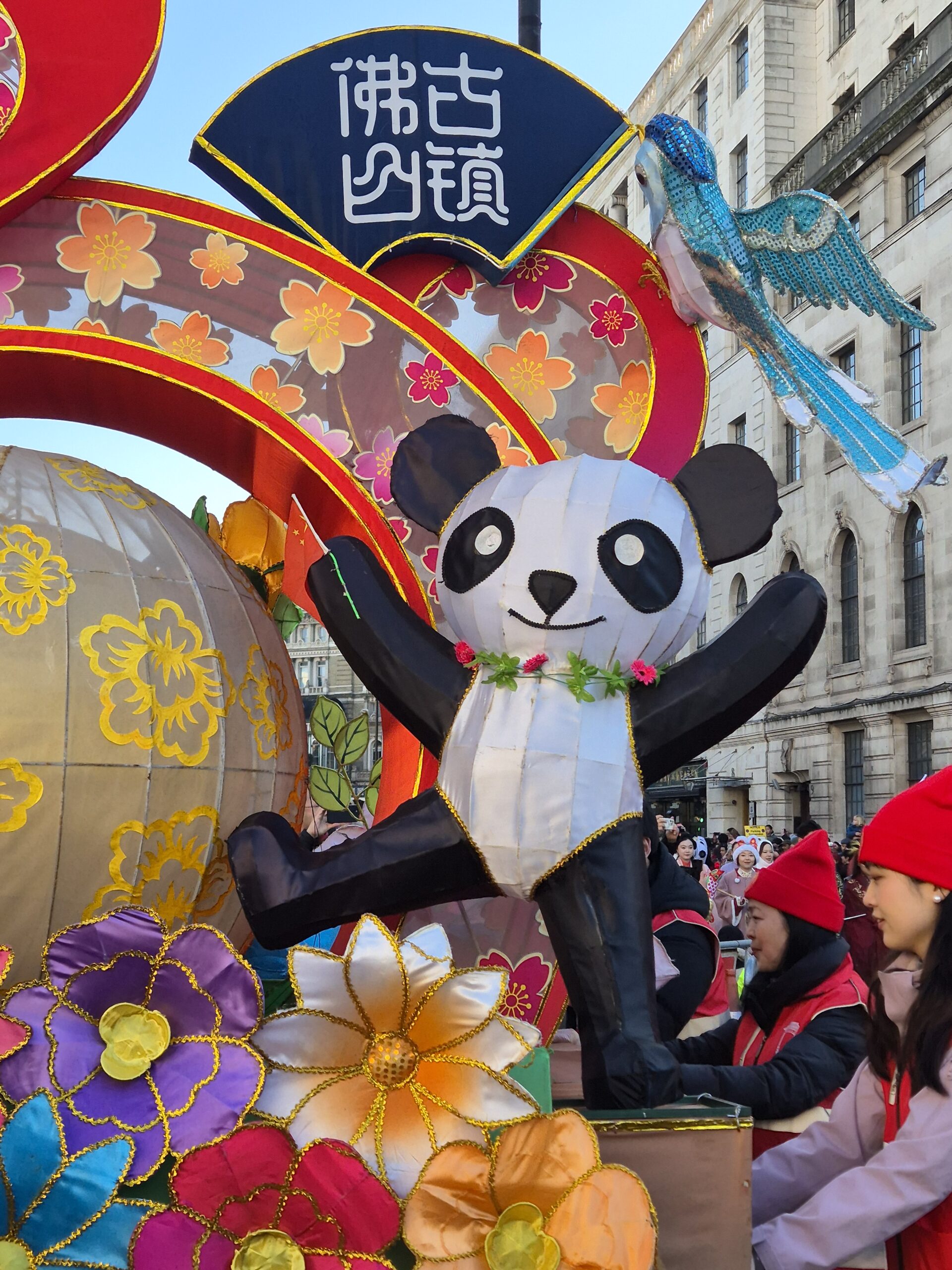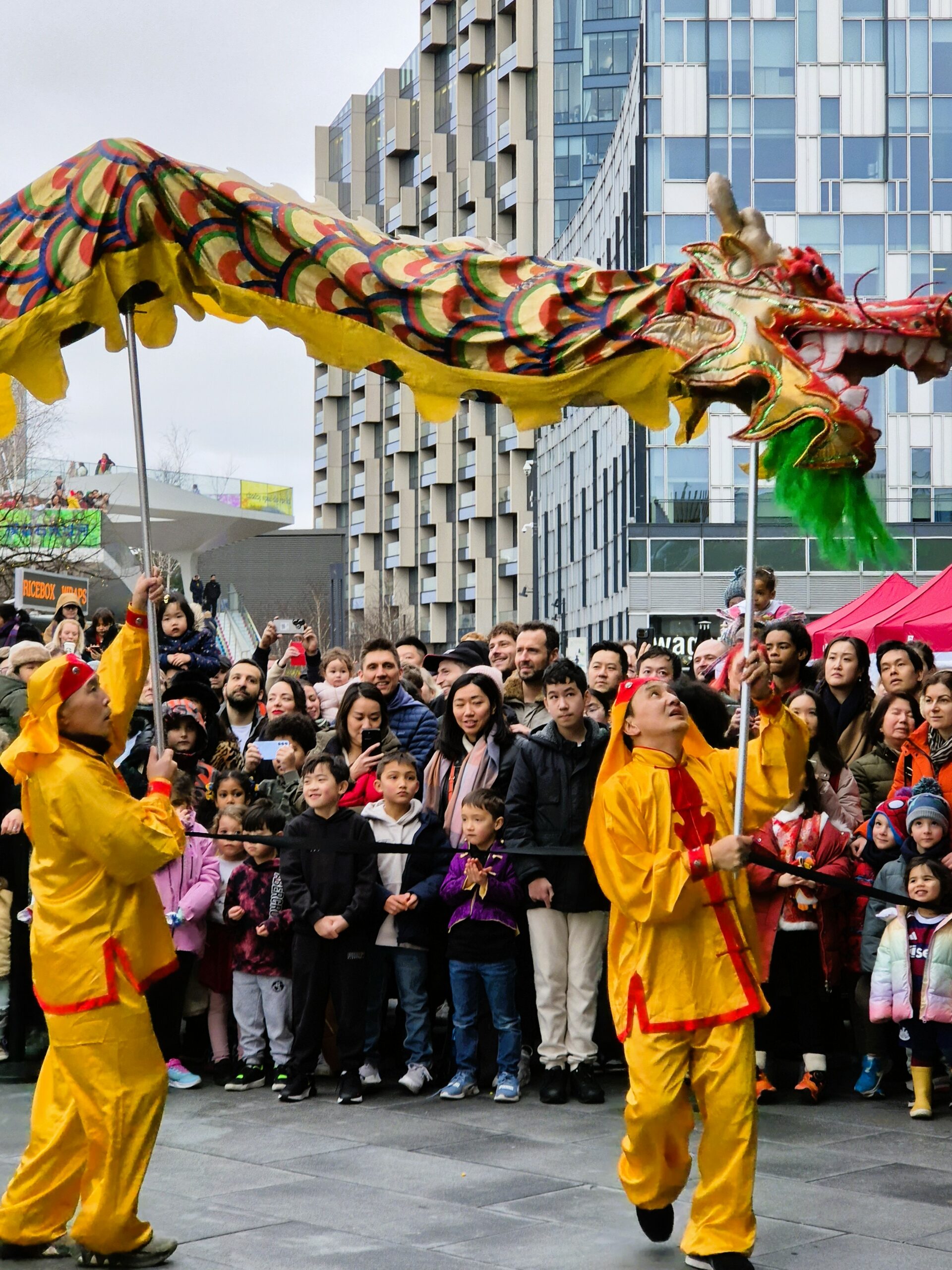 Παρά το γεγονός ότι η θερμοκρασία ξεπερνούσε το μηδέν μόλις κατά έναν βαθμό, ο άστατος λονδρέζικος καιρός μάς έκανε τη χάρη, κρατώντας μακριά τα σύννεφα και τη βροχή και χαρίζοντάς μας μια λαμπερή, ηλιόλουστη -αν και παγωμένη- Κυριακή. Το πλήθος, από τις εννιά το πρωί έως τις δέκα, είχε ήδη κατακλύσει την περίμετρο της μεγάλης πλατείας, τα σκαλιά της εκκλησίας St Martin in the Fields -της οποίας η καμπάνα δεν έπαψε να ηχεί χαρούμενα- και απλωνόταν έως το Cambridge Circus, όπου θα γινόταν η στάση για το πρώτο χορευτικό νούμερο. Όσο δε κατέφθαναν τα άρματα, τόσο ο ενθουσιασμός μεγάλωνε, και οι χάρτινοι δράκοι ή τα λούτρινα χρυσοκόκκινα φίδια, που πωλούνταν στους πάγκους της Chinatown, ανέμιζαν χαρούμενα στα χέρια των παιδιών.