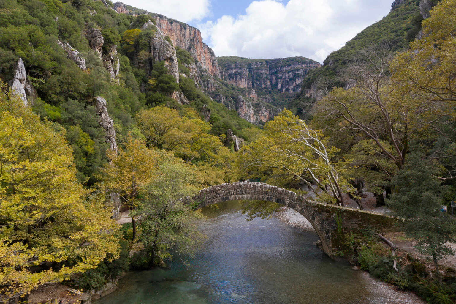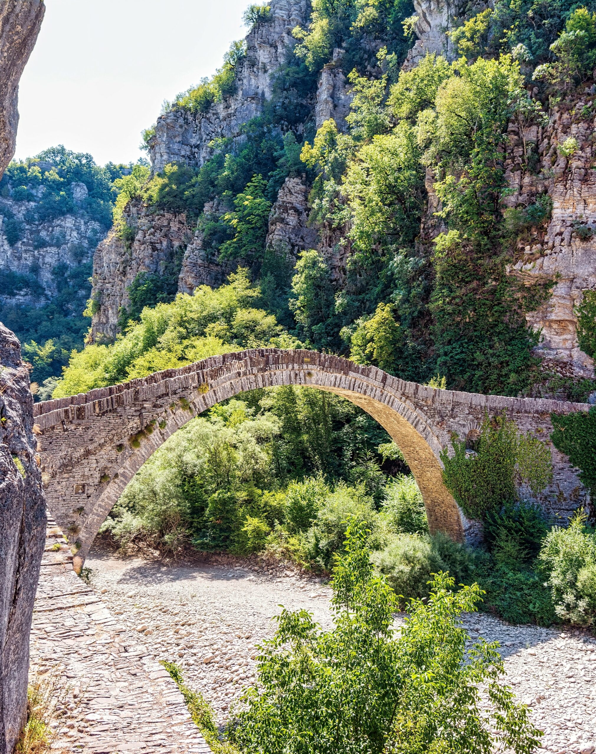 Η ευρύτερη περιοχή της Τύμφης κοσμείται από πολυάριθμα πέτρινα γεφύρια, που μπορεί σήμερα να αποτελούν αξιοθέατα, στο παρελθόν όμως υπήρξαν εξαιρετικά σημαντικές και λειτουργικές κατασκευές. Πρώτο στη λίστα έρχεται το ξακουστό γεφύρι της Κόνιτσας, που στεφανώνει τον ποταμό Αώο. Πρόκειται για ένα μονότοξο γεφύρι με άνοιγμα που φτάνει τα 36 μέτρα και ύψος τα 20 μέτρα· θεωρείται, μάλιστα, το μεγαλύτερο του είδους του στα Βαλκάνια. Η θέα προς το φαράγγι του Αώου, καθώς στέκεστε στη μέση του, είναι μοναδική. Χτίστηκε το 1871 από τον τεχνίτη Ζιώγα Φρόντζο, από την Πυρσόγιαννη, με τη βοήθεια ακόμη πενήντα εξαιρετικών μαστόρων. Αν προσέξετε λίγο καλύτερα, θα δείτε να κρέμεται ένα καμπανάκι στην καμάρα του· αυτό χρησίμευε ως προειδοποίηση για την ένταση του ανέμου, ώστε οι διαβάτες να γνωρίζουν αν ήταν ασφαλές να περάσουν τη γέφυρα.
