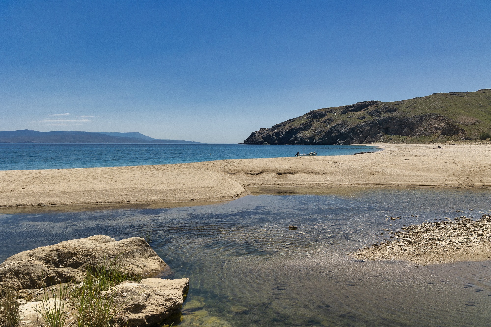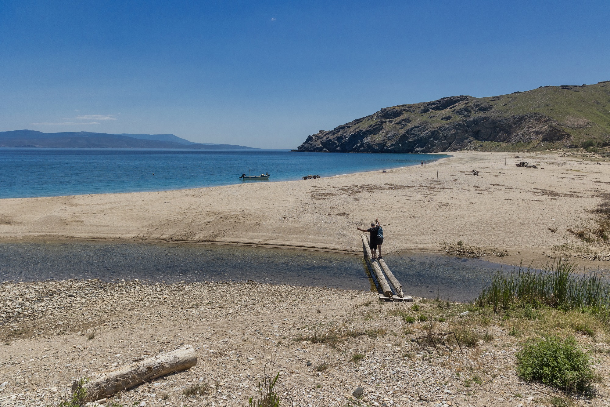 Το τοπίο γίνεται υπέροχο λόγω του ποταμού που εκβάλλει εδώ, ρίχνοντας τα δροσερά, καθαρά νερά του στη θάλασσα. Ομπρέλες και ξαπλώστρες δεν υπάρχουν, αλλά το καλοκαίρι θα δείτε πολλές σκηνές. Αίσθηση ελευθερίας και, γενικά, μια κατάσταση για λίγους –ιδιαίτερα όταν φυσά μελτέμι.