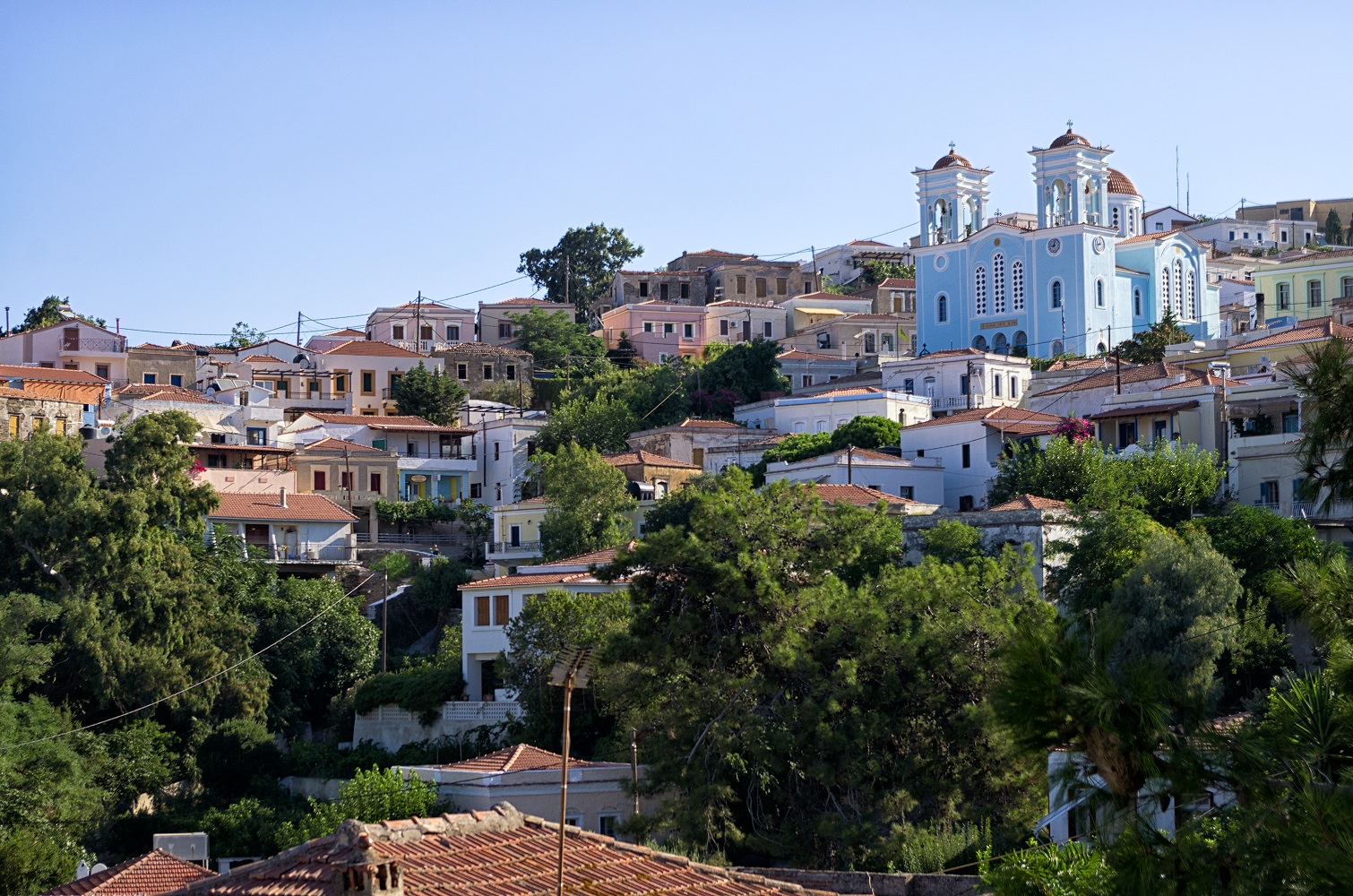 Το νησί είναι μικρό, περίπου 17 τετ. χλμ. όλα και όλα αλλά είναι πανέμορφο. Πριν την είσοδο στο λιμάνι στα αριστερά κοντά στη νησίδα Άγιος Παντελεήμονας σας καλωσορίζει το άγαλμα μιας χάλκινης εστεμμένης γοργόνας πάνω σε ένα βράχο – σύμβολο της αιώνιας συντροφιάς των ναυτικών – η οποία κρατά στο ένα της χέρι ένα ιστιοφόρο πλοίο, έργο της χιώτικης καταγωγής γλύπτριας Μαρίας Παπακωνσταντίνου. Αν σηκώσετε το βλέμμα σας θα δείτε τον οικισμό να απλώνεται σε μια σειρά από μικρούς λόφους. Τα σπίτια είναι ανάμεικτα, μεγαλοπρεπή καπετανόσπιτα, όμορφα νεοκλασικά σε λευκούς και μπεζ τόνους και ταπεινά πέτρινα που μαρτυρούν την πορεία του νησιού στο χρόνο. Το σεργιάνι στα πλακόστρωτα στενά με τις μικρές καμάρες και τις γάτες να κοιμούνται νωχελικά στα σκαλοπάτια των σπιτιών είναι ότι καλύτερο για χαλάρωση μετά τις παραλίες.