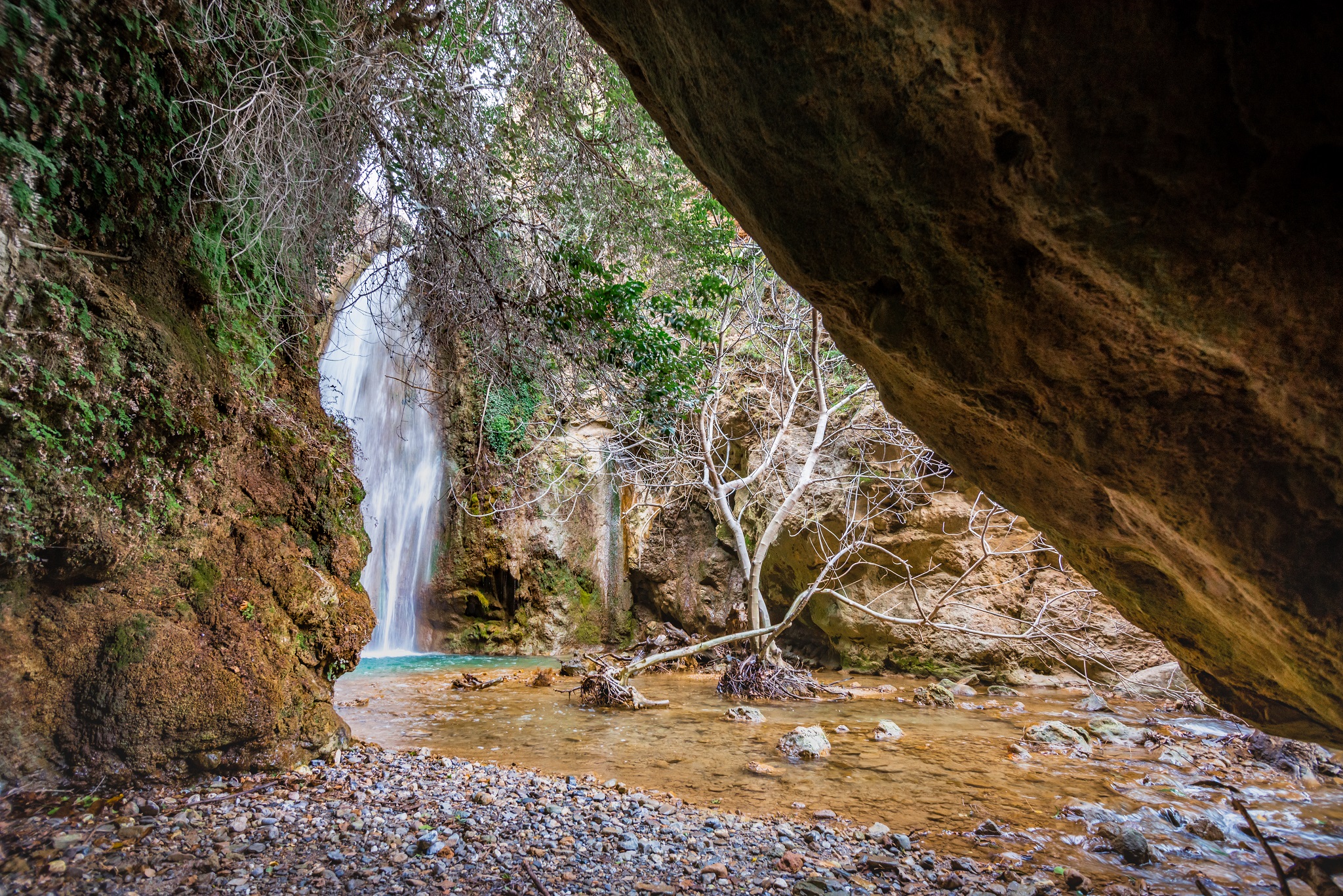 Όσον αφορά τα νερά, τώρα, πηγάζουν από το οροπέδιο Αμπέλια, στα ψηλά του γειτονικού βουνού Θρυπτή, διασχίζουν ειδυλλιακά την κεντρική πλατεία του Ορεινού και εισχωρούν έπειτα στο φαράγγι. Εκεί, πλέον, δημιουργούνται και κάποιοι εντυπωσιακοί καταρράκτες (ένας, για παράδειγμα, γκρεμίζεται από ύψος 15 μέτρων), μαζί με λιμνούλες όπου αντανακλάται το τριγύρω πράσινο της βλάστησης (οι Ορεινιώτες τις αποκαλούν «κολύμπες» ή και «βρόντες»). Ειδικά οι τελευταίοι τρεις καταρράκτες, προς την περιοχή Περιστεριώνας, θεωρούνται από τους ομορφότερους στην Κρήτη, τουλάχιστον από όσους τους έχουν γνωρίσει. Πέρα από τέτοια φυσικά αξιοθέατα, στη διαδρομή θα συναντήσετε και δύο (κλειδωμένα, πλέον) εκκλησάκια: είναι αφιερωμένα στον Αφέντη Χριστό και στον Άγιο Δημήτριο και στέκονται εκεί ήδη από τα βυζαντινά χρόνια στην Κρήτη.