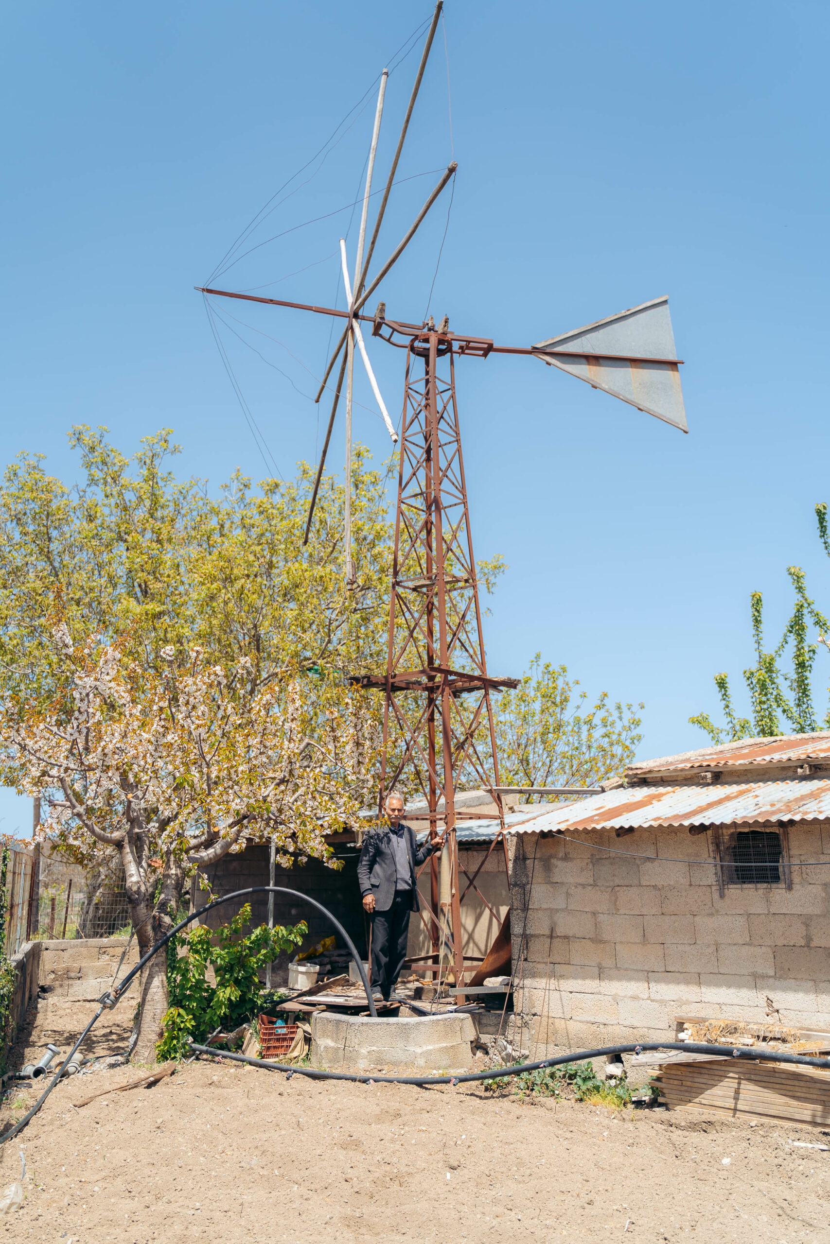 «Σε δύο λεπτά θα είμαι εκεί» μας είπε, και πράγματι δεν προλάβαμε να φτάσουμε καλά – καλά και ήρθε με το αγροτικό αυτοκίνητό του. «Είχα πεταχτεί να δω ένα μηχάνημα», θα μας πει, ενώ ταυτόχρονα βγάζει ποτήρια για να μας κεράσει μία ρακή. Του ζητάμε να τον φωτογραφήσουμε σε έναν ανεμόμυλο που έχει στην αυλή και είναι έτοιμος να σκαρφαλώσει στην κορυφή. «Εννοούσαμε να στέκεστε δίπλα στον ανεμόμυλο, δεν χρειάζεται να ανέβετε», του απαντά η Αμαλία, αλλά αυτή του η εγρήγορση μας δείχνει την άνεσή του να σκαρφαλώσει. Τον αποχαιρετούμε και ξέρουμε ότι είναι ο τελευταίος ενεργός μάστορας, ο τελευταίος που ξέρει τόσο καλά να επισκευάζει αυτούς τους ανεμόμυλους. Θα τα ξαναπούμε σύντομα.