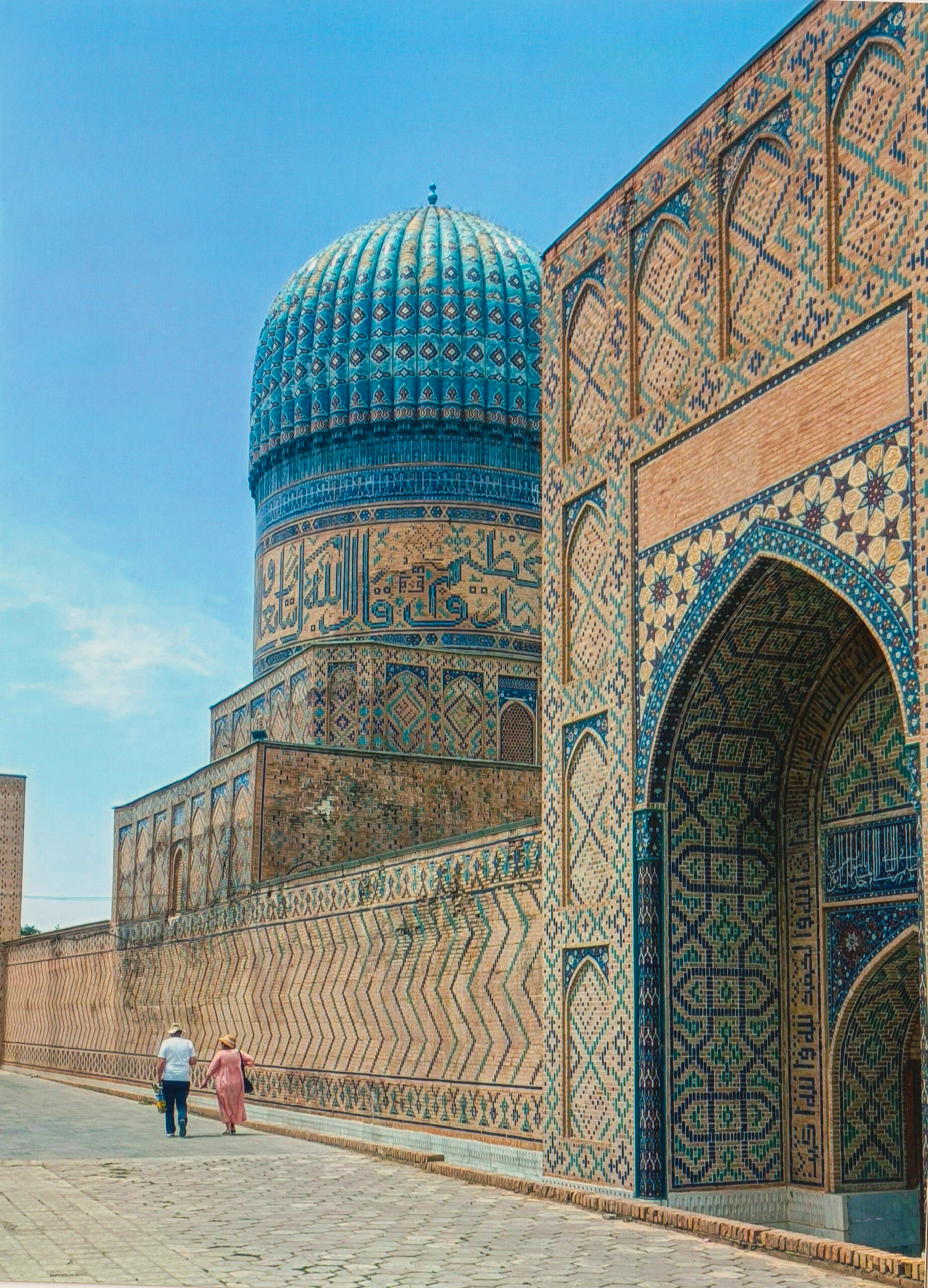 Βγαίνουμε από την πλατεία και ακολουθούμε τον πεζόδρομο που συνδέει την πλατεία με το Τέμενος της Μπιμπί Χανούμ που χρίστηκε το 1404 προς τιμήν της αγαπημένης συζύγου του Ταμερλάνου. Δίπλα βρίσκεται το παζάρι Σιάμπ. Συνεχίζουμε στο μεγαλοπρεπές μαυσωλείο Γκουρ Εμίρ. Εδώ, βρίσκεται ο τάφος του Ταμερλάνου, όπως επίσης και το μέρος ανάπαυσης για τους γιους του και τους εγγονούς του. Το δε κτίριο με το σμαραγδί τρούλο αποτέλεσε πρότυπο για το Ταζ Μαχάλ. Στο βορειοανατολικό τμήμα της Σαμαρκάνδης βρίσκεται η νεκρόπολη Σαχ-ι-Ζίντα που αποτελείται από μια σειρά εκλεπτυσμένων τάφων με λαμπερά χρώματα.